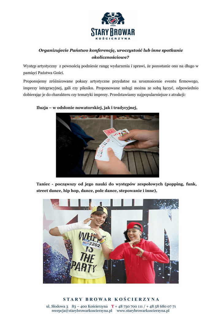 Organizujecie Państwo konferencję, uroczystość lub inne spotkanie okolicznościowe? Występ artystyczny z pewnością podniesie rangę wydarzenia i sprawi, że pozostanie ono na długo w pamięci Państwa Gości. Proponujemy zróżnicowane pokazy artystyczne przydatne na urozmaicenie eventu firmowego, imprezy integracyjnej, gali czy pikniku. Proponowane usługi można ze sobą łączyć, odpowiednio dobierając je do charakteru czy tematyki imprezy. Przedstawiamy najpopularniejsze z atrakcji: Iluzja – w odsłonie nowatorskiej, jak i tradycyjnej, Taniec - począwszy od jego nauki do występów zespołowych (popping, funk, street dance, hip hop, dance, pole dance, stepowanie i inne), S TA R Y B R O WA R K O Ś C I E R Z Y N A ul. Słodowa 3 83 – 400 Kościerzyna T + 48 730 700 111 / + 48 58 680 07 71 [email protected] www.starybrowarkoscierzyna.pl Muzyka – występy solowe, zespołowe, warsztaty muzyczne, pokazy chóru oraz musicale, koncerty, Teatr – dowolne repertuary dostosowane do potrzeb Klienta, występy stand – up, kabarety, Występy artystów ludowych, jak: kapele kaszubskie, gawędziarze, S TA R Y B R O WA R K O Ś C I E R Z Y N A ul. Słodowa 3 83 – 400 Kościerzyna T + 48 730 700 111 / + 48 58 680 07 71 [email protected] www.starybrowarkoscierzyna.pl Konferansjerzy – osoby z dużym doświadczeniem, które poprowadzą imprezę od początku do końca w bardzo dobrym smaku, Pokazy zapierające dech w piersi: sztuka ognia, gimnastyka akrobatyczna i inne, Sztuka powstaje z głównym założeniem dzielenia się nią z innymi, co czynimy również My – Hotel Browar Kościerzyna, oferując niniejsze oprawy artystyczne nie tylko naszym Gościom grupowym, ale również wychodzimy z nimi na zewnątrz. Jeżeli zastanawiasz się, które atrakcje będą właściwe na Twoją imprezę, bądź nie znalazłeś propozycji odpowiedniej dla siebie – napisz do Nas ! Współpracujemy z wieloma artystami i jesteśmy profesjonalistami w swojej branży – doradzimy i przygotujemy najlepszą ofertę. Kontakt: Kinga Peplińska – Specjalista ds sprzedaży i marketingu, tel. 790 792 710, e-mail: [email protected] S TA R Y B R O WA R K O Ś C I E R Z Y N A ul. Słodowa 3 83 – 400 Kościerzyna T + 48 730 700 111 / + 48 58 680 07 71 [email protected] www.starybrowarkoscierzyna.pl