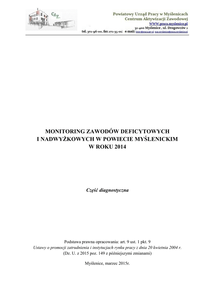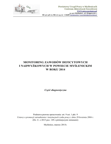 MONITORING ZAWODÓW DEFICYTOWYCH I NADWYŻKOWYCH W POWIECIE MYŚLENICKIM W ROKU 2014 Część diagnostyczna Podstawa prawna opracowania: art. 9 ust. 1 pkt. 9 Ustawy o promocji zatrudnienia i instytucjach rynku pracy z dnia 20 kwietnia 2004 r. (Dz. U. z 2015 poz. 149 z późniejszymi zmianami) Myślenice, marzec 2015r. Spis treści I. WSTĘP ................................................................................................................................... 3 1. Cel opracowania raportu .................................................................................................... 3 2. Podstawa opracowania: ...................................................................................................... 3 3. Metodologia opracowania .................................................................................................. 4 II. ANALIZA BEZROBOCIA WG ZAWODÓW (GRUP ZAWODÓW) ................................ 7 III. ANALIZA OFERT PRACY WG ZAWODÓW (GRUP ZAWODÓW) ........................... 12 IV. ANALIZA ZAWODÓW DEFICYTOWYCH I NADWYŻKOWYCH ........................... 15 1. Ranking zawodów deficytowych ..................................................................................... 16 2. Zawody zrównoważone.................................................................................................... 19 3. Ranking zawodów nadwyżkowych .................................................................................. 20 4. Pozostałe rankingi ............................................................................................................ 22 V. WNIOSKI ............................................................................................................................ 24 Spis tabel Tabela 1: Powiązanie między poziomem kompetencji wg ISCO-08 a poziomem kształcenia wg ISCED 2011 ......................................................................................................................... 5 Tabela 2: Struktura grup wielkich klasyfikacji i poziomy kwalifikacji ..................................... 6 Tabela 3: Bezrobotni według rodzaju działalności ostatniego miejsca pracy w 2014r. wg PKD .................................................................................................................................................... 8 Tabela 4: Struktura bezrobotnych wg grup zawodowych w powiecie myślenickim – w ujęciu procentowym .............................................................................................................................. 8 Tabela 5: Zawody najliczniej reprezentowane wśród bezrobotnych w powiecie myślenickim .................................................................................................................................................. 10 Tabela 6: Napływ bezrobotnych wg zawodów w powiecie myślenickim – najliczniej reprezentowane zawody ........................................................................................................... 10 Tabela 7: Oferty pracy w 2014r. wg PKD ............................................................................... 12 Tabela 8: Struktura ofert pracy wg grup zawodowych w powiecie myślenickim – w ujęciu procentowym ............................................................................................................................ 13 Tabela 9: Oferty pracy najczęściej zgłaszane przez pracodawców .......................................... 14 Tabela 10: Zawody deficytowe – wskaźnik intensywności nadwyżki (deficytu) zawodów – MAX......................................................................................................................................... 17 Tabela 11: Zawody deficytowe – wskaźnik intensywności nadwyżki (deficytu) zawodów większy od 1,1 .......................................................................................................................... 17 Tabela 12: Zawody zrównoważone – wskaźnik intensywności nadwyżki (deficytu) zawodów od 0,9 do 1,1 ............................................................................................................................. 19 Tabela 13: Zawody nadwyżkowe – wskaźnik intensywności nadwyżki (deficytu) zawodów – „0” ............................................................................................................................................ 20 Tabela 14: Zawody nadwyżkowe – wskaźnik intensywności nadwyżki (deficytu) zawodów mniejszy od 0,9 ........................................................................................................................ 21 Tabela 15: Ranking grup zawodów zgłoszonych w ofertach pracy ze względu na wskaźnik szansy uzyskania oferty ............................................................................................................ 22 Tabela 16: Grupy zawodów wg wskaźnika długotrwałego bezrobocia ................................... 23 Strona 2 z 25 I. WSTĘP Bezrobocie jest jednym z najistotniejszych problemów gospodarczych, społecznych i politycznych. Podejmowanie skutecznych rozwiązań zmierzających do poprawy sytuacji na rynku pracy uzależnione jest od prawidłowego rozpoznania lokalnych uwarunkowań poprzez ciągłe poddawanie analizie wielkości opisujących zjawisko bezrobocia. Jednym z opracowań służącym temu celowi jest Monitoring zawodów deficytowych i nadwyżkowych. W przedstawionym zestawieniu wskazano zawody, na które występuje zapotrzebowanie na rynku pracy powiatu myślenickiego oraz zawody, na które popyt nie istnieje. 1. Cel opracowania raportu Informacje o liczbie bezrobotnych i ofertach pracy według klasyfikacji zawodów posłużą, jako źródło informacji do: Sporządzenia analizy potrzeb szkoleniowych, która pozwoli określić kierunki szkoleń i przygotowania zawodowego, realizowanych w ramach usług szkoleniowych w PUP w Myślenicach. zaplanowania aktywnych form przeciwdzia