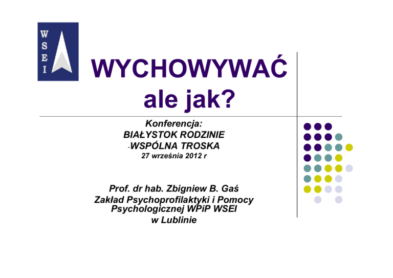 WYCHOWYWAĆ ale jak? Konferencja: BIAŁYSTOK RODZINIE -WSPÓLNA TROSKA 27 września 2012 r Prof. dr hab. Zbigniew B. Gaś Zakład Psychoprofilaktyki i Pomocy Psychologicznej WPiP WSEI w Lublinie Kontrowersje wokół wychowania „Trzeba jasno zdać sobie sprawę z tego, co to jest WYCHOWANIE i jak należy je przeprowadzać, bo obecnie panuje pod tym względem rozbieżność poglądów” Arystoteles (384-322 p.n.e.) Opr. Z. B. Gaś – wszelkie prawa zastrzeżone 2/25 Pytania kluczowe 1. 2. 3. 4. 5. CO TO jest wychowanie? CZY należy wychowywać? KTO powinien wychowywać? KIEDY powinno się wychowywać? JAK wychowywać? Opr. Z. B. Gaś – wszelkie prawa zastrzeżone 3/25 Wychowanie • • • to proces wspomagania wychowanka w rozwoju, ukierunkowanym na osiąganie pełnej dojrzałości w czterech podstawowych sferach: fizycznej, psychicznej, społecznej i duchowej. Tak rozumiany kontakt wychowawczy: angażuje dwie osoby: wychowawcę (gł. rodzica, ale także: nauczyciela, duszpasterza, sąsiada, starszego kolegę) oraz wychowanka (dziecko w różnym wieku), pozostające w osobowej relacji, współdziałające w osiąganiu celów wychowawczych. Opr. Z. B. Gaś – wszelkie prawa zastrzeżone 4/25 Struktura celów wychowania Dojrzałość duchowa Dojrzałość społeczna Dojrzałość psychiczna Dojrzałość fizyczna Opr. Z. B. Gaś – wszelkie prawa zastrzeżone 5/25 Wartości chrześcijańskie jako drogowskazy wychowania godność osoby świętość życia ludzkiego centralna rola rodziny opartej na małżeństwie znaczenie wykształcenia wolność myśli, słowa wolność głoszenia własnych poglądów wolność wyznawania religii ochrona prawna jednostek i grup współpraca wszystkich na rzecz wspólnego dobra praca pojmowana jako dobro osobiste i społeczne władza polityczna pojmowana jako służba, podporządkowana prawu i rozumowi, a ograniczona przez prawa osoby i narodów (Jan Paweł II: Wartości chrześcijańskie duchowym fundamentem Europy) Opr. Z. B. Gaś – wszelkie prawa zastrzeżone 6/25 Rodzina jako podstawowe środowisko wychowawcze RODZINA to: duchowe zjednoczenie szczupłego grona osób, skupionych we wspólnym ognisku domowym aktami wzajemnej pomocy i opieki, oparte na wierze w prawdziwą lub domniemaną łączność biologiczną, tradycję rodzinną i społeczną (F. Adamski, 1984) Opr. Z. B. Gaś – wszelkie prawa zastrzeżone 7/25 Wybrane zagrożenia dla świata wartości dziecka • • • redefinicja wartości np. WOLNOŚĆ -> samowola DOBRO/ZŁO -> mniejsze zło OTWARTOŚĆ -> bezkrytycyzm TOLERANCJA -> pobłażanie oraz akceptacja dysfunkcji i patologii POSZANOWANIE ŻYCIA -> aborcja, eutanazja, in vitro eliminowanie niektórych wartości np. TRADYCJA -> nowoczesność RODZINA -> związek partnerski, samotny rodzic, bycie singlem PATRIOTYZM -> europejskość NARÓD -> obywatel ograniczanie roli/eliminowanie/zwalczanie religijności i wprowadzanie laickości Opr. Z. B. Gaś – wszelkie prawa zastrzeżone 8/25 Zagrożenia dla wychowania tkwiące w rodzinie • • • • • • • niesprawność naturalnych wychowawców kryzys tradycyjnych wartości wadliwe wzorce ról rodzinnych rozpad więzi rodzinnych przemiany strukturalne rodziny ograniczanie liczby dzieci w rodzinie odejście od doskonalenia siebie do usuwania zewnętrznych trudności Opr. Z. B. Gaś – wszelkie prawa zastrzeżone 9/25 Wartości Wartości to wszystko to: co uchodzi za ważne i cenne dla jednostki i społeczeństwa jest godne pożądania, łączy się z pozytywnymi przeżyciami stanowi jednocześnie cel dążeń ludzkich. Wartości obejmują więc zarówno elementy świata materialnego, jak i duchowego. Opr. Z. B. Gaś – wszelkie prawa zastrzeżone 10/25 Normy to powinności, nakazy i zakazy wskazujące sposoby i metody realizowania nadrzędnych wartości. Ze względu na realizowane wartości normy można podzielić na: teologiczne – gdzie nadrzędną wartością jest DOBRO, czyli wszelkie działania człowieka określa obowiązek czynienia dobra formalne – gdzie nadrzędną wartością jest OBOWIĄZEK, czyli właściwe działanie to bezwzględne realizowanie nakazów obowiązku Normy są podstawowym spoiwem każdej wspólnoty ludzkiej, porządkują życie społeczne, zapewniają ludziom poczucie bezpieczeństwa Opr. Z. B. Gaś – wszelkie prawa zastrzeżone 11/25 4 kroki wprowadzania wychowanka w świat wartości 1. 2. 3. 4. Rozpoznawanie wartości Rozumienie wartości Akceptowanie wartości Respektowanie wartości Opr. Z. B. Gaś – wszelkie prawa zastrzeżone 12/25 Krok 1 – rozpoznawanie wartości istotą tego kroku jest nabywanie umiejętności rozpoznawania tego, co jest wartością i odróżniania od tego, co nie jest wartością. dokonuje się głównie przez obserwację zachowań osób znaczących, a więc przede wszystkim rodziców, ale także nauczycieli, rówieśników, autorytetów społecznych itp. Opr. Z. B. Gaś – wszelkie prawa zastrzeżone 13/25 Krok 2 – rozumienie wartości istotą tego kroku jest rozumowa analiza istoty danej wartości, z możliwością dokonania bilansu zysków i strat dokonuje się głównie w drodze intelektualnej obróbki własnych doświadczeń i obserwacji świata zewnętrznego Opr. Z. B. Gaś – wszelkie prawa zastrzeżone 14/25 Krok 3 – akceptowanie wartości istotą tego kroku jest przyjęcie, że wartości praktykowane przez innych są szansą na godne życie i uzyskanie poczucia przynależności do grupy dokonuje się głównie w drodze doświadczania wzmocnień zewnętrznych za przyjmowanie wartości obowiązujących w danej grupie społecznej Opr. Z. B. Gaś – wszelkie prawa zastrzeżone 15/25 Krok 4 – respektowanie wartości istotą tego kroku jest przyjęcie wartości jako podstawy norm przestrzeganych we własnym zachowaniu dokonuje się głównie w drodze doświadczania wewnętrznych wzmocnień za prowadzenie osobiście satysfakcjonującego i społecznie akceptowanego stylu życia Opr. Z. B. Gaś – wszel