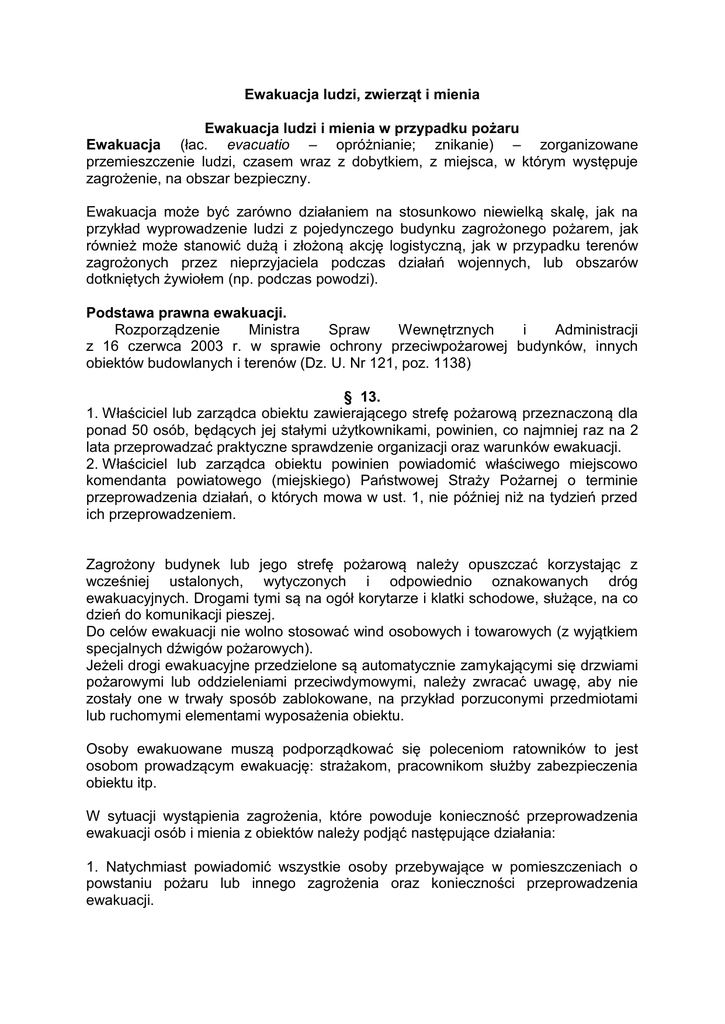 Ewakuacja ludzi, zwierząt i mienia Ewakuacja ludzi i mienia w przypadku pożaru Ewakuacja (łac. evacuatio – opróżnianie; znikanie) – zorganizowane przemieszczenie ludzi, czasem wraz z dobytkiem, z miejsca, w którym występuje zagrożenie, na obszar bezpieczny. Ewakuacja może być zarówno działaniem na stosunkowo niewielką skalę, jak na przykład wyprowadzenie ludzi z pojedynczego budynku zagrożonego pożarem, jak również może stanowić dużą i złożoną akcję logistyczną, jak w przypadku terenów zagrożonych przez nieprzyjaciela podczas działań wojennych, lub obszarów dotkniętych żywiołem (np. podczas powodzi). Podstawa prawna ewakuacji. Rozporządzenie Ministra Spraw Wewnętrznych i Administracji z 16 czerwca 2003 r. w sprawie ochrony przeciwpożarowej budynków, innych obiektów budowlanych i terenów (Dz. U. Nr 121, poz. 1138) § 13. 1. Właściciel lub zarządca obiektu zawierającego strefę pożarową przeznaczoną dla ponad 50 osób, będących jej stałymi użytkownikami, powinien, co najmniej raz na 2 lata przeprowadzać praktyczne sprawdzenie organizacji oraz warunków ewakuacji. 2. Właściciel lub zarządca obiektu powinien powiadomić właściwego miejscowo komendanta powiatowego (miejskiego) Państwowej Straży Pożarnej o terminie przeprowadzenia działań, o których mowa w ust. 1, nie później niż na tydzień przed ich przeprowadzeniem. Zagrożony budynek lub jego strefę pożarową należy opuszczać korzystając z wcześniej ustalonych, wytyczonych i odpowiednio oznakowanych dróg ewakuacyjnych. Drogami tymi są na ogół korytarze i klatki schodowe, służące, na co dzień do komunikacji pieszej. Do celów ewakuacji nie wolno stosować wind osobowych i towarowych (z wyjątkiem specjalnych dźwigów pożarowych). Jeżeli drogi ewakuacyjne przedzielone są automatycznie zamykającymi się drzwiami pożarowymi lub oddzieleniami przeciwdymowymi, należy zwracać uwagę, aby nie zostały one w trwały sposób zablokowane, na przykład porzuconymi przedmiotami lub ruchomymi elementami wyposażenia obiektu. Osoby ewakuowane muszą podporządkować się poleceniom ratowników to jest osobom prowadzącym ewakuację: strażakom, pracownikom służby zabezpieczenia obiektu itp. W sytuacji wystąpienia zagrożenia, które powoduje konieczność przeprowadzenia ewakuacji osób i mienia z obiektów należy podjąć następujące działania: 1. Natychmiast powiadomić wszystkie osoby przebywające w pomieszczeniach o powstaniu pożaru lub innego zagrożenia oraz konieczności przeprowadzenia ewakuacji. 2. W pierwszej kolejności należy ewakuować osoby z tych pomieszczeń, w których powstał pożar lub które znajdują się na drodze rozprzestrzeniania się ognia, oraz pomieszczeń, z których wyjście lub dotarcie do bezpiecznych dróg ewakuacji może zostać podjęte przez pożar lub zadymienie, 3. W przypadku odcięcia dróg ruchu dla pojedynczych osób lub grup, należy niezwłocznie dostępnymi środkami np. telefonicznie bezpośrednio lub przy pomocy osób znajdujących się na zewnątrz odciętej strefy powiadomić kierownika akcji ewakuacyjnej. Ludzi odciętych od drogi wyjścia, a znajdujących się w strefie zagrożenia należy zebrać w pomieszczeniu najbardziej oddalonym od źródła pożaru i w miarę posiadanych środków i istniejących warunków ewakuować z zewnątrz, przy pomocy sprzętu ratowniczego przybyłych jednostek straży pożarnych. 4. Przy silnym zadymieniu dróg ewakuacyjnych należy poruszać się w pozycji pochylonej, starając się trzymać głowę jak najniżej ze względu na mniejsze zadymienie w dolnych partiach pomieszczeń, natomiast drogi oddechowe należy w miarę możliwości zasłaniać chustką zmoczoną w wodzie. Podczas ruchu przez mocno zadymione odcinki dróg ewakuacyjnych należy poruszać się wzdłuż ścian, aby nie stracić orientacji, co do kierunku ruchu. 5. Ewakuacja mienia nie może odbywać się kosztem sił i środków niezbędnych do ewakuacji i ratowania ludzi. Ewakuację mienia należy rozpocząć od najcenniejszych urządzeń, dokumentacji i przedmiotów. Należy wykorzystać wszystkie sprawne fizycznie osoby oraz sprzęt nadający się do demontażu i ewakuacji mienia. 6. W przypadku przybycia jednostek Straży Pożarnej w trakcie akcji ewakuacyjnej, kierujący jej przebiegiem, zobowiązany jest do złożenia krótkiej informacji o przebiegu akcji a następnie podporządkowania się dowódcy przybyłej jednostki ratowniczej. Ewakuacja i ratowanie ludzi Rozpoznanie zagrożenia dla ludzi i mienia dla ludzi Rozpoznanie ratownicze: Ilość osób znajdujących się w niebezpieczeństwie Wiek i stan psychofizyczny zagrożonych Miejsca pobytu ludzi Rodzaj zagrożenia Kontakt z zagrożonymi Rozładowanie napięcia psychicznego: Nawiązanie kontaktu z osobami zagrożonymi (także wówczas, gdy ludzi nie widać, lecz dają znać o swojej obecności np. podczas zawaleń konstrukcji) oczekującym na pomoc z zewnątrz należy udzielić niezbędnych wskazówek, co do sposobu postępowania prowadzącego do uratowania się ukazać szansę ratowania, pobudzić wiarę w skuteczność działań poprzez informowanie o już podjętych czynnościach w celu udzielenia im pomocy nakazać należy wykonanie nawet prostych czynności pozwalających na odwrócenie uwagi od zdarzeń i zjawisk będących przyczyną strachu śledzić dalsze zachowanie się zagrożonych, by w porę przeciwdziałać eskalacji napięcia. Kontakt musi być utrzymany przez cały czas trwania akcji w przypadkach szczególnie trudnych, wobec osób opanowanych paniką, być może, zastosować trzeba będzie przemoc fizyczną Ewakuacja 1. Obowiązek rozpoczęcia ewakuacji spoczywa na pracownikach danego zakładu 2. W innych przypadkach decyzja o ewakuacji podjęta zastanie przez kierującego akcją w porozumieniu z kierownictwem danego zakładu 3. Ewakuowanych kieruje się do miejsc wskazanych planami ratowniczymi – należy sprawdzić stan li