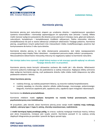 KARMIENIE PIERSIĄ Karmienie piersią Karmienie piersią jest naturalnym etapem po urodzeniu dziecka i najwłaściwszym sposobem żywienia noworodków i niemowląt zapewniającym im optymalny stan zdrowia i rozwój. Mleko matki stanowi wyłączne pożywienie dla dziecka przez pierwsze 6 miesięcy życia, gdyż jest jedynym, naturalnym, kompletnym i kompleksowym środkiem odżywczym. Żadna mieszanka mleczna (modyfikowana) nie jest w stanie odtworzyć unikalnych właściwości Twojego pokarmu. Karmienie piersią, uzupełniane innymi pokarmami (nie mieszankami mleka modyfikowanego), powinno być kontynuowane do końca 2 roku życia dziecka. Karmienie dziecka piersią to nie tylko dostarczanie pożywienia. Jest także nawiązywaniem emocjonalnej więzi między Toba i dzieckiem - rozwijaniem poczucia ciepła, miłości i przywiązania. Nieuzasadnione dokarmianie mieszanką mleczną ma negatywny wpływ na karmienie naturalne. Nie istnieje żadna inna czynność, dzięki której możesz w tak znaczący sposób wpłynąć na zdrowie Twojego dziecka dziś i w przyszłości. Karmienie piersią niesie korzyści zdrowotne zarówno dla matki jak i dla dziecka. Właściwości ochronne pokarmu kobiecego nie do podrobienia w żadnej mieszance. Najlepsze efekty ochronne daje wyłączne karmienie piersią, czyli podawanie dziecku tylko mleka matki (dopuszcza się tylko podawanie witamin i leków). Dzieci karmione piersią: rzadziej chorują, są rzadziej pacjentami lekarzy, są znacznie rzadziej hospitalizowane. rzadziej zapadają na choroby zakaźne układu oddechowego, moczowego, pokarmowego: biegunki, martwicze zapalenie jelit, zapalenia ucha, zapalenia opon mózgowo-rdzeniowych. Karmienie ma działanie przeciwbólowe. Karmienie mlekiem matki wpływa korzystnie na rozwój funkcji poznawczych, rozwój psychomotoryczny oraz intelektualny. W przyszłości, jako dorośli, dzieci karmione piersią przez swoje matki rzadziej mają nadwagę, otyłość, cukrzycę typu I i typu II, astmę, choroby nowotworowe, nadciśnienie. U matki karmiącej lepiej przebiega połóg, to znaczy: szybciej następuje inwolucja macicy, krótszy jest okres krwawienia, mniejsze jest ryzyko anemii. Karmienie pozwoli Ci na szybszą utratę zbędnych kilogramów po porodzie i powrót do figury sprzed ciąży. 1 EMC Szpitale OPIEKA NAD MATKĄ I DZIECKIEM KARMIENIE PIERSIĄ W przyszłości matki, które karmiły swoje dzieci piersią rzadziej chorują na raka piersi, raka jajnika, doznają złamań biodra i osteoporozy w późnym wieku. Jeśli karmiły powyżej roku rzadziej chorują na nadciśnienie, choroby układu krążenia. Matki karmiące piersią rzadziej chorują na depresję poporodową. Oksytocyna wydzielająca się podczas karmienia, wpływa na matkę uspokajająco, zmniejsza agresję i obniża lęk. Karmienie piersią jest tanie i wygodne. Produkowane przez Ciebie mleko jest zawsze świeże, w odpowiedniej temperaturze, w każdej chwili gotowe do podania dziecku. Koszty są niewielkie (zdrowe odżywianie matki + ew. odciągacz pokarmu) w porównaniu z kosztami mleka modyfikowanego, akcesoriów do żywienia sztucznego, ewentualnego częstszego leczenia, hospitalizacji, zwolnień lekarskich rodziców. Karmienie piersią najlepiej rozpocząć w pierwszych 2 godzinach po porodzie - wtedy noworodek jest aktywny i odruch poszukania jest bardzo silny. Budzi się instynkt macierzyński u matki. Karmienie należy rozpocząć, gdy noworodek zaczyna szukać piersi. Zarówno po porodzie siłami natury jak i po cięciu cesarskim możliwe jest ułożenie osuszonego noworodka bezpośrednio na skórze, w ramionach matki. Kontakt „skóra do skóry” nowonarodzonego dziecka z matką pozwala na osiedlenie się na skórze dziecka niegroźnych dla niego bakterii ze skóry matki, ale także wpływa korzystnie na długość karmienia piersią. Pomiary, kąpiel i inne czynności pielęgnacyjne mogą być wykonane po zakończeniu pierwszego karmienia. Jak karmić? W okresie do 20 godzin od urodzenia następuje czas obniżonej aktywności noworodka, zwykle odsypia on poród. Rytm karmień w pierwszej dobie jest, zatem rzadszy. Od drugiej doby zaczynają się bardzo częste karmienia (8-12 na dobę), które umożliwiają odpowiednie pobudzenie produkcji mleka. Zanim nabierzesz wprawy przy przystawianiu dziecka do piersi warto skorzystać z poniższych wskazówek: usiądź lub połóż się wygodnie i postaraj się rozluźnić, podtrzymuje pierś czterema palcami od spodu, kciuk układa na piersi (litera U), palce nie dotykają otoczki i nie uciskają piersi zbyt mocno, dziecko brzuszkiem przylega do ciała matki, twarzą jest skierowane do piersi, głowa dziecka znajduje się w osi kręgosłupa, nie zgina się, główka, plecy i pośladki dziecka są stabilnie podtrzymywane, głowa dziecka znajduje się na wysokości piersi, nos naprzeciw brodawki, 2 EMC Szpitale OPIEKA NAD MATKĄ I DZIECKIEM KARMIENIE PIERSIĄ Po opuszczeniu szpitala, w domu warto pamiętać o tym, że karmienie dziecka na żądanie polega na tym, że karmimy dziecko nie rzadziej, niż co 3 godziny, licząc od początku karmienia do początku następnego karmienia. W nocy możliwa jest przerwa nie dłuższa niż 4 godziny. Dziecko należy przystawiać do piersi na około 20 minut i po zakończeniu (zmniejszeniu intensywności ssania) – zaproponować pierś drugą. Dziecko się najada jeśli jest karmione często, przynajmniej 8 razy na dobę, ssie pierś prawidłowo przynajmniej przez 10 minut, mama czuje, że pierś rozluźniła się po zakończeniu ssania i dziecko siusia (początkowo 3 zmoczone pieluchy), a od 3-4 doby wydala przynajmniej 3 stolce żółto zielonkawe a później papkowate, żółte dobrze wypełniające pieluchę. Dziecko po porodzie ma prawo stracić ze swojej wagi urodzeniowej, do 7% ale w wieku ok. 2 tygodni powinno ważyć tyle, co w chwili porodu lub więcej. Później dziecko powinno przybierać na wadze wg. Ruth Lawrence: Wiek, m-ce Średni przyrost 