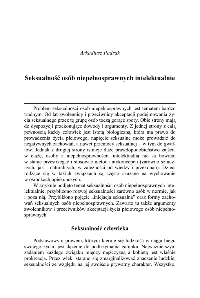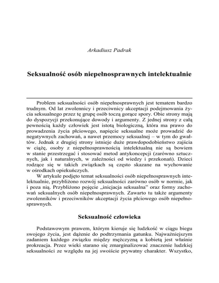 Arkadiusz Padrak Seksualność osób niepełnosprawnych intelektualnie Problem seksualności osób niepełnosprawnych jest tematem bardzo trudnym. Od lat zwolennicy i przeciwnicy akceptacji podejmowania życia seksualnego przez tę grupę osób toczą gorące spory. Obie strony mają do dyspozycji przekonujące dowody i argumenty. Z jednej strony z całą pewnością każdy człowiek jest istotą biologiczną, która ma prawo do prowadzenia życia płciowego, napięcie seksualne może prowadzić do negatywnych zachowań, a nawet przemocy seksualnej – w tym do gwałtów. Jednak z drugiej strony istnieje duże prawdopodobieństwo zajścia w ciążę, osoby z niepełnosprawnością intelektualną nie są bowiem w stanie przestrzegać i stosować metod antykoncepcji (zarówno sztucznych, jak i naturalnych, w zależności od wiedzy i przekonań). Dzieci rodzące się w takich związkach są często skazane na wychowanie w ośrodkach opiekuńczych. W artykule podjęto temat seksualności osób niepełnosprawnych intelektualnie, przybliżono rozwój seksualności zarówno osób w normie, jak i poza nią. Przybliżono pojęcie „inicjacja seksualna” oraz formy zachowań seksualnych osób niepełnosprawnych. Zawarto tu także argumenty zwolenników i przeciwników akceptacji życia płciowego osób niepełnosprawnych. Seksualność człowieka Podstawowym prawem, którym kieruje się ludzkość w ciągu biegu swojego życia, jest dążenie do podtrzymania gatunku. Najważniejszym zadaniem każdego związku między mężczyzną a kobietą jest właśnie prokreacja. Przez wieki starano się zmarginalizować znaczenie ludzkiej seksualności ze względu na jej swoiście prywatny charakter. Wszystko, 122 Arkadiusz Padrak co miało jakikolwiek związek z seksualnością, stanowiło temat tabu. Próby zmiany podejścia do tej intymnej sfery życia człowieka zostały podjęte dopiero w XX w. Jednak w wielu krajach podejmowanie tematu ludzkiej seksualności jest nadal zakazane. Najczęściej wynika to z przesłanek religijnych. Na uwagę zasługuje fakt, że pomimo olbrzymiego przełomu, jaki dokonał się w myśleniu ludzi, istnieją grupy społeczne, których seksualność stanowi przedmiot dyskusji specjalistów z różnych dziedzin: lekarzy, psychologów, socjologów, pedagogów, etyków. Chodzi tutaj o życie seksualne oraz samą seksualność osób z całościowymi zaburzeniami rozwojowymi. Pojawia się tutaj szereg pytań, czy osoby te mogą podejmować współżycie. Jeśli tak, w jaki sposób zapobiegać rodzeniu się niepełnosprawnych dzieci bądź dzieci w ogóle (z racji tego, że z całą pewnością z powodu niewydolności wychowawczej rodzica bądź obojga rodziców dziecko zostanie z góry skazane na przebywanie w ośrodku opiekuńczym). Jeśli nie, w jaki sposób opanować ten naturalny dla każdej istoty ludzkiej instynkt. Jedno pytanie pociąga za sobą konieczność udzielenia odpowiedzi na kolejne rodzące się wątpliwości. Z całą pewnością należy stwierdzić, że problem ten jest niezwykle trudny i wiąże się z poruszaniem się po specyficznej tematyce, która – jak stwierdzono wcześniej – ciągle jest tematem tabu. W artykule wyjaśniono pojęcie „seksualność”, przybliżono także rozwój seksualności w życiu człowieka. Podjęto zagadnienia podejścia Kościoła katolickiego do seksualności (jest to istotne z racji dylematów dotyczących seksualności osób niepełnosprawnych oraz z faktem, iż ponad 90 % Polaków deklaruje się jako osoby wierzące). W dalszej części zostanie poruszony problem pojmowania seksualności przez osoby niepełnosprawne oraz wspomniane powyżej dylematy i propozycje ich rozwiązania. Pojęcie „seksualność” Zgodnie z definicją zaakceptowaną przez Światową Organizację Zdrowia (WHO) seksualność jest nieodłączną częścią osobowości każdego człowieka. Na pełny rozwój seksualności człowieka składają się potrzeby, które muszą być spełnione. Należy do nich: potrzeba kontaktu, intymności, ekspresji uczuć oraz najważniejszych komponentów – czułości i miłości. Taki właśnie rozwój seksualności można uznać za pełny i mający olbrzymi wkład w indywidualne i społeczne dobro. Należy jednak podkreślić, że seksualność musi bazować na „całkowitej zdolności Seksualność osób niepełnosprawnych intelektualnie 123 uczuciowej”. Ważne jest to, by seksualność była seksualnością zdrową, co oznacza całkowite wykluczenie i odrzucenie niebezpiecznych dla człowieka i społeczeństwa dewiacji seksualnych1. Philip G. Zimbardo seksualność człowieka opisuje jako „złożoną z rozwiniętego zespołu motywacyjnego skierowanego na dobór reprodukcyjny i przyjemność seksualną oraz społecznych przeszkód i ułatwień aktywności seksualnej”2. Inną, równie interesującą definicję seksualności przedstawia R. Seremet. Według niego seksualność to metaforyczne miejsce, gdzie spotykają się oraz krzyżują wszelkie poziomy życia człowieka: ciało, emocje, poczucie własnej wartości, oraz doznanie miłości. Według niego świadome podchodzenie do własnej seksualności prowadzi do wzajemnej bliskości, pogłębia kontakt zarówno ze sferą zmysłów, sferą mentalną, jak i sferą duchową, prowadząc do odkrywania naszej najgłębszej istoty3. Według Organizacji Narodów Zjednoczonych oraz Światowej Organizacji Zdrowia, za zdrowy rozwój seksualności uznaje się odpowiedzialne i równe relacje partnerskie, osiąganie satysfakcji seksualnej oraz wolność od chorób, niemocy seksualnej oraz przemocy, a także innych krzywdzących praktyk związanych z seksualnością. W rozwoju seksualności człowieka istotna jest inicjacja seksualna. Inicjacja seksualna Inicjacja seksualna oznacza pierwszy stosunek płciowy. Z całą pewnością moment ten jest jednym z „najbardziej znaczących wydarzeń w życiu człowieka. Wprawdzie inne znaczenie ma dla kobiety, inne zaś dla 