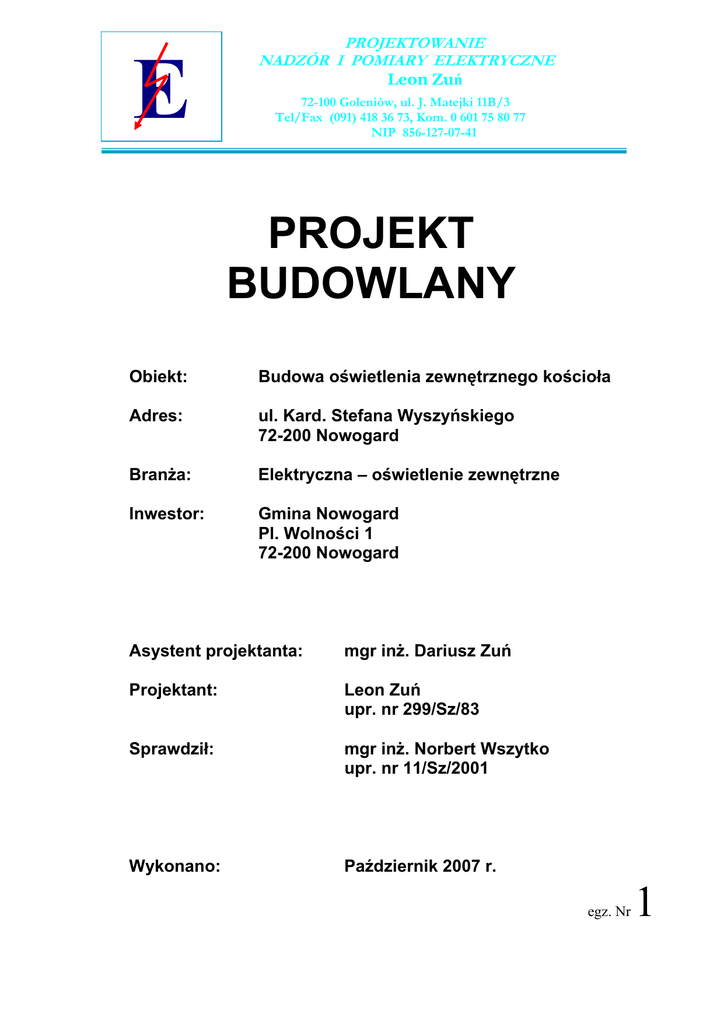 E PROJEKTOWANIE NADZÓR I POMIARY ELEKTRYCZNE Leon Zuń 72-100 Goleniów, ul. J. Matejki 11B/3 Tel/Fax (091) 418 36 73, Kom. 0 601 75 80 77 NIP 856-127-07-41 PROJEKT BUDOWLANY Obiekt: Budowa oświetlenia zewnętrznego kościoła Adres: ul. Kard. Stefana Wyszyńskiego 72-200 Nowogard Branża: Elektryczna – oświetlenie zewnętrzne Inwestor: Gmina Nowogard Pl. Wolności 1 72-200 Nowogard Asystent projektanta: mgr inż. Dariusz Zuń Projektant: Leon Zuń upr. nr 299/Sz/83 Sprawdził: mgr inż. Norbert Wszytko upr. nr 11/Sz/2001 Wykonano: Październik 2007 r. egz. Nr 1 SPIS TREŚCI 1. Strona tytułowa 2. Zawartość opracowania 3. Oświadczenie 4. Warunki techniczne przyłączenia 5. Opis techniczny 6. Plan BIOZ 7. Obliczenia techniczne 8. Schemat ideowy zasilania 9. Rysunki: - plan trasy linii kablowej 0,4kV OPIS TECHNICZNY I. Podstawa prawna Podstawę prawną niniejszego opracowania stanowi zlecenie inwestora. II. Podstawa opracowania 1. Warunki techniczne przyłączenia ZR3/1257/2007 z dnia 12.11.2007r. wydane przez RD Goleniów 2. PN-IEC 60364 "Instalacje elektryczne w obiektach budowlanych. 3. PN-76/E-05125 "Elektroenergetyczne i sygnalizacyjne linie kablowe. Projektowanie i budowa" 4. Normy, przepisy, katalogi związane z przedmiotem opracowania. III. Oświetlenie zewnętrzne 1. Zasilanie oświetlenia W związku z częściowym usytuowaniem opraw oświetleniowych na budynku kościoła a w części w ziemi wokół kościoła projektuje się ułożenie kabli zasilających typu YKY 3x4mm2. Kable na budynku kościoła układać w rurkach ochronnych RVS 18 kolorystycznie dobranych do elewacji kościoła. Oprawy oświetleniowe usytuowane w ziemi zasilić poprzez ułożenie kabla w gruncie. Zabudowane kable wprowadzić do projektowanej szafki oświetleniowej przy ścianie bocznej wieży kościoła. Zasilanie szafki oświetleniowej realizować z istniejącego złącza kablowego ZK3b usytuowanego przy powyższe ścianie wieży. Trasę kabli oraz usytuowanie szafki oświetleniowej pokazano na planie sytuacyjnym. Szafkę oświetleniową zasilić kablem YKY 2x10mm2 z istn. złącza kablowego ZK3e izol. 2. Oprawy oświetleniowe Projektuje się zabudowę opraw oświetleniowych typu: A - MBF 505 SON-T 70W WB ze źródłem SON-T PIA Plus 70W B - RVP 351 SON-T 250W SK C - RVP 351 SON-T 400W AK D - MVF 606 CDM-T 70W NB ze źródłem CDM-T 70W/830 E - MBF 505 SON-T 70W MB ze źródłem SON-T PIA Plus 70W F - MVF 415 70W WBK ze źródłem MHN – TD 70W Oprawy mocować poprzez przykręcenie śrubami do ścian budynku kościoła (oprawa B), za pomocą zamocowanego uprzednio wysięgnika (oprawa D i F), do fundamentu betonowego w ziemi (oprawa C) oraz bezpośrednio w ziemi w wykopie (oprawa A i E). IV. Układanie kabli 0,4kV w ziemi Miejsce przyłączenia kabli do sieci, trasę ułożenia pokazano na planie sytuacyjnym projektu. Kable należy ułożyć w wykonanym wykopie na głębokości 70cm.Na dno rowu kablowego nasypać 10cm warstwę piasku, na której należy ułożyć kable. Na kablach w odstępach co 10m oraz przy wejściu do szafki oświetleniowej i stacji transformatorowej nałożyć opaski informacyjne. Na ułożone kable ponownie nasypać 10cm warstwę piasku i 20cm warstwę ziemi pochodzącej z rozkopów. Na ziemi tej na całej długości kabli ułożyć folię w kolorze niebieskim. Pozostały jeszcze wykop zasypać ziemią z rozkopów. V. Szafka oświetleniowa SO-2 Celem zasilenia oświetlenia projektuje się przy zewnętrznej ścianie wieży kościoła obok istn. złącza kablowego ZK3e w miejscu wskazanym na planie sytuacyjnym zabudowę szafki oświetleniowej SO-2. Szafkę wykonać jako wolnostojącą w obudowie izolowanej na typowym fundamencie tak aby tarcza licznika znajdowała się 0.8 – 2m nad poziomem terenu. Szafka powinna posiadać wziernik do odczytu wskazań licznika. W szafce oświetleniowej zabudować zabezpieczenia przelicznikowe typu S311-C-32A w obudowie przystosowanej do plombowania. W złączu kablowym zabudować zabezpieczenia typu WT-1F 50A. Sterowanie oświetleniem odbywać się będzie poprzez wyłącznik zmierzchowy lub zegar sterujący. Dla szafki oświetleniowej wykonać niezależne uziemienie typu GALMAR tak aby rezystancja uziemienia ochronnego wynosiła R<10Ω. Powiązanie uziemienia z szafką wykonać bednarką FeZn 3x20mm2. VI. Ochrona przeciwporażeniowa W sieci kablowej 0,4kV jako ochronę podstawową stosuje się obudowę szafki pomiarowej natomiast jako ochronę dodatkową zastosowano obudowę wykonaną w II klasie izolacji. VII. Uwagi końcowe. • Wszystkie prace wykonać zgodnie z obowiązującymi normami i przepisami. • Roboty ziemne związane z kopaniem rowów kablowych wykonać ręcznie. • Układ pomiarowy podlega odbiorowi przez RD Goleniów. • Dla kabla energetycznego winna być dokonana inwentaryzacja geodezyjna. • Skuteczność działania ochrony p.porażeniowej oraz oporność uziemień potwierdzić pomiarami technicznymi. OBLICZENIA TECHNICZNE 1. Dobór zabezpieczeń : I= Ps U * cos ϕ Iodb = • 6 = 28,05[ A] 0,23 * 0,93 W szafce oświetleniowej SP-2 dobrano zabezpieczenia przedlicznikowe typu S311 C32A. • W złączu kablowym dobrano zabezpieczenia o In= 50A 2. Obliczenie spadku napięcia dla sieci kablowej 0,4 kV WLZ - YKY 2x10mm2 =4m ΔU%WLZ = 0,09 % Obliczony spadek napięcia jest mniejszy od dopuszczalnego spadku napięcia zgodnie z PN-IEC 60364-5-52:2002 „Instalacje elektryczne w obiektach budowlanych. Dobór i montaż wyposażenia elektrycznego. Oprzewodowanie”.
