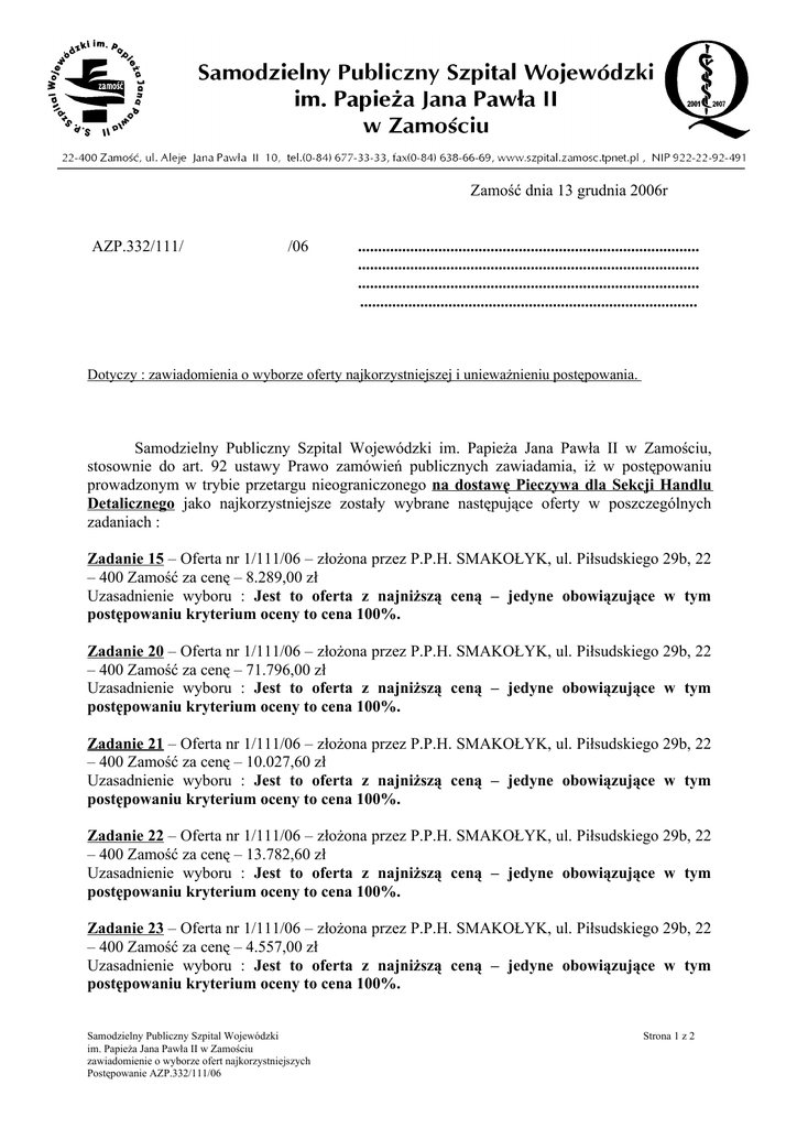 Zamość dnia 13 grudnia 2006r AZP.332/111/ /06