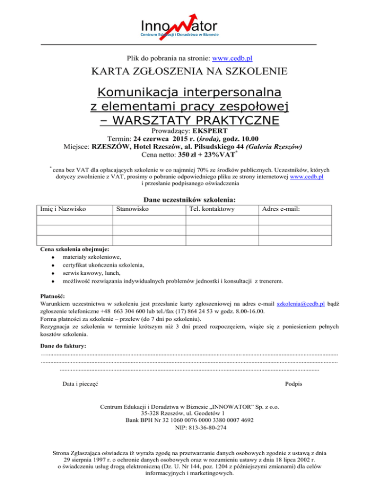 Plik do pobrania na stronie: www.cedb.pl KARTA ZGŁOSZENIA NA SZKOLENIE Komunikacja interpersonalna z elementami pracy zespołowej – WARSZTATY PRAKTYCZNE Prowadzący: EKSPERT Termin: 24 czerwca 2015 r. (środa), godz. 10.00 Miejsce: RZESZÓW, Hotel Rzeszów, al. Piłsudskiego 44 (Galeria Rzeszów) Cena netto: 350 zł + 23%VAT* * cena bez VAT dla opłacających szkolenie w co najmniej 70% ze środków publicznych. Uczestników, których dotyczy zwolnienie z VAT, prosimy o pobranie odpowiedniego pliku ze strony internetowej www.cedb.pl i przesłanie podpisanego oświadczenia Dane uczestników szkolenia: Imię i Nazwisko Stanowisko Tel. kontaktowy Adres e-mail: Cena szkolenia obejmuje: materiały szkoleniowe, certyfikat ukończenia szkolenia, serwis kawowy, lunch, możliwość rozwiązania indywidualnych problemów jednostki i konsultacji z trenerem. Płatność: Warunkiem uczestnictwa w szkoleniu jest przesłanie karty zgłoszeniowej na adres e-mail [email protected] bądź zgłoszenie telefoniczne +48 663 304 600 lub tel./fax (17) 864 24 53 w godz. 8.00-16.00. Forma płatności za szkolenie – przelew (do 7 dni po szkoleniu). Rezygnacja ze szkolenia w terminie krótszym niż 3 dni przed rozpoczęciem, wiąże się z poniesieniem pełnych kosztów szkolenia. Dane do faktury: …............................................................................................................................ ............................................................. ............................................................................................................................................................................................. ..................................................................................................................................................................... Data i pieczęć Podpis Centrum Edukacji i Doradztwa w Biznesie „INNOWATOR” Sp. z o.o. 35-328 Rzeszów, ul. Geodetów 1 Bank BPH Nr 32 1060 0076 0000 3380 0007 4692 NIP: 813-36-80-274 Strona Zgłaszająca oświadcza iż wyraża zgodę na przetwarzanie danych osobowych zgodnie z ustawą z dnia 29 sierpnia 1997 r. o ochronie danych osobowych oraz w rozumieniu ustawy z dnia 18 lipca 2002 r. o świadczeniu usług drogą elektroniczną (Dz. U. Nr 144, poz. 1204 z późniejszymi zmianami) dla celów informacyjnych i marketingowych. ………………………………………… Miejsce i data ……………………………… Pieczęć Jednostki Centrum Edukacji i Doradztwa w Biznesie „INNOWATOR” Sp. z o.o. 35-328 Rzeszów, ul. Geodetów 1 tel. +48 663 304 600 , +48 17 864 24 53 e-mail: [email protected] www.cedb.pl Oświadczamy, że nabyta od Centrum Edukacji i Doradztwa w Biznesie „INNOWATOR” Sp. z o.o. usługa (szkolenie - warsztaty) „Komunikacja interpersonalna z elementami pracy zespołowej – WARSZATY PRAKTYCZNE” w terminie 24.06.2015 r. mająca charakter usługi kształcenia zawodowego/przekwalifikowania zawodowego, jest finansowana ze środków publicznych: a) w całości zgodnie z treścią art. 43 ust. 1 pkt. 29 lit. c ustawy z dnia 11.03.2004 o podatku od towarów i usług (Dz. U. Nr 54, poz. 535 ze zm.) lub b) w co najmniej 70%, ale mniej niż 100% - zwolnienie wynikające z § 3 ust. 1 pkt. 14 rozporządzenia Ministra Finansów z dnia 20 grudnia 2013 r. * prosimy o zaznaczenie właściwej opcji a lub b ……………………………………………. Podpis osoby upoważnionej do zaciągania zobowiązań wobec Jednostki