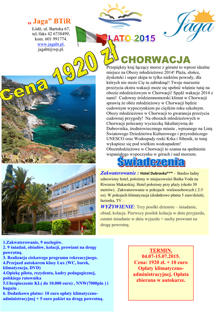 „ Jaga” BTiR Łódź, ul. Bartoka 67, tel./faks 42 6738499, kom. 601 991774. www.jagabt.pl, [email protected]. CHORWACJA Przepiękny kraj łączący morze z górami to wprost idealne miejsce na Obozy młodzieżowe 2014! Plaża, słońce, dyskoteki i super ekipa to tylko niektóre powody, dla których nie może Cię tu zabraknąć! Twoje marzenie przeżycia ekstra wakacji może się spełnić właśnie tutaj na obozie młodzieżowym w Chorwacji! Spędź wakacje 2014 z nami! Cudowny śródziemnomorski klimat w Chorwacji sprawią że obóz młodzieżowy w Chorwacji będzie cudownym wypoczynkiem po ciężkim roku szkolnym. Obozy młodzieżowe w Chorwacji to gwarancja przeżycia cudownej przygody! Na obozach młodzieżowych w Chorwacji polecamy wycieczkę fakultatywną do Dubrovnika, średniowiecznego miasta , wpisanego na Listę Światowego Dziedzictwa Kulturowego i przyrodniczego UNESCO oraz Wodospady rzeki Krka i Sibenik, to tutaj wykapiesz się pod wielkim wodospadem! Obozmłodzieżowe w Chorwacji to szansa na spełnienie wspaniałego wypoczynku w górach i nad morzem. Adriatyk zaprasza wszytskich na obozy młodzieżowe! obozy młodzieżowe 2014 Bardzo ładny odnowiony hotel, położony w miejscowości Baśka Voda na Riwierze Makarskiej. Hotel położony przy plaży (około 30 metrów). Zakwaterowanie w pokojach wieloosobowych ( 2-5 os). W pokojach klimatyzacja (dodatkowo płatna 5 euro/dzień), łazienka, TV . Zakwaterowanie : Hotel Dubravka*** - WYŻYWIENIE: Trzy posiłki dziennie – śniadanie, obiad, kolacja. Pierwszy posiłek kolacja w dniu przyjazdu, ostatni śniadanie w dniu wyjazdu + suchy prowiant na drogę powrotną. 1.Zakwaterowanie, 9 noclegów. 2. 9 śniadań, obiadów, kolacji, prowiant na drogę powrotną. 3. Realizacja ciekawego programu rekreacyjnego. 4.Przejazd autokarem klasy Lux (WC, barek, klimatyzacja, DVD) 4.Opiekę pilota, rezydenta, kadry pedagogicznej, polskiego ratownika 5.Ubezpieczenie KL( do 10.000 euro) , NNW(7000pln ) i bagażu . 6. Dodatkowo płatne: 10 euro opłaty klimatycznoadministracyjnej + 5 euro pakiet na drogę powrotną. TERMIN. 04.07-15.07.2015. Cena: 1920 zł. + 10 euro Opłaty klimatycznoadministracyjnej. Opłata zbierana w autokarze. Dzień 1. Wyjazd z Polski. W okolicach granicy polskiej, w godzinach wieczornych, autokar zatrzymuje się w przygranicznej restauracji. Dla chętnych możliwość zakupienia posiłku w cenie około 20 ZŁ. Dzień 2. Przejazd przez : Czechy , Austrię, Słowenię. Przyjazd do Chorwacji w godzinach wieczornych, zakwaterowanie, kolacja. Spotkanie organizacyjne z rezydentem, powitanie kadry i uczestników, przekazanie praktycznych informacji dotyczących zakwaterowania, wyżywienia oraz miejscowości. Podczas spotkania, uczestnicy zapoznają się z programem, ofertą wycieczek fakultatywnych i regulaminem obozu. Dzień 2 – 10. Pobyt w Chorwacji. Plażowanie, gry i zabawy, piłka siatkowa plażowa, spacery, zwiedzanie miasta. Realizacja wycieczek fakultatywnych: Dubrovnik średniowieczne miasto, klejnot południowej Dalmacji, wpisany na Listę Światowego Dziedzictwa Kulturowego i Przyrodniczego UNESCO, dumnie zwany Perłą Adriatyku. To jedno z najpiękniejszych chorwackich miast, które swe tajemnice skrywa za monumentalnymi murami obronnymi. Serce Dubrovnika tętni w rytmie festiwali i imprez kulturalnych. Liczne restauracje i kawiarnie wkomponowały się w scenerię historycznych zabytków. Cena: 45 euro/osobę Wodospady rzeki Krka i Sibenik - jeśli ktoś z Was marzył o kąpieli pod wodospadem, tutaj w Parku Narodowym Krka może to marzenie spełnić. 16 spiętrzeń na rzece Krka tworzy .kompleks malowniczych wodospadów, składających się na naturalny Park Wodny. U stóp największego wodospadu jest duże kąpielisko, gdzie można będzie popływać i poopalać się. W drodze powrotnej zobaczymy Sibenik - metropolię wczesnosłowiańską, położoną u ujścia rzeki do Adriatyku. Wszystkie uliczki w centrum prowadzą w kierunku twierdzy, górującej nad miastem, z której rozpościera się wspaniała panorama miasta. Cena 50 euro/os. Cena zawiera bilet wstępu do parku. Dzień 11. Śniadanie, wykwaterowanie. Podsumowanie obozu. Pamiątkowe zdjęcie. Przed wyjazdem do Polski obiad. Wieczorny wyjazd do kraju. Dzień 12. Przyjazd do Łodzi w godzinach wieczornych. „Jaga” Biuro Turystyki i Rekreacji Łódź, ul. Bartoka 67, tel./faks 042 6738499, kom. 601991774 www.jagabt.pl, [email protected]. Zez. Marszałka Województwa Łódzkiego Nr 206. JAGA BTiR Łódź, ul. Bartoka 67, tel./faks 42 6738499, kom. 601 991774. www.jagabt.pl, [email protected]. Możliwe do zrealizowania wycieczki fakultatywne: (Ceny orientacyjne) Dubrovnik - średniowieczne miasto, klejnot południowej Dalmacji, wpisany Listę Światowego Dziedzictwa Kulturowego UNESCO. Dubrovnik ma długoletnią tradycję turystyczną i gotowy jest spełnić najbardziej wymagające żądania swoich gości. Miasto muzeów i festiwali, gościńców i restauracji, miasto łagodnego śródziemnomorskiego klimatu i przepięknych pejzaży. Cena: 45 euro/osobę Split i Trogir - w programie zwiedzania Splitu: Riva, Stare Miasto z unikalną architekturą kilku epok, jedyny zachowany w całości rzymski pałac - Pałac Dioklecjana, charakterystyczny bałkański bazar oraz największy port południowej Chorwacji. Ze Splitu udamy się do Trogiru, miasta założonego przez Greków, malowniczo położonego ze wspaniale zachowaną średniowieczną starówką. Cena: 35 euro/osobę Wodospady rzeki Krka i Sibenik - jeśli ktoś z Was marzył o kąpieli pod wodospadem, tutaj w Parku Narodowym Krka może to marzenie spełnić. 16 spiętrzeń na rzecze Krka tworzy kompleks malowniczych wodospadów, składających się na naturalny Park Wodny. U stóp największego wodospadu jest duże kąpielisko, gdzie można będzie popływać i poopalać się. W drodze powrotnej zobaczymy Sibenik - metropolię wczesnosłowiańską, położoną u ujścia rzeki do Adriatyku. Wszystkie 
