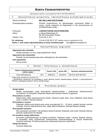 KARTA CHARAKTERYSTYKI [Sporządzona zgodnie z rozporządzeniem WE Nr 1907/2006 (REACH)] 1. Identyfikacja preparatu, Identyfikacja przedsiębiorstwa Nazwa handlowa: MC-WILLIAM ODCZYNNIK Charakterystyka produktu: Produkt przeznaczony do jakościowego oznaczania białka w moczu, wyrób medyczny do diagnostyki in vitro przeznaczony do profesjonalnego użytku. Producent: Adres: LABORATORIUM ODCZYNNIKOWE ul. Boya Żeleńskiego 27 88-100 Inowrocław, Polska (0 52) 35 21 271 Telefon / Fax: Tel. alarmowy 112 lub (0 52) 35 21 271 (telefon czynny w godzinach 8-16) Adres e- mail osoby odpowiedzialnej za kartę charakterystyki [email protected] 2. Identyfikacja zagrożeń Zagrożenia dla człowieka Działa drażniąco na oczy, drogi oddechowe i skórę. Zagrożenia dla środowiska Produkt nie jest klasyfikowany jako niebezpieczny dla środowiska. Inne zagrożenia Nie są znane. 3. Skład i informacja o składnikach Nazwa niebezpiecznej substancji i zakres stężeń kwas sulfosalicylowy 20% Numer CAS Numer WE 5965-83-3 202-555-6 Symbole niebezpieczeństwa Xn R:22; Xi R:36/37/38 Pełna treść zwrotów R w punkcie 16 * Wymienione substancje nie posiadają w chwili obecnej numeru rejestracyjnego zgodnie z rozporządzeniem REACH, podlegają przepisom okresu przejściowego. 4. Pierwsza pomoc Uwagi ogólne Należy przestrzegać uwag dotyczących bezpieczeństwa i użytkowania zamieszczonych na etykiecie. W przypadku narażenia natychmiast wezwać lekarza / pogotowie. W kontakcie ze skórą Natychmiast zdjąć zanieczyszczoną odzież. Skażone partie skóry zmyć dokładnie dużą ilością wody z mydłem. Wezwać lekarza. W kontakcie z oczami Wypłukać obficie dużą ilością wody przez przynajmniej 10 – 15 minut, powieki trzymać szeroko rozwarte. Chronić niepodrażnione oko, zdjąć szkła kontaktowe. Wezwać lekarza okulistę. W przypadku spożycia Nie wywoływać wymiotów i nie podawać żadnych płynów! Wypłukać usta wodą. Wezwać lekarza, pokazać opakowanie lub etykietę. Po narażeniu drogą oddechową Przenieść poszkodowanego na świeże powietrze. Zapewnić ciepło i spokój. Wezwać lekarza. W przypadku utraty przytomności transportować poszkodowanego w pozycji bezpiecznej (bocznej ustalonej). W razie konieczności zastosować sztuczne oddychanie. Uwagi dla lekarza Leczenie objawowe. Data aktualizacji: 18.08.2008 r. Wersja: 1.1/PL str. 1/6 KARTA CHARAKTERYSTYKI Nazwa handlowa: Producent: Adres: MC-WILLIAM ODCZYNNIK LABORATORIUM ODCZYNNIKOWE ul. Boya Żeleńskiego 27; 88-100 Inowrocław, Polska 5. Telefon/Fax: (0 52) 35 21 271 Postępowanie w przypadku pożaru Odpowiednie środki gaśnicze Piana, CO2, mgła wodna, rozpylony strumień wody, proszek gaśniczy. Nieodpowiednie środki gaśnicze Zwarty strumień wody – ryzyko rozprzestrzenienia pożaru. Szczególne wyposażenie podczas walki z ogniem Środki ochrony ogólnej typowe w przypadku pożaru. Nie należy przebywać w zagrożonej ogniem strefie bez odpowiedniego ubrania odpornego na chemikalia i aparatu do oddychania z niezależnym obiegiem powietrza. Uwagi dodatkowe Zagrożone ogniem pojemniki polewać z bezpiecznej odległości rozpylonym strumieniem wody. W warunkach pożaru możliwe jest powstawanie toksycznych oparów. 6. P o stę pow a n ie w prz yp a d ku n iez a m ierz on eg o uw oln i en i a do ś ro dow iska Indywidualne środki ostrożności Nosić odpowiednie ubranie ochronne (rękawice, maska, fartuch). Oddalić osoby postronne z miejsca wypadku. Unikać kontaktu ze skórą i oczami. Nie wdychać par produktu. Należy zapewnić odpowiednią wentylację. Patrz także pkt 8 Karty. Niezbędne środki w zakresie ochrony środowiska Nie wylewać do kanalizacji, wód powierzchniowych i gruntowych. W przypadku rozlania większych ilości preparatu należy poczynić odpowiednie kroki w celu niedopuszczenia do rozprzestrzenienia się w środowisku naturalnym. Wezwać odpowiednie służby ratownicze. Metody oczyszczania/wchłaniania Zebrać materiałami wchłaniającymi ciecze (np. piasek, ziemia, uniwersalne substancje wiążące, krzemionka, trociny itp.). Zebrany materiał potraktować jak odpady i dalej postępować wg pkt 13. Oczyścić skażone miejsce, pozostałość zmyć dużą ilością wody. 7. Postępowanie z preparatem i jego magazynowanie Postępowanie z preparatem Pracować zgodnie z zasadami bezpieczeństwa i higieny, tylko w dobrze wentylowanych pomieszczeniach. Podczas otwierania pojemników wystrzegać się gwałtownych ruchów mogących spowodować uwolnienie lub rozprysk preparatu. Nie stosować po terminie ważności umieszczonym na etykiecie. Stosować rękawice ochronne i odzież laboratoryjną. Nie jeść, nie pić i nie palić tytoniu podczas pracy z odczynnikiem. Nie pozostawiać otwartych pojemników. Unikać kontaktu ze skórą i oczami. Nie wdychać par produktu. Magazynowanie Przechowywać tylko w oryginalnych, szczelnie zamkniętych opakowaniach w suchym i dobrze wentylowanym pomieszczeniu. Zalecana temperatura magazynowania: +15 ÷ +25°C. Chronić przed bezpośrednim nasłonecznieniem. Trzymać z dala od źródeł ognia. Nie palić. Nie przechowywać razem z mocnymi zasadami, utleniaczami, artykułami żywnościowymi i paszami dla zwierząt. Specyficzne zasosowania Produkt jest wyrobem medycznym do diagnostyki in-vitro, przeznaczonym do użytku profesjonalnego. Używać tylko zgodnie z przeznaczeniem, według informacji zawartych w dołączonej instrukcji stosowania. 8. Kontrola narażania i środki ochrony indywidualnej Wartości graniczne narażania Substancje zawarte w preparacie nie podlegają kontroli narażenia w miejscu pracy. Data aktualizacja: 18.08.2008 r. Wersja: 1.1/PL str. 2/6 KARTA CHARAKTERYSTYKI Nazwa handlowa: Producent: Adres: MC-WILLIAM ODCZYNNIK LABORATORIUM ODCZYNNIKOWE ul. Boya Żeleńskiego 27; 88-100 Inowrocław, Polska Telefon/Fax: (0 52) 35 21 271 Kontrola narażenia w miejscu pracy Przestrzegać ogólnych zasad bezpieczeństwa i higieny. Przed przerwą i po zako