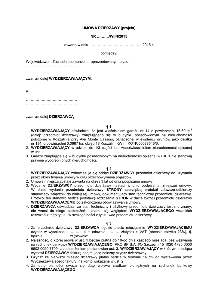 UMOWA DZIERŻAWY (projekt) NR ………./WIiN/2015 zawarta w dniu ……………………………………. 2015 r. pomiędzy: Województwem Zachodniopomorskim, reprezentowanym przez: …………………………………… …………………………………… zwanym dalej WYDZIERŻAWIAJĄCYM, a …………………………………… …………………………………… zwanym dalej DZIERŻAWCĄ. §1 2 1. WYDZIERŻAWIAJĄCY oświadcza, że jest właścicielem garażu nr 14 o powierzchni 16,69 m (dalej: przedmiot dzierżawy) znajdującego się w budynku posadowionym na nieruchomości położonej w Koszalinie przy Alei Monte Cassino, oznaczonej w ewidencji gruntów jako działka nr 134, o powierzchni 0,0667 ha, obręb 18 Koszalin, KW nr KO1K/00088545/6. 2. WYDZIERŻAWIAJĄCY w udziale do 1/3 części jest współwłaścicielem nieruchomości opisanej w ust. 1. 3. Garaże znajdujące się w budynku posadowionym na nieruchomości opisanej w ust. 1 nie stanowią prawnie wyodrębnionych nieruchomości. §2 1. WYDZIERŻAWIAJĄCY zobowiązuje się oddać DZIERŻAWCY przedmiot dzierżawy do używania przez okres trwania umowy w celu przechowywania pojazdów. 2. Umowa niniejsza zostaje zawarta na okres 3 lat od dnia podpisania umowy. 3. Wydanie DZIERŻAWCY przedmiotu dzierżawy nastąpi w dniu podpisania niniejszej umowy. W dacie wydania przedmiotu dzierżawy STRONY sporządzą protokół zdawczo-odbiorczy stanowiący załącznik do niniejszej umowy, dokumentujący stan techniczny przedmiotu dzierżawy. Protokół ten stanowić będzie podstawę rozliczenia STRON w dacie zwrotu przedmiotu dzierżawy WYDZIERŻAWIAJĄCEMU po zakończeniu obowiązywania umowy. 4. DZIERŻAWCA oświadcza, że stan techniczny i użytkowy przedmiotu dzierżawy jest mu znany, nie wnosi do niego zastrzeżeń i zrzeka się względem WYDZIERŻAWIAJĄCEGO wszelkich roszczeń z tego tytułu, w szczególności z tytułu wad przedmiotu dzierżawy. §3 1. Za przedmiot dzierżawy DZIERŻAWCA będzie płacić miesięcznie WYDZIERŻAWIAJĄCEMU czynsz w wysokości ………… zł + (słownie: ……… złotych) + VAT (obecnie stawka 23%), tj. łącznie ………………… zł (słownie: …………………….). 2. Należność, o której mowa w ust. 1 będzie płatna do 10-go dnia każdego miesiąca, bez wezwania na rachunek bankowy WYDZIERŻAWIAJĄCEGO: PKO BP S.A. I/O Szczecin 15 1020 4795 0000 9502 0090 7709, z zastrzeżeniem postanowień ust. 3. WYDZIERŻAWIAJĄCY w każdym miesiącu wystawi DZIERŻAWCY fakturę obejmującą należny czynsz dzierżawny. 3. Czynsz za pierwszy miesiąc dzierżawy płatny będzie w terminie 14 dni od wystawienia przez Wydzierżawiającego faktury, na konto wskazane w ust. 2. 4. Za datę płatności uważa się datę wpływu środków pieniężnych na rachunek bankowy WYDZIERŻAWIAJĄCEGO. 5. W przypadku używania przez DZIERŻAWCĘ przedmiotu dzierżawy na podstawie niniejszej umowy przez niepełny okres rozliczeniowy (miesiąc), WYDZIERŻAWIAJĄCY obciąży DZIERŻAWCĘ czynszem proporcjonalnie do okresu korzystania z nieruchomości w danym miesiącu. 6. Zmiana czynszu spowodowana zmianą stawki VAT nastąpi automatycznie z datą wejścia w życie przepisów zmieniających stawkę tego podatku, bez potrzeby zawierania aneksu do umowy, na podstawie pisemnego powiadomienia przez WYDZIERŻAWIAJĄCEGO. 7. Czynsz wskazany w ust. 1 ulega podwyższeniu jeden raz w roku o wskaźnik wzrostu cen towarów i usług konsumpcyjnych ogłaszany przez Główny Urząd Statystyczny. Pierwsza waloryzacja nastąpi po upływie roku obowiązywania niniejszej umowy, bez potrzeby zawierania aneksu do umowy. §4 1. DZIERŻAWCA zobowiązuje się do ponoszenia wszelkich obciążeń publiczno – prawnych związanych z posiadaniem przedmiotu dzierżawy, a obciążających zgodnie z obowiązującymi przepisami prawa właściciela lub posiadacza nieruchomości, w szczególności terminowego regulowania podatku od nieruchomości. 2. DZIERŻAWCA obowiązany jest bez wezwania niezwłocznie, nie później jednak niż w terminie 14 dni od daty podpisania umowy, a następnie w każdym kolejnym roku kalendarzowym, przesłać WYDZIERŻAWIAJĄCEMU kopię złożonej do właściwego organu podatkowego deklaracji lub informacji obejmującej podatek od nieruchomości. 3. DZIERŻAWCA ponosi wobec WYDZIERŻAWIAJĄCEGO odpowiedzialność za wszelkie szkody wyrządzone w przedmiocie dzierżawy w związku z realizacją niniejszej umowy, choćby powstały z winy osoby trzeciej oraz zobowiązany jest do usunięcia wszelkich szkód powstałych w przedmiocie dzierżawy lub pokrycia kosztów z tym związanych. 4. DZIERŻAWCA zobowiązany jest do ubezpieczenia na własny koszt mienia ruchomego przechowywanego w przedmiocie dzierżawy od ognia, kradzieży z włamaniem i rabunku i innych zdarzeń losowych. §5 DZIERŻAWCA oświadcza, że na konto depozytowe Urzędu Marszałkowskiego Województwa Zachodniopomorskiego o nr 03 1020 4795 0000 9302 0130 2231 wpłacił nie podlegającą oprocentowaniu kaucję zabezpieczającą roszczenia WYDZIERŻAWIAJĄCEGO z tytułu naruszenia postanowień niniejszej umowy, w łącznej kwocie ………… brutto (słownie: …………..), stanowiącą równowartość 3-krotności czynszu, o którym mowa w § 3 ust.1 umowy. Kaucja, po pomniejszeniu o równowartość roszczeń WYDZIERŻAWIAJĄCEGO, podlega zwrotowi, w nominalnej wartości, w terminie 30 dni od daty wygaśnięcia lub rozwiązania umowy. §6 DZIERŻAWCA zobowiązany jest do zapewnienia należytej ochrony przedmiotu dzierżawy. §7 1. DZIERŻAWCA zobowiązuje się do utrzymania na własny koszt przedmiotu dzierżawy przez okres trwania umowy w taki sposób, aby jego poszczególne składniki nie uległy pogorszeniu, z wyjątkiem pogorszenia wynikającego z normalnego zużycia rzeczy. 2. Wszelkie koszty dostosowania przedmiotu dzierżawy do umówionego użytku obciążają DZIERŻAWCĘ bez obowiązku zwrotu przez WYDZIERŻAWIAJĄCEGO ic