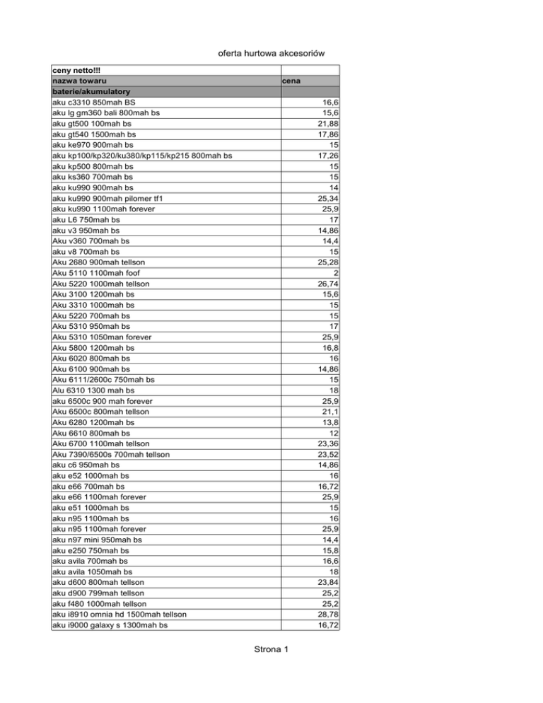 oferta hurtowa akcesoriów ceny netto!!! nazwa towaru baterie/akumulatory aku c3310 850mah BS aku lg gm360 bali 800mah bs aku gt500 100mah bs aku gt540 1500mah bs aku ke970 900mah bs aku kp100/kp320/ku380/kp115/kp215 800mah bs aku kp500 800mah bs aku ks360 700mah bs aku ku990 900mah bs aku ku990 900mah pilomer tf1 aku ku990 1100mah forever aku L6 750mah bs aku v3 950mah bs Aku v360 700mah bs aku v8 700mah bs Aku 2680 900mah tellson Aku 5110 1100mah foof Aku 5220 1000mah tellson Aku 3100 1200mah bs Aku 3310 1000mah bs Aku 5220 700mah bs Aku 5310 950mah bs Aku 5310 1050man forever Aku 5800 1200mah bs Aku 6020 800mah bs Aku 6100 900mah bs Aku 6111/2600c 750mah bs Alu 6310 1300 mah bs aku 6500c 900 mah forever Aku 6500c 800mah tellson Aku 6280 1200mah bs Aku 6610 800mah bs Aku 6700 1100mah tellson Aku 7390/6500s 700mah tellson aku c6 950mah bs aku e52 1000mah bs aku e66 700mah bs aku e66 1100mah forever aku e51 1000mah bs aku n95 1100mah bs aku n95 1100mah forever aku n97 mini 950mah bs aku e250 750mah bs aku avila 700mah bs aku avila 1050mah bs aku d600 800mah tellson aku d900 799mah tellson aku f480 1000mah tellson aku i8910 omnia hd 1500mah tellson aku i9000 galaxy s 1300mah bs cena 16,6 15,6 21,88 17,86 15 17,26 15 15 14 25,34 25,9 17 14,86 14,4 15 25,28 2 26,74 15,6 15 15 17 25,9 16,8 16 14,86 15 18 25,9 21,1 13,8 12 23,36 23,52 14,86 16 16,72 25,9 15 16 25,9 14,4 15,8 16,6 18 23,84 25,2 25,2 28,78 16,72 Strona 1 oferta hurtowa akcesoriów aku i900 1000mah bs aku j600 700mah bs aku j700 800mah bs aku L760 600mah bs aku s3650 foof aku s5330 wave 533, wave 723 1000mah BS aku u600 600mah bs aku u700 600mah bs aku k310 750mah bs aku k700 650mah bs aku k750 700mah bs aku k800 1100mah bs aku k800 1050mah forever aku k850 900mah bs aku w910 800mah bs aku u100 yari/ elm/hazel 1100mah bs aku u900 580mah tel1 aku c45 800 mah bs aku c55 600mah tellson aku c65 700 mah telllson org bateria 6500s BP-5M 9000mah toptel org bateria BL-5C 3100 kieszonki z miękkiego materiału kieszonka chic 3G/i900red kieszonka chic ku900 black kieszonka chic ku900 red kieszonka chic nok 3110 red kieszonka chic nok 5530 red kieszonka chic nok 5800 red kieszonka chic nok 6280 black kieszonka chic nok 6300 black kieszonka chic nok E52 black kieszonka chic nok E52 red kieszonka chic nok E66 black kieszonka chic nok E66 red kieszonka chic nok N97 black kieszonka chic nok X3 blue kieszonka chic nok X3 red kieszonka chic sam I8910black kieszonka chic sam S5230 black kieszonka chic sam S5230 red pokrowiec satynowy na zamek – dedykowany campa htc desire campa wildfire campa smart campa hd2 campa LG gm360 campa LG gt500 campaLG gt540 Campa LG kp500 campa LG ku990 Campa 1616 campa nok 2330 18 15 16 16 13,56 18 17,8 16,8 14 14,86 16,6 16 25,9 16 15 22 16,4 15,04 22,14 23,84 74,7 24,42 4,2 4,2 4,2 4,2 4,2 4,2 4,2 4,2 5,22 5,22 4,2 4,2 4,2 4,2 4,2 4,2 4,2 4,2 15 15 15 15 15 15 15 15 15 15 15 Strona 2 oferta hurtowa akcesoriów campa nok 2700 campa nok 2710 campa nok 3110 Campa 5130 campa nok 5310 campa nok 5530 campa nok 5800 campa nok 6300 campa nok 6303 campa nok 6700 campa nok 6720 campa nok E51 campa nok E52 campa c3 campa c3-01 campa c5 campa c5-03 campa c6 campa n8 campa x2 campa x3-02 campa x6 campa wave 723 campa sam i5700 campa sam i900 campa i9000 campa sam s3650 Campa sam s5230 campa sam s5620 campa sam s8500 wave campa se CEDAR campa se c510 campa se c702 campa se c901 campa se ELM campa se k800 campa x8 campa hazel campa x10mini campa zylo wsuwka ze skóry ekologicznej kolor czarny Wsuwka skóra 3G/i900 black Wsuwka skóra lg ku990 black Wsuwka skóra nok 5230 Wsuwka skóra nok 5530 Wsuwka skóra nok 6300 Wsuwka skóra nok E52 Wsuwka skóra nok E66 Wsuwka skóra nok N82 Wsuwka skóra nok N97 Wsuwka skóra nok X3 Wsuwka skóra sam E250 Wsuwka skóra sam i8910 15 15 15 15 15 15 15 15 15 15 15 15 15 15 15 15 15 15 15 15 15 15 15 15 15 15 15 15 15 15 15 15 15 15 15 15 15 15 15 15 8,5 8,5 8,5 8,5 8,5 8,5 8,5 8,5 8,5 8,5 8,5 8,5 Strona 3 oferta hurtowa akcesoriów Wsuwka skóra se k770 skarpetka chic rozne kolory i wzory portfel ze skóry ekologicznej z klapką dedykowany portfel iphone 4g intertt portfel app 3G/3GS pion portfel HTC DESIRE portfel htc wildfire portfel htc hd2 portfel lg gd510 intert portfel gd510 czerwony portfel gm350 portfel lg km900 arena portfel gt500 portfel LG P500 portfel lg gt505 pion portfel lg kp500 pion portfel kp500 czerwony portfel gt540 telone portfel ku990 telone portfel nok 5230/5800 pion Portfel 5230/5800 czerwony Portfel 5530 pion Portfel 6210 portfel 6500s Portfel 6700 prestige Portfel 6700 czerwony Portfel 7230 telone portfel c3 portfel c3-01 portfel c5 portfel c5-03 portfel c6 portfel c6-01 portfel c7 portfel nok E52 pion portfel e66 pion portfel e7 portfel nok E72 pion portfel n8 prestige portfel n900 pion portfel nok N95 pion portfel n95 8gb portfel n97 portfel n97 mini portfel nokia x2 portfel x2-01 portfel x3 portfel x3-02 portfel x6 portfel b3410 portfel b3410 czerowny portfel i5500 wave portfel sam i5700 pion 8,5 10 8 8 8 8 8 8 8 8 8 8 8 8 8 8 8 8 8 8 8 8 8 8 8 8 8 8 8 8 8 8 8 8 8 8 8 8 8 8 8 8 8 8 8 8 8 8 8 8 8 8 Strona 4 oferta hurtowa akcesoriów portfel i5700 czerwony portfel i5800 portfel sam i8000 pion omnia 2 portfel i8900 omnia hd portfel sam i900 pion portfel i9000 galaxy s portfel i9000 galaxy s czerwony portfel p1000 galaxy tab portfel sam s3650 pion portfel s3650 czerwony portfel sam s5230 pion portfel s5230 avila czerowny portfel s5330 wave 533 portfel s5570 galaxy mini portfel s5620 portfel s5620 czerwony portfel s5830 galaxy ace portfel s8300 portfel s8500 wave portfel s8500 wave biała portfel s8530 wave2 portfel aino portfel u5 vivaz portfel sam satio u1 pion portfel w995 portfel x8 portfel x8 biały portfel se X10 pion portfel x10mini portfel x10mini pro prestige portfel se yari u100 pion portfel elm portfel hazel portfel w100 spiro portfel w20 zylo karty pamięci karta pam. MicroSd +ad 2GB karta pam. MicroSd hc +ad 4GB karta pam. MicroSd hc +ad 8GBkingston reddo