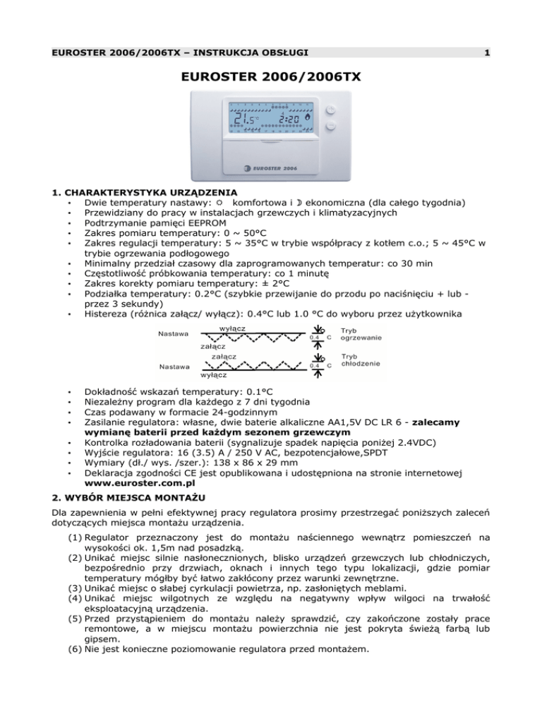 EUROSTER 2006/2006TX – INSTRUKCJA OBSŁUGI 1 EUROSTER 2006/2006TX 1. CHARAKTERYSTYKA URZĄDZENIA • Dwie temperatury nastawy: komfortowa i ekonomiczna (dla całego tygodnia) • Przewidziany do pracy w instalacjach grzewczych i klimatyzacyjnych • Podtrzymanie pamięci EEPROM • Zakres pomiaru temperatury: 0 ~ 50°C • Zakres regulacji temperatury: 5 ~ 35°C w trybie współpracy z kotłem c.o.; 5 ~ 45°C w trybie ogrzewania podłogowego • Minimalny przedział czasowy dla zaprogramowanych temperatur: co 30 min • Częstotliwość próbkowania temperatury: co 1 minutę • Zakres korekty pomiaru temperatury: ± 2°C • Podziałka temperatury: 0.2°C (szybkie przewijanie do przodu po naciśnięciu + lub przez 3 sekundy) • Histereza (różnica załącz/ wyłącz): 0.4°C lub 1.0 °C do wyboru przez użytkownika • • • • • • • • Dokładność wskazań temperatury: 0.1°C Niezależny program dla każdego z 7 dni tygodnia Czas podawany w formacie 24-godzinnym Zasilanie regulatora: własne, dwie baterie alkaliczne AA1,5V DC LR 6 - zalecamy wymianę baterii przed każdym sezonem grzewczym Kontrolka rozładowania baterii (sygnalizuje spadek napięcia poniżej 2.4VDC) Wyjście regulatora: 16 (3.5) A / 250 V AC, bezpotencjałowe,SPDT Wymiary (dł./ wys. /szer.): 138 x 86 x 29 mm Deklaracja zgodności CE jest opublikowana i udostępniona na stronie internetowej www.euroster.com.pl 2. WYBÓR MIEJSCA MONTAŻU Dla zapewnienia w pełni efektywnej pracy regulatora prosimy przestrzegać poniższych zaleceń dotyczących miejsca montażu urządzenia. (1) Regulator przeznaczony jest do montażu naściennego wewnątrz pomieszczeń na wysokości ok. 1,5m nad posadzką. (2) Unikać miejsc silnie nasłonecznionych, blisko urządzeń grzewczych lub chłodniczych, bezpośrednio przy drzwiach, oknach i innych tego typu lokalizacji, gdzie pomiar temperatury mógłby być łatwo zakłócony przez warunki zewnętrzne. (3) Unikać miejsc o słabej cyrkulacji powietrza, np. zasłoniętych meblami. (4) Unikać miejsc wilgotnych ze względu na negatywny wpływ wilgoci na trwałość eksploatacyjną urządzenia. (5) Przed przystąpieniem do montażu należy sprawdzić, czy zakończone zostały prace remontowe, a w miejscu montażu powierzchnia nie jest pokryta świeżą farbą lub gipsem. (6) Nie jest konieczne poziomowanie regulatora przed montażem. EUROSTER 2006/2006TX – INSTRUKCJA OBSŁUGI 2 (7) Nadmiar kabli wsunąć z powrotem w ścianę podczas regulacji położenia urządzenia. W przypadku stwierdzenia przewiewu, szczelinę należy wypełnić niepalnym materiałem. (8) Włożyć baterie zwracając uwagę na biegunowość. Montaż regulatora należy powierzyć wykwalifikowanemu instalatorowi. Nie instalować regulatora posiadającego uszkodzenia mechaniczne. Na przewodach podłączonych do napięcie, groźne dla życia. regulatora może występować niebezpieczne 3. WYGLĄD ZEWNĘTRZNY REGULATORA KORPUS 1. 2. 3. 4. 5. 6. 7. HOLD – włączenie powoduje przejście regulatora w tryb manualny. Regulator utrzymuje nastawioną temperaturę niezależnie od zaprogramowanych ustawień. Kolejne naciśnięcie przycisku HOLD powoduje powrót do programowych nastawień. Temperatura ekonomiczna – włączenie powoduje wskazanie aktualnie ustawionej temperatury ekonomicznej Temperatura komfortowa – włączenie powoduje wskazanie aktualnie ustawionej temperatury komfortowej. Ustawianie zegara. Reset regulatora. Pokrętło wyboru dni tygodnia używane przy programowaniu regulatora. 8. Uniwersalne przyciski nastawy, podwyższenie, obniżenie WYŚWIETLACZ 9. 10. 11. 12. 13. 14. 15. 16. Czasowa zmiana temperatury – przy ręcznej zmianie temperatury przyciskami nastawy pojawia się napis MANUAL. Symbol oznaczający włączenie i pracę urządzenia sterowanego. Wskazanie aktualnej godziny. Aktualny dzień tygodnia, gdzie 1 oznacza poniedziałek a 7 niedzielę, tu: środa. Wskazanie aktualnej temperatury. Oznaczenie godzin w trybie 24 godzinnym. Symbol znajdujący się nad lub pod oznaczeniem godzin określa przedział czasowy pracy regulatora w temperaturze komfortowej. Symbol znajdujący się nad lub pod oznaczeniem godzin określa przedział czasowy pracy regulatora w temperaturze ekonomicznej. EUROSTER 2006/2006TX – INSTRUKCJA OBSŁUGI 3 4. OTWIERANIE REGULATORA Wkrętakiem krzyżowym poluzować wkręt blokujący obudowę. Rozdzielić panel od podstawy zwracając uwagę na zawiasy z prawej strony sterownika. 5. WYBÓR TRYBU PRACY REGULATORA ORAZ WYMIANA BATERII J4. CHŁODZENIE J4 GRZANIE J4. Wybór trybu pracy grzanie lub chłodzenie J1 – wybór czujnika: podłogowy lub powietrzny. Funkcja aktywna jedynie w przypadku ustawienia zworki J4 na grzanie. J1. PODŁOGA regulator jest sterowany sygnałem z czujnika podłogowego J1. POWIETRZE regulator jest sterowany sygnałem z czujnika powietrznego BAT. LO RELAY OFF BAT. LO RELAY OFF Funkcja zabezpieczenia wyłączona Funkcja zabezpieczenia włączona Funkcja zabezpieczenia przed niekontrolowaną pracą urządzenia grzewczego w przypadku spadku napięcia (rozładowania) baterii (nie dotyczy wersji 2006 TX). Włączenie funkcji powoduje automatyczne wyłączenie kontrolowanego urządzenia w przypadku spadku napięcia baterii poniżej 1,4V; przekaźnik zostaje wyłączony (styki NO i COM rozwarte), a pomiar temperatury zatrzymany. Aby włączyć funkcję należy przełączyć zworkę zgodnie z opisem na rysunku obok. Do zasilania regulatora należy stosować wyłącznie baterie alkaliczne typu AA. W szczególności nie należy używać akumulatorów, ponieważ (wskutek samorozładowania) ich czas pracy jest krótszy niż baterii. Przy wymianie zwrócić uwagę na biegunowość. EUROSTER 2006/2006TX – INSTRUKCJA OBSŁUGI 4 6. SCHEMATY PODŁĄCZENIA REGULATORA W układzie ogrzewania podłogowego W układzie z kotłem gazowym W układzie grzewczym/ klimatyzacyjnym 7. REGULACJA HISTEREZY (RÓŻNICA ZAŁ./WYŁ.) 1. Pokrętło ustawić w położeniu START. 
