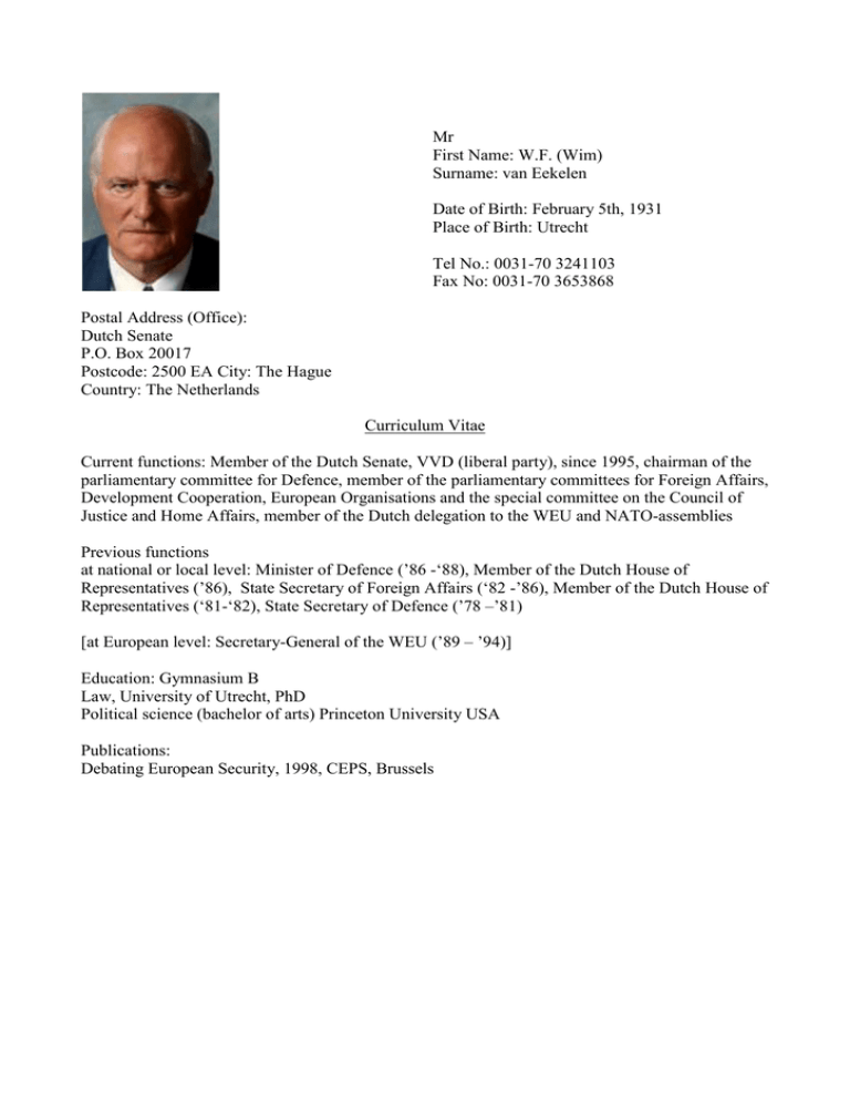 Mr First Name: W.F. (Wim) Surname: van Eekelen Date of Birth: February 5th, 1931 Place of Birth: Utrecht Tel No.: 0031-70 3241103 Fax No: 0031-70 3653868 Postal Address (Office): Dutch Senate P.O. Box 20017 Postcode: 2500 EA City: The Hague Country: The Netherlands Curriculum Vitae Current functions: Member of the Dutch Senate, VVD (liberal party), since 1995, chairman of the parliamentary committee for Defence, member of the parliamentary committees for Foreign Affairs, Development Cooperation, European Organisations and the special committee on the Council of Justice and Home Affairs, member of the Dutch delegation to the WEU and NATO-assemblies Previous functions at national or local level: Minister of Defence (’86 -‘88), Member of the Dutch House of Representatives (’86), State Secretary of Foreign Affairs (‘82 -’86), Member of the Dutch House of Representatives (‘81-‘82), State Secretary of Defence (’78 –’81) [at European level: Secretary-General of the WEU (’89 – ’94)] Education: Gymnasium B Law, University of Utrecht, PhD Political science (bachelor of arts) Princeton University USA Publications: Debating European Security, 1998, CEPS, Brussels