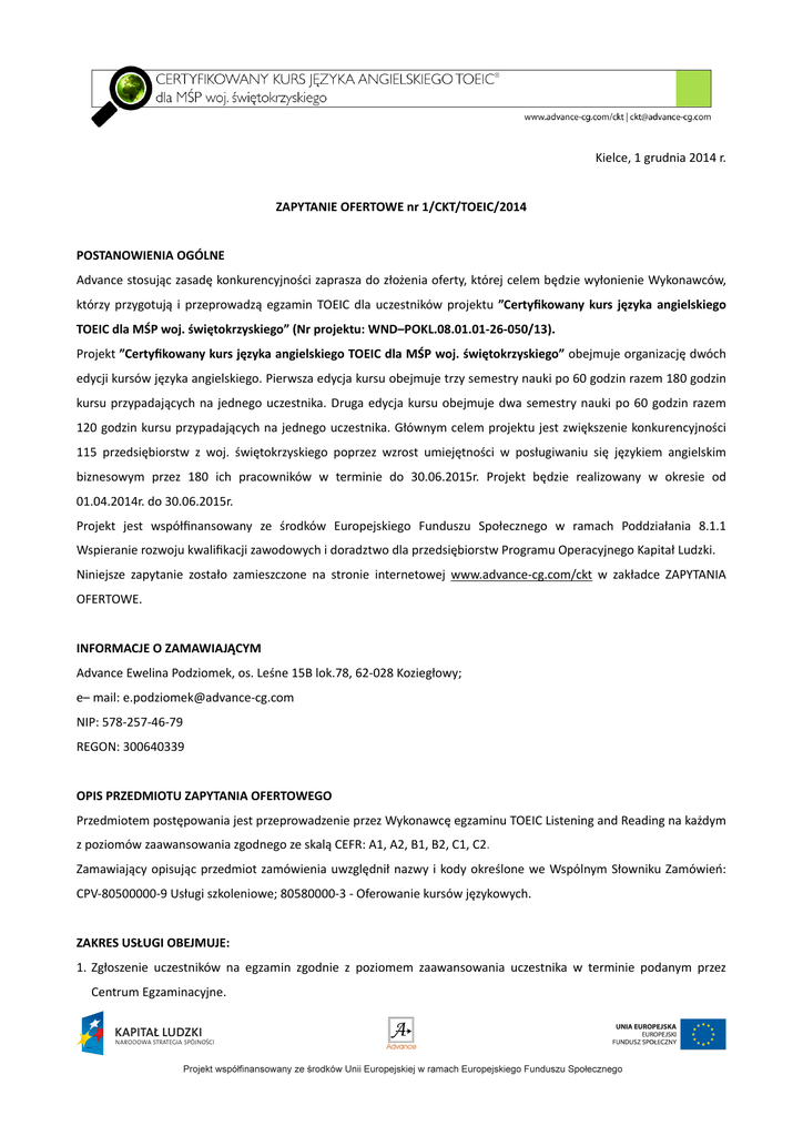 Kielce, 1 grudnia 2014 r. ZAPYTANIE OFERTOWE nr 1/CKT/TOEIC/2014 POSTANOWIENIA OGÓLNE Advance stosując zasadę konkurencyjności zaprasza do złożenia oferty, której celem będzie wyłonienie Wykonawców, którzy przygotują i przeprowadzą egzamin TOEIC dla uczestników projektu ”Certyfikowany kurs języka angielskiego TOEIC dla MŚP woj. świętokrzyskiego” (Nr projektu: WND–POKL.08.01.01-‐26-‐050/13). Projekt ”Certyfikowany kurs języka angielskiego TOEIC dla MŚP woj. świętokrzyskiego” obejmuje organizację dwóch edycji kursów języka angielskiego. Pierwsza edycja kursu obejmuje trzy semestry nauki po 60 godzin razem 180 godzin kursu przypadających na jednego uczestnika. Druga edycja kursu obejmuje dwa semestry nauki po 60 godzin razem 120 godzin kursu przypadających na jednego uczestnika. Głównym celem projektu jest zwiększenie konkurencyjności 115 przedsiębiorstw z woj. świętokrzyskiego poprzez wzrost umiejętności w posługiwaniu się językiem angielskim biznesowym przez 180 ich pracowników w terminie do 30.06.2015r. Projekt będzie realizowany w okresie od 01.04.2014r. do 30.06.2015r. Projekt jest współfinansowany ze środków Europejskiego Funduszu Społecznego w ramach Poddziałania 8.1.1 Wspieranie rozwoju kwalifikacji zawodowych i doradztwo dla przedsiębiorstw Programu Operacyjnego Kapitał Ludzki. Niniejsze zapytanie zostało zamieszczone na stronie internetowej www.advance-‐cg.com/ckt w zakładce ZAPYTANIA OFERTOWE. INFORMACJE O ZAMAWIAJĄCYM Advance Ewelina Podziomek, os. Leśne 15B lok.78, 62-‐028 Koziegłowy; e– mail: e.podziomek@advance-‐cg.com NIP: 578-‐257-‐46-‐79 REGON: 300640339 OPIS PRZEDMIOTU ZAPYTANIA OFERTOWEGO Przedmiotem postępowania jest przeprowadzenie przez Wykonawcę egzaminu TOEIC Listening and Reading na każdym z poziomów zaawansowania zgodnego ze skalą CEFR: A1, A2, B1, B2, C1, C2. Zamawiający opisując przedmiot zamówienia uwzględnił nazwy i kody określone we Wspólnym Słowniku Zamówień: CPV-‐80500000-‐9 Usługi szkoleniowe; 80580000-‐3 -‐ Oferowanie kursów językowych. ZAKRES USŁUGI OBEJMUJE: 1. Zgłoszenie uczestników na egzamin zgodnie z poziomem zaawansowania uczestnika w terminie podanym przez Centrum Egzaminacyjne. 2. Dostarczenie formularzy egzaminacyjnych dla każdego uczestnika na część pisemną egzaminu. 3. Czas przeprowadzenia egzaminów dla poszczególnych poziomów będzie odpowiadał zasadom ustalonym przez ETS Global (Educakonal Teskng Service ). 4. Wykonawca zapewni w ramach realizacji zlecenia sale szkoleniowe i warunki odbywania egzaminu zgodnie z zasadami bezpieczeństwa i higieny pracy. 5. Wykonawca przeprowadzi egzamin TOEIC zgodnie z obowiązującymi w tym zakresie procedurami (w tym w zgodzie z procedurami prowadzenia dokumentacji usługi zgodnie z obowiązującymi normami) oraz wyda uczestnikom certyfikaty. 6. Wykonawca zobowiązany jest do oznaczenia sal, w których będą przeprowadzane egzaminy zgodnie z Wytycznymi w zakresie oznaczania projektów w ramach Programu Operacyjnego Kapitał Ludzki dostępnymi na stronie www. wup.kielce.pl 7. Miejscem wykonania usługi będzie miasto Kielce. WYMOGI W STOSUNKU DO WYKONAWCY: Wykonawca posiada ważną umowę licencyjną z ETS Global lub ważną umowę sublicencyjną, zawartą z licencjonobiorcą ETS Global lub jego instytucją nadrzędną. Wykonawca przeprowadzi egzamin TOEIC odpowiednio dla poziomów: A1, A2, B1, B2, C1, C2 zgodnie ze skalą CEFR. W I edycji kursu do egzaminu przystąpi 9 grup uczestników po 12 osób każda grupa. W II edycji kursu do egzaminu przystąpi 6 grup uczestników po 12 osób każda grupa. Łączna liczba kandydatów przystępujących do egzaminu TOEIC to 180 osób. Egzaminy będą odbywały się w okresie maj-‐czerwiec 2015 r. Wykonawca przeprowadzi egzamin TOEIC zgodnie z obowiązującymi procedurami oraz dostarczy uczestnikom certyfikaty w oryginale, a Zamawiającemu kopie potwierdzone za zgodność z oryginałem. Wykonawca zapewni osobę odpowiedzialną za przeprowadzenie egzaminu, która zna system egzaminów TOEIC łącznie z regulaminem egzaminu i zasadami organizacyjnymi. Wykonawca zapewni licencjonowanego egzaminatora, który posiada ważną licencję wydaną przez ETS Global. PRZYGOTOWANIE OFERTY: a. Każdy z Wykonawców składa jedną ofertę według wzoru stanowiącego Załącznik nr 1 FORMULARZ OFERTOWY wraz z pozostałymi załącznikami. b. Treść oferty musi odpowiadać treści niniejszego zapytania ofertowego. c. Wykonawca może przed upływem terminu składania ofert zmienić lub wycofać ofertę. d. Wykonawca poda kwotę oferty w polskich złotych (PLN), a płatności odbędą się na zasadach szczegółowo określonych w umowie. e. Wykonawca ponosi wszelkie koszty własne związane z przygotowaniem i złożeniem oferty, niezależnie od wyniku postępowania. Zamawiający nie odpowiada za koszty poniesione przez Wykonawcę w związku z przygotowaniem i złożeniem oferty. KONTAKT Z ZAMAWIAJĄCYM Wszelkie pytania związane z przedmiotem postępowania należy kierować drogą elektroniczną, szczegółowych informacji udziela Ewelina Podziomek e.podziomek@advance-‐cg.com TERMIN I MIEJSCE ZŁOZhENIA OFERT Ofertę można przesłać drogą mailową lub dostarczyć osobiście do siedziby Zamawiającego do 15 grudnia 2014r. do godziny 16.00. Advance Ewelina Podziomek, os. Leśne 15B lok.78, 62-‐028 Koziegłowy; e – mail: e.podziomek@advance-‐cg.com ZAKRES WYKLUCZENIA Zakres wykluczenia z niniejszego zapytania ofertowego obejmuje wszystkich oferentów pomiędzy którymi zachodzą powiązania kapitałowe lub osobowe z Zamawiającym, polegające w szczególności na: • uczestniczeniu w spółce jako wspólnik spółki cywilnej lub spółki osobowej; • posiadaniu co najmniej 10% udziałów lub akcji; • pełnieniu funkcji członka organu nadzorczego lub zarządzającego, prokurenta, • pełnomocnika; • pozostawaniu w związku małżeńskim, • w stosunku