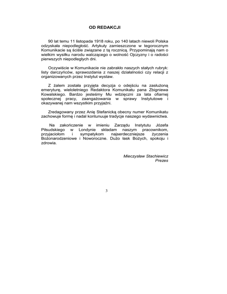 OD REDAKCJI 90 lat temu 11 listopada 1918 roku, po 140 latach niewoli Polska odzyskała niepodległość. Artykuły zamieszczone w tegorocznym Komunikacie są ściśle związane z tą rocznicą. Przypominają nam o wielkim wysiłku narodu walczącego o wolność Ojczyzny i o radości pierwszych niepodległych dni. Oczywiście w Komunikacie nie zabrakło naszych stałych rubryk: listy darczyńców, sprawozdania z naszej działalności czy relacji z organizowanych przez Instytut wystaw. Z żalem została przyjęta decyzja o odejściu na zasłużoną emeryturę, wieloletniego Redaktora Komunikatu pana Zbigniewa Kowalskiego. Bardzo jesteśmy Mu wdzięczni za lata ofiarnej społecznej pracy, zaangażowania w sprawy Instytutowe i okazywanej nam wszystkim przyjaźni. Zredagowany przez Anię Stefanicką obecny numer Komunikatu zachowuje formę i nadal kontunuuje tradycje naszego wydawnictwa. Na zakończenie w imieniu Zarządu Instytutu Józefa Piłsudskiego w Londynie składam naszym pracownikom, przyjaciołom i sympatykom najserdeczniejsze życzenia Bożonarodzeniowe i Noworoczne. Dużo łask Bożych, spokoju i zdrowia. Mieczysław Stachiewicz Prezes 3 CHOINKA Potem kolęda, jedna, druga, Prawie ją cały legion śpiewa, Na niebie gwiazda jakaś mruga, Na ziemi szare szumią drzewa, A kędy spojrzysz w dal po świecie Prószy białego śniegu kwiecie... Noc taka jasna, taka czysta, Nad cichą, senną, Rafajłową, Że choć czasami wiatr zaśwista, Słychać szept każdy, każde słowo, A kędy spojrzysz, w dal po świecie, Prószy białego śniegu kwiecie... Na ziemię w całun owiniętą Księżyc się srebrną patrzy twarzą, Coś – jakby jakieś wielkie święto, Coś – jakby cuda się dziś marzą, Jakby spływała moc tajemna Od brzegów Warty – aż do Niemna! Ustała walka! Z drugiej strony – Także w okopach, w mrocznej dali, Tensam śpiew słychać ulubiony, Wszeregach wroga – u Moskali! I tam kolędy płyną zwrotki Przez śnieżne pola i opłotki...! Świerkowe drzewko ścięte w lesie, Starym zwyczajem, w iskier snopach, Sam major Roja w ręku niesie, Stawia wysoko... na okopach... Aż potem świeczki jasne płoną Nad Rafajłową i Zieloną... K. Łepkowski Szlakiem Legionów 19141915 - Wiedeń 1915 4 SPRAWOZDANIE Z DZIAŁALNOŚCI INSTYTUTU JÓZEFA PIŁSUDSKIEGO W LONDYNIE za okres wrzesień 2007 – wrzesień 2008 Podstawowym celem działalności Instytutu zawsze było i jest nadal stanie na straży prawdy historycznej i przekazywanie jej następnym pokoleniom, zgodnie z przykazaniem Marszałka Józefa Piłsudskiego, że „ten kto nie szanuje i nie ceni swojej przeszłości, ten nie jest godzień szacunku teraźniejszości, ani nie ma prawa do przyszłości”.1 Zadanie to Instytut wypełnia między innymi przez udostępnianie swoich zbiorów muzealnych, archiwalnych i bibliotecznych jak najszerszemu kręgowi odbiorców. W ciągu ostatniego roku Instytut był zawsze otwarty dla zwiedzających Muzeum we wtorki i czwartki, w czasie świąt narodowych oraz, po wcześniejszym ustaleniu, w każdym innym terminie. Po Muzeum Instytutu oprowadzał grupy i osoby indywidualne Prezes Mieczysław Stachiewicz i vice-prezes Wojciech Ludwig. Pan W. Ludwig, który objął pieczę nad Muzeum Instytutu rozpoczął dokładne opisywanie obiektów wystawionych w sali muzealnej i opracował krótki Przewodnik po Muzeum Instytutu w którym zamieszczone są niepublikowane wcześniej zdjęcia eksponatów, oraz wiele ciekawostek z nimi związanych. Przewodnik jest do nabycia w Instytucie. W naszej Księdze Gości odnotowano 234 podpisy. Najwięcej było gości z Kraju, ale Muzeum zwiedzali również Anglicy, Amerykanie, Czesi, Irlandczycy, Japończycy, Kanadyjczycy, Portugalczycy oraz goście z Austrii i Francji. Wpisy w Księdze Gości są często bardzo wzruszające i pełne wdzięczności za możliwość obejrzenia pamiątek przechowywanych w Instytucie. „Kochani w Instytucie – Trwajcie!” – napisał Tadeusz 1 J. Piłsudski “Przemówienie w Wilnie” 20.04.1922. 5 Kłuszewski z Kopenhagi, a 16-letni Bartek podsumował swoją wizytę krótkim „Nawet fajnie tu, jak na wystawę”. Uczniowie ze Szczecina zwiedzają Instytut Oficjalne wizyty złożyli nam m.in.: Tomasz Merta – podsekretarz stanu w Ministerstwie Kultury i Dziedzictwa Narodowego, Janusz Kurtyka – prezes Instytutu Pamięci Narodowej, ppłk Jacek Adamski z Atachatu Obrony, Stanisław Radoń z Naczelnej Dyrekcji Archiwów Państwowych, Peter Devitt – z Muzeum Lotnictwa w Hendon. Wśród wycieczek wymienić należy gości Stałej Konferencji Muzeów, Archiwów i Bibliotek Polskich na Zachodzie, którzy podczas londyńskich obrad znaleźli czas na odwiedzenie Instytutu, wycieczkę uczniów z Liceum w Ustce, grupę młodzieży z Liceum Ogólnokształcącego w Szczecinie, czy chór I Liceum Ogólnokształcącego w Głubczycach. Oprócz stałej ekspozycji muzealnej Instytut przygotował w ostatnim czasie cztery okolicznościowe wystawy. 6 Ze względu na ogromną szczególnie popularność, wśród uczniów polskich szkół sobotnich, jeszcze w styczniu br. można było oglądać, otwartą w listopadzie 2007 r., wystawę p.t. „Legiony Polskie 1914-1918”. Na prośbę uczniów z polskiej szkoły sobotniej PutneyWimbledon wystawa została jeszcze raz zaprezentowana, Uczniowie z polskiej szkoły sobotniej specjalnie dla nich w czerwcu. Putney-Wimbledon Wszyscy uczniowie zwiedzający wystawę otrzymali przygotowany przez A. Stefanicką skrypt z pytaniami, który cieszył się dużym zainteresowaniem. W marcu 2008 r. w Galerii POSK została wyeksponowana kolekcja unikalnych map historycznych z XVI, XVII i XVIII wieku. Wystawa Map w Galerii POSK-u Uzupełnieniem wystawy był komplet map sztabowych przedwojennej Polski w skali 1:100 000. 7 „To uczta dla historyków i ciekawostka dla zwiedzających. Kolorowe i czarno-białe, większe i mniejsze, głównie te, pokazujące terytoria dawnej Polski. Ale nie tylko” – napisał w