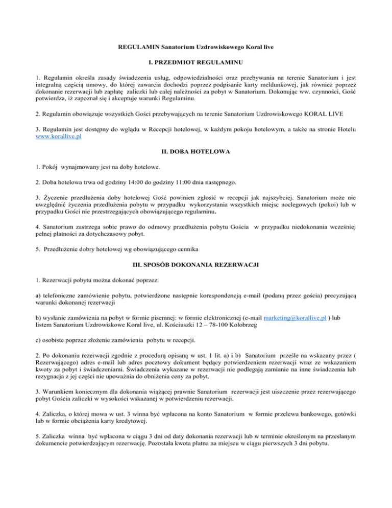 REGULAMIN Sanatorium Uzdrowiskowego Koral live I. PRZEDMIOT REGULAMINU 1. Regulamin określa zasady świadczenia usług, odpowiedzialności oraz przebywania na terenie Sanatorium i jest integralną częścią umowy, do której zawarcia dochodzi poprzez podpisanie karty meldunkowej, jak również poprzez dokonanie rezerwacji lub zapłatę zaliczki lub całej należności za pobyt w Sanatorium. Dokonując ww. czynności, Gość potwierdza, iż zapoznał się i akceptuje warunki Regulaminu. 2. Regulamin obowiązuje wszystkich Gości przebywających na terenie Sanatorium Uzdrowiskowego KORAL LIVE 3. Regulamin jest dostępny do wglądu w Recepcji hotelowej, w każdym pokoju hotelowym, a także na stronie Hotelu www.korallive.pl II. DOBA HOTELOWA 1. Pokój wynajmowany jest na doby hotelowe. 2. Doba hotelowa trwa od godziny 14:00 do godziny 11:00 dnia następnego. 3. Życzenie przedłużenia doby hotelowej Gość powinien zgłosić w recepcji jak najszybciej. Sanatorium może nie uwzględnić życzenia przedłużenia pobytu w przypadku wykorzystania wszystkich miejsc noclegowych (pokoi) lub w przypadku Gości nie przestrzegających obowiązującego regulaminu. 4. Sanatorium zastrzega sobie prawo do odmowy przedłużenia pobytu Gościa w przypadku niedokonania wcześniej pełnej płatności za dotychczasowy pobyt. 5. Przedłużenie dobry hotelowej wg obowiązującego cennika III. SPOSÓB DOKONANIA REZERWACJI 1. Rezerwacji pobytu można dokonać poprzez: a) telefoniczne zamówienie pobytu, potwierdzone następnie korespondencją e-mail (podaną przez gościa) precyzującą warunki dokonanej rezerwacji b) wysłanie zamówienia na pobyt w formie pisemnej: w formie elektronicznej (e-mail [email protected] ) lub listem Sanatorium Uzdrowiskowe Koral live, ul. Kościuszki 12 – 78-100 Kołobrzeg c) osobiste poprzez złożenie zamówienia pobytu w recepcji. 2. Po dokonaniu rezerwacji zgodnie z procedurą opisaną w ust. 1 lit. a) i b) Sanatorium prześle na wskazany przez ( Rezerwującego) adres e-mail lub adres pocztowy dokument będący potwierdzeniem rezerwacji wraz ze wskazaniem kwoty za pobyt i świadczeniami. Świadczenia wykazane w rezerwacji nie podlegają zamianie na inne świadczenia lub rezygnacja z jej części nie upoważnia do obniżenia ceny za pobyt. 3. Warunkiem koniecznym dla dokonania wiążącej prawnie Sanatorium rezerwacji jest uiszczenie przez rezerwującego pobyt Gościa zaliczki w wysokości wskazanej w potwierdzeniu rezerwacji. 4. Zaliczka, o której mowa w ust. 3 winna być wpłacona na konto Sanatorium w formie przelewu bankowego, gotówki lub w formie obciążenia karty kredytowej. 5. Zaliczka winna być wpłacona w ciągu 3 dni od daty dokonania rezerwacji lub w terminie określonym na przesłanym dokumencie potwierdzającym rezerwację. Pozostała kwota płatna na miejscu w ciągu pierwszych 3 dni pobytu. 6. W przypadku braku wpłaty zaliczki w określonym terminie, bądź braku środków na karcie kredytowej, rezerwacja zostanie anulowana. 7. Za datę dokonania zaliczki uznaje się datę uznania rachunku bankowego. Wpłaty prosimy kierować na nr rachunku bankowego Sanatorium Koral live : w PLN : Konto bankowe PKO BP 49 1020 2821 0000 1802 0098 8832 w Euro : SWIFT : BP KO PLPW IBAN: PL 55 1020 2821 0000 1102 0098 8873 z dopiskiem : nr rezerwacji lub terminu i nazwiska osoby korzystającej z pobytu IV. ANULOWANIE REZERWACJI 1. W przypadku rezygnacji z zarezerwowanego pobytu: a) 50% wartości zaliczki - w przypadku rezygnacji zgłoszonej do 30 dni przed rozpoczęciem pobytu b) 30% wartości zaliczki - w przypadku rezygnacji zgłoszonej na mniej niż 30 dni przed rozpoczęciem pobytu c) zaliczka nie podlega zwrotowi - w przypadku rezygnacji w terminie krótszym niż 14 dni przed rozpoczęciem pobytu. d) w przypadku, gdy Gość nie pojawi się w Sanatorium w dniu planowanego przyjazdu do godziny 20:00 bez wcześniejszej informacji odnośnie późniejszego przyjazdu - Sanatorium ma prawo zatrzymania zaliczki a także prawo do wynajęcia zarezerwowanego pokoju innej osobie, która jest zainteresowana pobytem w Sanatorium w tym terminie. W przypadku gdy Gość mimo potwierdzenia przyjazdu po godzinie 20:00, nie pojawi się w Hotelu do dnia następnego, do godziny 10 wpłacona zaliczka nie podlega zwrotowi. e) w przypadku, gdy zwrot następuje na konto zagraniczne, Sanatorium dodatkowo odlicza koszty związane z opłatami bankowymi. 2. Anulowanie rezerwacji jest możliwa tylko na piśmie , tj.w formie listu lub formie elektronicznej na adres e-mail: [email protected] i [email protected]. 3. Zwrotu zaliczki, w sytuacji o której mowa w ust. 1 lit. a) i b) Sanatorium dokonuje w formie przelewu na wskazany przez Rezerwującego rachunek bankowy po uprzednim otrzymaniu przez Sanatorium podpisanej przez rezerwującego faktury korygującej. 4. W przypadku skrócenia pobytu, Sanatorium nie zwraca opłaty za pozostały czas zarezerwowanego pobytu. 5. Zapłata za pobyt następuje w ciągu 3 dni od rozpoczęcia pobytu. 6. Gość wyraża zgodę na przechowywanie i przetwarzanie danych osobowych zgodnie z ustawą o ochronie danych osobowych (Dz. U. z 2002 r. nr 101, poz. 926 z późniejszymi zmianami) przez Sanatorium Uzdrowiskowego KORAL LIVE z siedzibą w Kołobrzegu przy ul. Kościuszki 12 dla potrzeb niezbędnych do realizacji pobytu Gościa w Sanatorium, korzystania przez Gościa z pozostałych usług świadczonych przez Hotel. Gość ma prawo wglądu do swoich danych osobowych oraz ich korygowania.
