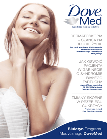 DERMATOSKOPIA – SZANSA NA DRUGIE ŻYCIE lek. med. Magdalena Misiak-Gałązka Klinika Dermatologiczna Warszawskiego Uniwersytetu Medycznego JAK OSWOIĆ PACJENTA W GABINECIE – O SYNDROMIE BIAŁEGO FARTUCHA Agata Wilska, psycholog, SP ZOZ MSW w Łodzi, Centrum Rozwoju Holis ZMIANY SKÓRNE W PRZEBIEGU CUKRZYCY Prof. dr hab. n. med. Ewa Otto-Buczkowska Biuletyn Programu Medycznego DoveMed Szanowni Państwo, Nowy rok to zwykle nowe wyzwania, ale i nowe możliwości, z których warto skorzystać. Życzymy Państwu zatem optymizmu i realizacji planów zarówno zawodowych, jak i prywatnych. Mamy nadzieję, że wszystkie zamierzone przez Państwa cele zamienią się w rzeczywisty sukces, a trudności i przeszkody w dążeniu do niego staną się jedynie motorem do podejmowania efektywniejszych działań. Noworoczny biuletyn DoveMed poświęciliśmy różnorodnej tematyce, ale tematem wiodącym w tym numerze są „Zmiany skórne w przebiegu cukrzycy” autorstwa prof. dr hab. n. med. Ewy Otto-Buczkowskiej. Pani Profesor jest autorką 250 prac naukowych w czasopismach krajowych i zagranicznych oraz współautorem 13 podręczników, w tym 3 zagranicznych z zakresu diabetologii, endokrynologii i pediatrii. Oprócz tego Pani Profesor była jednym z pierwszych organizatorów opieki diabetologicznej nad młodocianymi chorymi na cukrzycę w Polsce. W biuletynie odnajdą Państwo również tematy związane z prawem medycznym, zarządzaniem w placówkach oraz psychologią w artykule „Jak oswoić pacjenta w gabinecie – o syndromie białego fartucha”. Dodatkowy materiał dermatologiczny dotyczy dermatoskopii i zabiegów wykonywanych tą techniką. Zachęcamy również do lektury artykułu „Portret lekarza na misji medycznej”, z którego dowiecie się Państwo, jakimi cechami charakteru muszą odznaczać się lekarze w tak trudnych warunkach oraz z jakimi problemami borykają się na co dzień. Do siego roku i miłej lektury życzy Redakcja biuletynu DoveMed! Spis Treści 4Temat numeru Zmiany skórne w przebiegu cukrzycy Prof. dr hab. n. med. Ewa Otto-Buczkowska 11Dla lekarzy rodzinnych Prawa pacjenta, kiedy coś pójdzie nie tak. Odpowiedzialność cywilna Radca Prawny Katarzyna Przyborowska 14Lekarz po godzinach Portret lekarza na misji medycznej Redakcja 17Psychologia Jak oswoić pacjenta w gabinecie – o syndromie białego fartucha Agata Wilska, psycholog SP ZOZ MSW w Łodzi, Centrum Rozwoju Holis 20Lekarz po godzinach Zostań managerem placówki. Co pomoże Ci wejść na wyższy poziom? Redakcja 23Dla dermatologów Dermatoskopia. Szansa na drugie życie Lek. med. Magdalena Misiak-Gałązka Klinika Dermatologiczna Warszawskiego Uniwersytetu Medycznego Zmiany skórne w przebiegu cukrzycy Wśród licznych wielonarządowych powikłań cukrzycy, zmiany skórne obserwowane u chorych na cukrzycę są częste. Zwykle częstość występowania manifestacji skórnych cukrzycy oceniana jest na 30-50% chorych na cukrzycę, dotyczy to także dzieci i młodzieży z cukrzycą. Zmiany skórne towarzyszące cukrzycy charaktery- chromatoza. Klasyfikacja schorzeń dermatologicznych zują się dużą różnorodnością. Pojawiają się zwykle towarzyszących cukrzycy jest trudna z uwagi na ich po ujawnieniu cukrzycy, czasami po wielu latach jej złożony, a często jeszcze niedostatecznie wyjaśniony trwania, ale niekiedy mogą także poprzedzać rozwój patomechanizm. tej choroby. Ponieważ skóra jest narządem bogatym cesie nieenzymatycznej glikacji prowadzi do rozwoju Choroby związane z mikroangiopatią i zwyrodnieniem włókien tkanki łącznej powikłań cukrzycowych o charakterze mikroangiopatii Suchość skóry i pogrubienie skóry i makroangiopatii oraz zmian w obwodowych włók- Choć mechanizm powstawania wielu typowych dla cu- nach nerwowych. krzycy schorzeń skóry nie został do końca wyjaśniony, w białka tkanki łącznej uszkodzenie tych białek w pro- uważa się, że w ich rozwoju znaczącą rolę odgrywają Z uwagi na etiologię zmiany skórne towarzyszące związane z nieenzymatyczną glikacją białek zaburze- oraz większa niż średnia grubość, która może przyczy- Obumieranie tłuszczowate skóry (Necrobiosis lipo- cukrzycy można podzielić na: nia krążenia obwodowego, zwyrodnienie włókien kola- nić się do zmniejszenia elastyczności. idica diabeticorum) 1. Choroby związane z mikroangiopatią i zwyrodnie- genowych i elastycznych, uszkodzenie obwodowego Jest chorobą rzadką, związaną głównie z cukrzycą układu nerwowego, a także upośledzenie komórko- Świąd skóry typu I. Występuje częściej u kobiet. Może wyprze- 2. choroby skory związane z angiopatią i neuropatią; wych i humoralnych mechanizmów obronnych. Jest mało swoistym, ale częstym objawem cukrzycy. Może dzić pojawienie się cukrzycy (około 30% chorych), 3. choroby infekcyjne skóry; W wyniku tych zaburzeń skóra ulega pogrubieniu, sta- występować jako świąd uogólniony lub świąd ograniczo- może być rozpoznane równocześnie z cukrzycą (oko- 4. skórne odczyny polekowe. je się sucha, zmniejsza się jej elastyczność, zwiększa ny. Świąd uogólniony najczęściej pojawia się u pacjentów ło 25% chorych), może wystąpić także w trakcie jej się wrażliwość na urazy mechaniczne, upośledzeniu starszych, często jest wczesnym sygnałem do rozpozna- trwania (około 45% pacjentów). Zmiany chorobowe Do schorzeń niezwiązanych bezpośrednio z cukrzycą, ulegają procesy regeneracyjne, a także zwiększa się nia cukrzycy. Świąd ograniczony lokalizuje się najczęściej mają postać wyraźnie odgraniczonych plam, począt- ale stosunkowo często z nią współistniejących należy podatność na zakażenia bakteryjne i grzybicze. w okolicy odbytu i narządów moczowo-płciowych i jest kowo różowo-brunatnych, później barwy żółtawej np. bielactwo nabyte, rogowacenie ciemne, lipo- Suchość skóry jest jednym z pierwszych objawów cu- związany ze stanami zapalnymi skóry, s