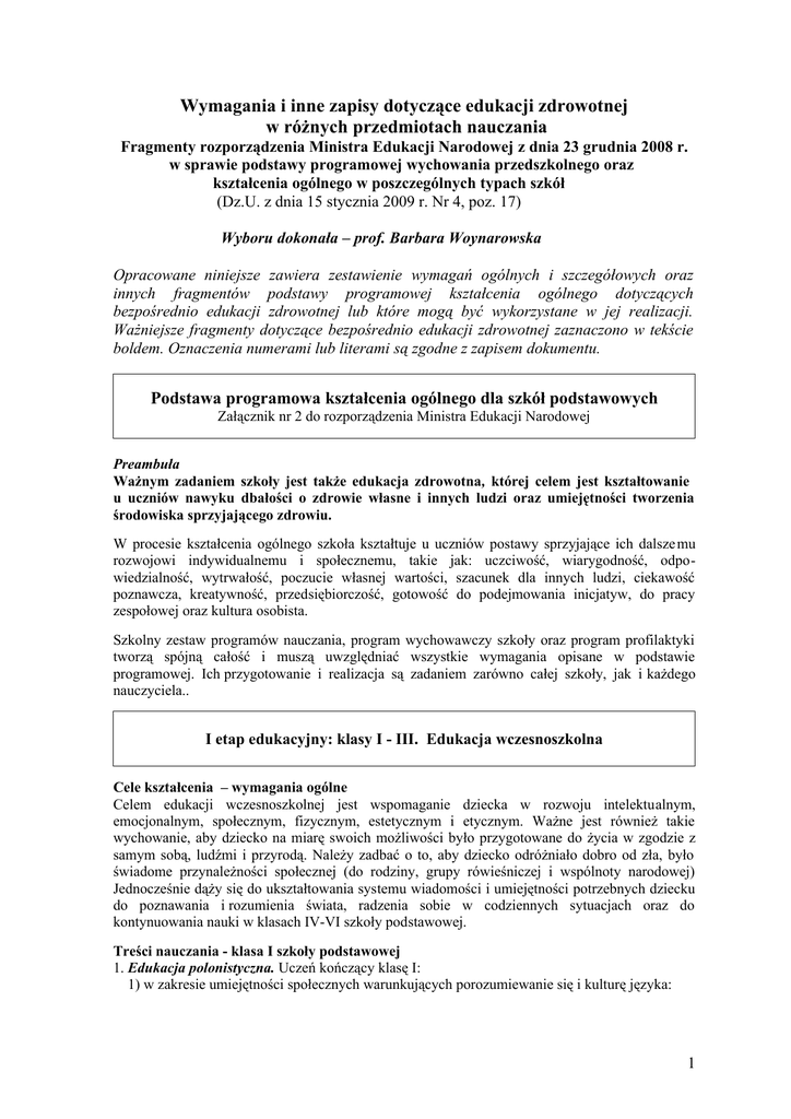 Wymagania i inne zapisy dotyczące edukacji zdrowotnej w różnych przedmiotach nauczania Fragmenty rozporządzenia Ministra Edukacji Narodowej z dnia 23 grudnia 2008 r. w sprawie podstawy programowej wychowania przedszkolnego oraz kształcenia ogólnego w poszczególnych typach szkół (Dz.U. z dnia 15 stycznia 2009 r. Nr 4, poz. 17) Wyboru dokonała – prof. Barbara Woynarowska Opracowane niniejsze zawiera zestawienie wymagań ogólnych i szczegółowych oraz innych fragmentów podstawy programowej kształcenia ogólnego dotyczących bezpośrednio edukacji zdrowotnej lub które mogą być wykorzystane w jej realizacji. Ważniejsze fragmenty dotyczące bezpośrednio edukacji zdrowotnej zaznaczono w tekście boldem. Oznaczenia numerami lub literami są zgodne z zapisem dokumentu. Podstawa programowa kształcenia ogólnego dla szkół podstawowych Załącznik nr 2 do rozporządzenia Ministra Edukacji Narodowej Preambuła Ważnym zadaniem szkoły jest także edukacja zdrowotna, której celem jest kształtowanie u uczniów nawyku dbałości o zdrowie własne i innych ludzi oraz umiejętności tworzenia środowiska sprzyjającego zdrowiu. W procesie kształcenia ogólnego szkoła kształtuje u uczniów postawy sprzyjające ich dalsze mu rozwojowi indywidualnemu i społecznemu, takie jak: uczciwość, wiarygodność, odpowiedzialność, wytrwałość, poczucie własnej wartości, szacunek dla innych ludzi, ciekawość poznawcza, kreatywność, przedsiębiorczość, gotowość do podejmowania inicjatyw, do pracy zespołowej oraz kultura osobista. Szkolny zestaw programów nauczania, program wychowawczy szkoły oraz program profilaktyki tworzą spójną całość i muszą uwzględniać wszystkie wymagania opisane w podstawie programowej. Ich przygotowanie i realizacja są zadaniem zarówno całej szkoły, jak i każdego nauczyciela.. I etap edukacyjny: klasy I - III. Edukacja wczesnoszkolna Cele kształcenia – wymagania ogólne Celem edukacji wczesnoszkolnej jest wspomaganie dziecka w rozwoju intelektualnym, emocjonalnym, społecznym, fizycznym, estetycznym i etycznym. Ważne jest również takie wychowanie, aby dziecko na miarę swoich możliwości było przygotowane do życia w zgodzie z samym sobą, ludźmi i przyrodą. Należy zadbać o to, aby dziecko odróżniało dobro od zła, było świadome przynależności społecznej (do rodziny, grupy rówieśniczej i wspólnoty narodowej) Jednocześnie dąży się do ukształtowania systemu wiadomości i umiejętności potrzebnych dziecku do poznawania i rozumienia świata, radzenia sobie w codziennych sytuacjach oraz do kontynuowania nauki w klasach IV-VI szkoły podstawowej. Treści nauczania - klasa I szkoły podstawowej 1. Edukacja polonistyczna. Uczeń kończący klasę I: 1) w zakresie umiejętności społecznych warunkujących porozumiewanie się i kulturę języka: 1 a) obdarza uwaga dzieci i dorosłych, słucha ich wypowiedzi […]; komunikuje w jasny sposób swoje spostrzeżenia, potrzeby, odczucia b) w kulturalny sposób zwraca się do rozmówcy, [….] dostosowuje ton głosu do sytuacji np. nie mówi zbyt głośno 5. Edukacja społeczna. Wychowanie do zgodnego współdziałania z rówieśnikami i dorosłymi. Uczeń kończący klasę I: 1) potrafi odróżnić, co jest dobre, a co złe w kontaktach z dorosłymi i rówieśnikami, wie, że warto być odważnym, mądrym i pomagać potrzebującym; wie, ze nie należy kłamać lub zatajać prawdy; 2) współpracuje z innymi w zabawie, w nauce szkolnej i w sytuacjach życiowych; przestrzega reguł obowiązujących w społeczności dziecięcej oraz w świecie dorosłych, grzecznie zwraca się do innych w szkole, w domu i na ulicy; 3) wie, co wynika z przynależności do swojej rodziny, jakie są relacje między najbliższymi, wywiązuje się z powinności wobec nich; 5) zna zagrożenia ze strony ludzi; wie, do kogo i w jaki sposób należy się zwrócić o pomoc; 6) wie, gdzie można bezpiecznie organizować zabawy, a gdzie nie można i dlaczego; 6. Edukacja przyrodnicza. Wychowanie do rozumienia i poszanowania przyrody ożywionej i nieożywionej. Uczeń kończący klasę I: 1) w zakresie rozumienia i poszanowania świata roślin i zwierząt: e) zna zagrożenia dla środowiska przyrodniczego ze strony człowieka: wypalanie łąk i ściernisk, zatruwanie powietrza i wód, pożary lasów, wyrzucanie odpadów i spalanie śmieci itp.; chroni przyrodę: nie śmieci, szanuje rośliny, zachowuje ciszę w parku i w lesie, pomaga zwierzętom przetrwać zimę i upalne lato; f) zna zagrożenia ze strony zwierząt (niebezpieczne i chore zwierzęta) i roślin (np. trujące owoce, liście, grzyby) i wie jak zachować się w sytuacji zagrożenia; g) wie, że należy segregować śmieci; rozumie sens stosowania opakowań ekologicznych; 8. Zajęcia komputerowe 2) wie jak trzeba korzystać z komputera, żeby nie narażać własnego zdrowia. a) b) c) 9. Zajęcia techniczne. Wychowanie do techniki (poznawanie urządzeń, obsługiwanie i szanowanie ich) i działalność konstrukcyjna dzieci. Uczeń kończący klasę I: 2) w zakresie dbałości o bezpieczeństwo własne i innych: a) utrzymuje porządek wokół siebie (na swoim stoliku, w sali zabaw, szatni i w ogrodzie), sprząta po sobie i pomaga innym w utrzymywaniu porządku, b) zna zagrożenia wynikające z niewłaściwego używania narzędzi i urządzeń technicznych, c) wie, jak należy bezpiecznie poruszać się na drogach (w tym na rowerze) i korzystać ze środków komunikacji; wie, jak należy zachować się w sytuacji wypadku, np. umie powiadomić dorosłych, zna telefony alarmowe. 10. Wychowanie fizyczne. Kształtowanie sprawności fizycznej dzieci i edukacja zdrowotna. Uczeń kończący klasę I: 1) uczestniczy w zajęciach rozwijających sprawność fizyczną, zgodnie z regułami; 2) potrafi: chwytać piłkę, rzucać nią do celu i na odległość, toczyć i kozłować piłkę, pokonywać przeszkody naturalne i sztuczne, wykonywać ćwiczenia równ