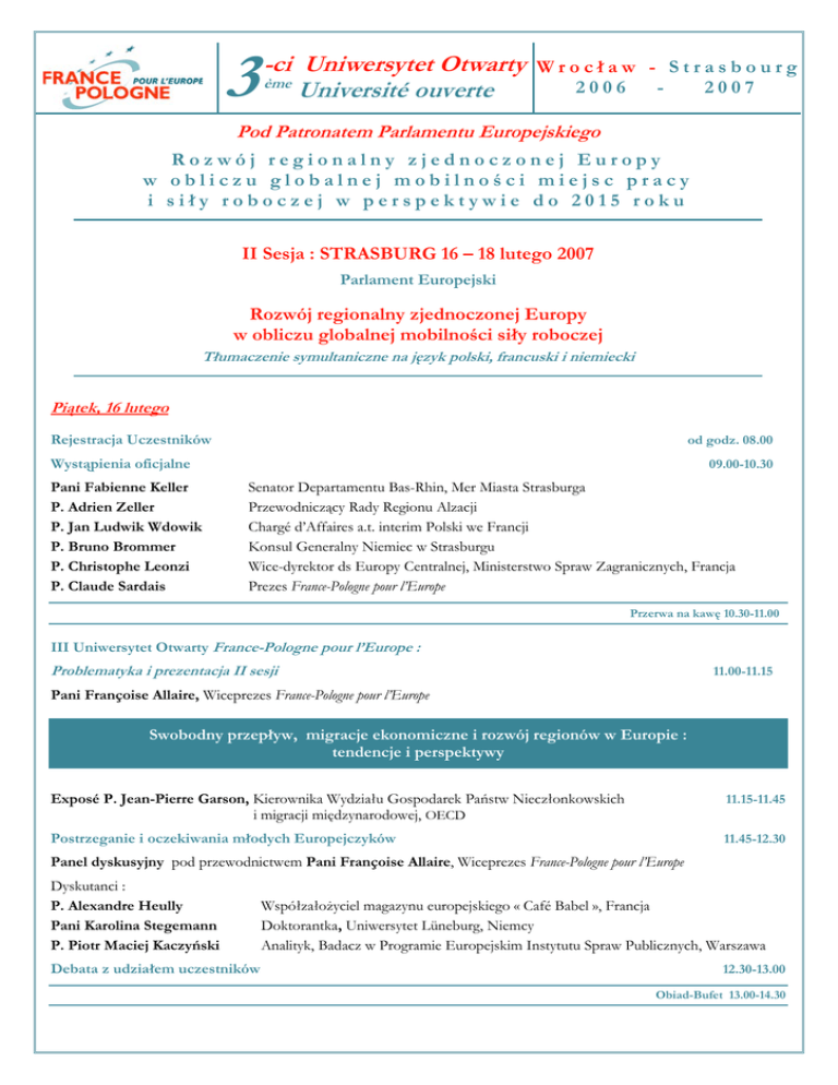 3 -ci Uniwersytet Otwarty ème Université ouverte Wrocław - Strasbourg 2006 2007 Pod Patronatem Parlamentu Europejskiego Rozwój regionalny zjednoczonej Europy w obliczu globalnej mobilności miejsc pracy i siły roboczej w perspektywie do 2015 roku II Sesja : STRASBURG 16 – 18 lutego 2007 Parlament Europejski Rozwój regionalny zjednoczonej Europy w obliczu globalnej mobilności siły roboczej Tłumaczenie symultaniczne na język polski, francuski i niemiecki Piątek, 16 lutego Rejestracja Uczestników od godz. 08.00 Wystąpienia oficjalne Pani Fabienne Keller P. Adrien Zeller P. Jan Ludwik Wdowik P. Bruno Brommer P. Christophe Leonzi P. Claude Sardais 09.00-10.30 Senator Departamentu Bas-Rhin, Mer Miasta Strasburga Przewodniczący Rady Regionu Alzacji Chargé d’Affaires a.t. interim Polski we Francji Konsul Generalny Niemiec w Strasburgu Wice-dyrektor ds Europy Centralnej, Ministerstwo Spraw Zagranicznych, Francja Prezes France-Pologne pour l’Europe Przerwa na kawę 10.30-11.00 III Uniwersytet Otwarty France-Pologne pour l’Europe : Problematyka i prezentacja II sesji 11.00-11.15 Pani Françoise Allaire, Wiceprezes France-Pologne pour l’Europe Swobodny przepływ, migracje ekonomiczne i rozwój regionów w Europie : tendencje i perspektywy Exposé P. Jean-Pierre Garson, Kierownika Wydziału Gospodarek Państw Nieczłonkowskich i migracji międzynarodowej, OECD 11.15-11.45 Postrzeganie i oczekiwania młodych Europejczyków 11.45-12.30 Panel dyskusyjny pod przewodnictwem Pani Françoise Allaire, Wiceprezes France-Pologne pour l’Europe Dyskutanci : P. Alexandre Heully Pani Karolina Stegemann P. Piotr Maciej Kaczyński Debata z udziałem uczestników Współzałożyciel magazynu europejskiego « Café Babel », Francja Doktorantka, Uniwersytet Lüneburg, Niemcy Analityk, Badacz w Programie Europejskim Instytutu Spraw Publicznych, Warszawa 12.30-13.00 Obiad-Bufet 13.00-14.30 Przewodniczy : P. Jacques Brierre, Członek Zarządu France-Pologne pour l’Europe Europejski Rok Mobilności Pracowników – bilans, perspektywy 14.30-14.50 P. Joseph Jamar, Komisja Europejska, DG ds Zatrudnienia, koordynator Europejskiego Roku mobilności Pracowników Debata ze studentami « Master w dziedzinie Polityk Europejskich», Uniwersytet R. Schumana, Strasburg 14.50-15.30 Przedsiębiorstwa transnarodowe a dialog społeczny 15.30-15.45 P. Laurent Zylberberg, Dyrektor ds międzynarodowych stosunków społecznych, France-Telecom Debata z udziałem uczestników 15.45-16.10 Przerwa na kawę 16.10-16.40 Wyzwania polityk migracyjnych w Europie : Zmiany demograficzne w Europie i na świecie 16.40-17.00 Wprowadzenie P. Jakub Bijak, Ekspert w SFBM (Środkowoeuropejskie Forum Badań Migracyjnych) Polska Ku europejskiemu stanowisku w zarządzaniu napływem migracyjnym 17.00-17.45 Panel dyskusyjny pod przewodnictwem P. Jacques Brierre, Członka Zarządu France-Pologne pour l’Europe Udział wezmą : Yves Chassard Kierownik dep. Pracy, Kształcenia w Centrum analiz strategii, Francja Ursula Engelen-Kefer Ekspert ds polityki rynku pracy w niemieckiej narodowej Agencji Pracy Kazimierz Kuberski Podsekretarz Stanu, Ministerstwo Pracy i Polityki Społecznej, Polska Debata z udziałem uczestników 17.45-18.30 Podsumowanie pierwszego dnia obrad 18.30-19.00 Pani Gesine Schwan, Rektor Uniwersytetu „Europa Viadrina”, Frankfurt n/Odrą, Niemcy 20.00 Przyjęcie wydane przez Panią F. Keller, Senator, Mer Strasburga, w Hôtel de Ville Sobota, 17 lutego Wprowadzenie w życie wolnego przepływu i sprzyjanie tworzeniu europejskiego rynku pracy Przewodniczy : P. Jan Robert Suesser, Członek Zarządu France-Pologne pour l’Europe Postępy i trudności w realizacji wolnego przepływu Grupa robocza n° 1 : 9.00-10.30 Grupa robocza n° 2 : 9.00-10.30 Praca w obszarach przygranicznych : laboratorium mobilności w Europie Europejski system kwalifikacji i certyfikacji zawodowych : ostatnie postępy i perspektywy Moderator : P. Jan Robert Suesser, Członek Zarządu France-Pologne pour l’Europe Pod wspólnym przewodnictwem : P. Günther Petry, Starosty Kehl Pani Elżbieta Maly, Eksperta INTEREG III, Polska- Niemcy EURES Transgraniczny Dyskutanci : P. Alain Delmas, Sekretarz generalny CGT Akwitania, Członek Europejskiego Komitetu Ekonomiczno-Społecznego Pani Katrin Distler, Dyrektor biura DGB ds. Współpracy przygranicznej, Offenburg Moderator : P. Jacques Brierre, Członek Zarządu France-Pologne pour l’Europe Pod przewodnictwem : P. Ilias Sotirchos, Komisja Europejska, DG Edukacja, Kształcenie Zawodowe i Edukacja Dorosłych Dyskutanci : Pani Stanisława Golinowska, Dyrektor Instytutu Zdrowia Publicznego w Krakowie Pani Brigitte Mathis, Zastępca Dyrektora Regionalnego ds. Zatrudnienia i kształcenia zawodowego w Regionie Alzacji Pani Bärbel Höltzen-Schoh, Dyrektor Niemieckiej Agencji Pracy, Offenburg, Przerwa na kawę 10.30-11.00 Grupa robocza n° 3 : 11.00-12.30 Oddelegowywanie w ramach świadczenia usług i dyrektywy usług Moderator : P. Jan Robert Suesser, Członek Zarządu France-Pologne pour l’Europee Pod przewodnictwem : P. Jean-François Perrin, Dyrektora Regionalnego ds. zatrudnienia i kształcenia zawodowego w Regionie Alzacji Dyskutanci : Pani Agnieszka Czupryniak, II sekretarz, Wydział Ekonomiczny Ambasady RP we Francje Pani Joanna Unterschutz, dział zagraniczny, specjalista, Komisja krajowa NSZZ Solidarność Grupa robocza n° 4: 11.00-12h.30 Mobilność młodych Europejczyków Moderator : P. Jacques Brierre, Członek Zarządu France-Pologne pour l’Europe Pod przewodnictwem : Pani Kamila Meller-Gruszka, Fundacja polsko-niemiecka kształcąca kadrę w dziedzinie ekonomii, Niemcy Dyskutanci : Pani Anna Czubinski, Studentka « Polityki i sprawy publiczne w Europie », Nauki Polityczne, Strasburg P. Andreas Heindl, Sekretarz Generalny « Citizens of Europe », Niemcy Dr Anna Kwiatkiewicz, Wykładowca w Szkole Głównej Handlowej (SGH), Konsultant BPI, Warszawa P. Klaus-Heinrich Standke, Przewodniczący 