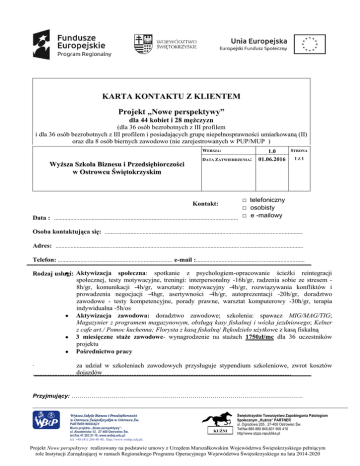KARTA KONTAKTU Z KLIENTEM Projekt „Nowe perspektywy” dla 44 kobiet i 28 mężczyzn (dla 36 osób bezrobotnych z III profilem i dla 36 osób bezrobotnych z III profilem i posiadających grupę niepełnosprawności umiarkowaną (II) oraz dla 8 osób biernych zawodowo (nie zarejestrowanych w PUP/MUP ) WERSJA: Wyższa Szkoła Biznesu i Przedsiębiorczości w Ostrowcu Świętokrzyskim DATA ZATWIERDZENIA: STRONA 1.0 01.06.2016 1 Z 1 □ telefoniczny □ osobisty □ e -mailowy Data : .................................................................................................................................................................... Kontakt: Osoba kontaktująca się: ................................................................................................................................... Adres: .................................................................................................................................................................... Telefon: ............................................................................ e-mail :........................................................................ Rodzaj usługi: Aktywizacja społeczna: spotkanie z psychologiem-opracowanie ścieżki reintegracji społecznej, testy motywacyjne, treningi: interpersonalny -16h/gr, radzenia sobie ze stresem 8h/gr, komunikacji -4h/gr, warsztaty: motywacyjny -4h/gr, rozwiązywania konfliktów i prowadzenia negocjacji -4hgr, asertywności -4h/gr, autoprezentacji -20h/gr, doradztwo zawodowe - testy kompetencyjne, porady prawne, warsztat komputerowy -30h/gr, terapia indywidualna -5h/os Aktywizacja zawodowa: doradztwo zawodowe; szkolenia: spawacz MIG/MAG/TIG; Magazynier z programem magazynowym, obsługą kasy fiskalnej i wózka jezdniowego; Kelner z cafe art./ Pomoc kuchenna; Florysta z kasą fiskalną/ Rękodzieło użytkowe z kasą fiskalną 3 miesięczne staże zawodowe- wynagrodzenie na stażach 1750zł/mc dla 36 uczestników projektu Pośrednictwo pracy . za udział w szkoleniach zawodowych przysługuje stypendium szkoleniowe, zwrot kosztów dojazdów .......................................................................................................................................................... Przyjmujący: ……………………………………………………………………………………………………. Wyższa Szkoła Biznesu i Przedsiębiorczości w Ostrowcu Świętokrzyskim w Ostrowcu Św. PARTNER WIODĄCY Biuro projektu „Nowe perspektywy”: ul. Akademicka 12, 27-400 Ostrowiec Św. tel./fax 41 263 21 10, www.wsbip.edu.pl tel. +48 (41) 260 40 40, http://www.wsbip.edu.pl; KUŹNI A Świętokrzyskie Towarzystwo Zapobiegania Patologiom Społecznym „Kuźnia” PARTNER ul. Ogrodowa 205 , 27-400 Ostrowiec Św. Tel/fax:885 885 845,601 505 410 http//www.stzps.republika.pl Projekt Nowe perspektywy realizowany na podstawie umowy z Urzędem Marszałkowskim Województwa Świętokrzyskiego pełniącym role Instytucji Zarządzającej w ramach Regionalnego Programu Operacyjnego Województwa Świętokrzyskiego na lata 2014-2020
