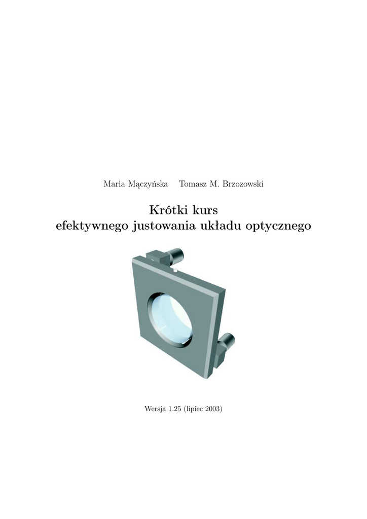 Maria Mączyńska Tomasz M. Brzozowski Krótki kurs efektywnego justowania układu optycznego Wersja 1.25 (lipiec 2003) Efektywnego justowania można nauczyć się jedynie justując, ale kilka dobrych rad może okazać się przydatnych. Poniższy zbiór wskazówek ma za zadanie ułatwić czytelnikowi opanowanie podstawowych technik justowania. Mogą się one co prawda wydać oczywiste, ale jak pokazuje praktyka – są bardzo pomocne. Stosowanie się do nich z pewnością ułatwi pracę przy stole optycznym i sprawi, że jej efekty będą bardziej przewidywalne i powtarzalne. 1 Prowadzenie wiązki Po pierwsze, należy dbać aby tam, gdzie jest to możliwe, wiązka laserowa była kierowana wzdłuż odcinków wyznaczonych przez otwory w stole (tak zwane justowanie „po dziurach”). Mając w ten sposób ustawioną wiązkę łatwiej jest wstawiać w tor optyczny kolejne elementy. Takie justowanie zapewnia też powtarzalność ustawień elementów optycznych. Należy również dbać o zachowanie stałej wysokości wiązki nad stołem (w naszych eksperymentach 8.5 oraz 10 cm). 1.1 Dwa lusterka (zygzak) Do odpowiedniego ustawienia wiązki na zadanym odcinku używa się najczęściej dwóch lusterek ustawionych tak, jak pokazuje rysunek 1.1. Należy najpierw dobrać wstępnie położenia obu lusterek (tak, aby wiązka padała mniej więcej na środek każdego z nich) i ich kąty względem kierunku rozchodzenia się wiązki (45◦ ). Jest to łatwiejsze jeśli wiązka kierowana jest nad otworami w stole, jak zalecono uprzednio. W przypadku skomplikowanego układu optycznego wygodnie jest zapewnić możliwość niezależnego justowania poszczególnych jego części. Pozwala to na wprowadzenie modyfikacji w jednej części tak, że nie pociąga to za sobą justowania całego układu. Konieczny jest zatem układ dostosowujący między częściami, który pozwoli na dowolne ustawienie kierunku i położenia wiązki laserowej. Zadanie to spełnia właśnie opisany wyżej prosty układ dwóch lusterek (zygzak). Rysunek 1: Zygzaki 1.2 Przesłony W ustawiany odcinek toru wygodnie jest wstawić dwie przesłony tak, aby ich otwory znajdowały się w miejscach, przez które chcemy przeprowadzić wiązkę. Pierwsza przesłona powinna znajdować się jak najbliżej drugiego lusterka zygzaka, a druga jak najdalej od niego (dokładność wyjustowania rośnie z odległością). Za drugą przesłoną wygodnie jest ustawić karteczkę 2 czułą na podczerwień. Zmieniając kąty ustawienia pierwszego lusterka dążymy do tego, aby wiązka przeszła przez pierwszą przesłonę. Następnie drugim lusterkiem próbujemy przeprowadzić wiązkę przez drugą przesłonę aż do momentu, kiedy zacznie ona przycinać się na pierwszej przesłonie. Wtedy należy ponownie zmienić ustawienie pierwszego lusterka tak, aby skierować wiązkę przez pierwszą przesłonę i powtarzać iteracyjnie procedurę opisaną w dwóch ostatnich zdaniach aż do momentu, gdy wiązka będzie przechodzić przez obie przesłony jednocześnie. To oznacza koniec justowania zadanego odcinka. Skrótowo: pierwsze lusterko – pierwsza przesłona, drugie lusterko – druga przesłona. 1.3 Karteczki Przesłony można zastąpić papierowymi karteczkami. Pierwsza z nich musi mieć na zadanej wysokości zrobiony niewielki otwór (porównywalny ze średnicą wiązki) i być wstawiona w tor wiązki analogicznie, jak pierwsza przesłona (wygodnie jest, gdy otwór w karteczce znajduje się nad otworem w stole wyznaczającym tor rozchodzenia się wiązki). Na drugiej należy zaznaczyć kropką punkt, w który powinna trafić prawidłowo wyjustowana wiązka. Warto zrobić na karteczkach kratkowaną podziałkę. Justując zygzak przeprowadza się wiązkę przez otwór w pierwszej karteczce (pierwsze lusterko) naprowadzając jednocześnie wiązkę na zaznaczony punkt na drugiej karteczce (drugie lusterko). Mając pewną wprawę można używać do justowania tylko jednej karteczki z zaznaczonym punktem, wstawiając ja w zadany tor wiązki na przemian blisko i daleko od zygzaka i korygując położenie wiązki na karteczce odpowiednio pierwszym i drugim lusterkiem. 1.4 Jedno lusterko Czasem w tor wiązki można wstawić tylko jedno jedno lusterko. Należy wtedy odpowiednio ustawić przesłony lub karteczki a następnie korygować tor wiązki blisko lusterka poprzez jego przesuwanie prostopadle lub równolegle do kierunku wiązki padającej na lusterko. Korektę toru wiązki w obszarze daleko od lusterka przeprowadza się przez jego delikatny obrót, tak jak pokazuje rysunek 1.4. Tę procedurę powtarza się iteracyjnie aż wiązka zostanie wyjustowana. Rysunek 2: Prowadzenie wiązki przy pomocy jednego lusterka. 3 2 Wstawianie w tor wiązki soczewki W wiązkę równoległą soczewkę wstawia się stroną wypukłą (lub wklęsłą) do wiązki, w wiązkę zbieżną rozbieżną – stroną płaską do wiązki. Takie ustawienie minimalizuje wady soczewek. Soczewka nie może być skręcona względem kierunku rozchodzenia się wiązki, chyba że chcemy korygować astygmatyzm (sekcja 5). Wstawienie soczewki w tor wiązki nie powinno zmienić kierunku jej rozchodzenia się. Najłatwiej to sprawdzić ustawiając karteczkę możliwie daleko za miejscem, w którym będzie umieszczona soczewka. Na karteczce zaznaczamy położenie wiązki bez soczewki, a następnie tak wstawiamy soczewkę, aby położenie centrum wiązki pokryło się z zaznaczeniem. 3 Wstawianie w tor wiązki modulatora akusto-optycznego Modulator akusto-optyczny (AOM) wstawia się w ognisko soczewki o stosunkowo długiej ogniskowej (500 mm, 1000 mm), co sprawia, że wiązka w całości mieści się w aperturze modulatora, a w obszarze kryształu jest w przybliżeniu równoległa (soczewki o długich ogniskowych zapewniają dużą długość Rayleigha wiązki gaussowskiej). Położenie ogniska łatwo znaleźć zmniejszając moc wiązki lasera i szukając punktu, w którym wiązka jest najbardziej intensywna