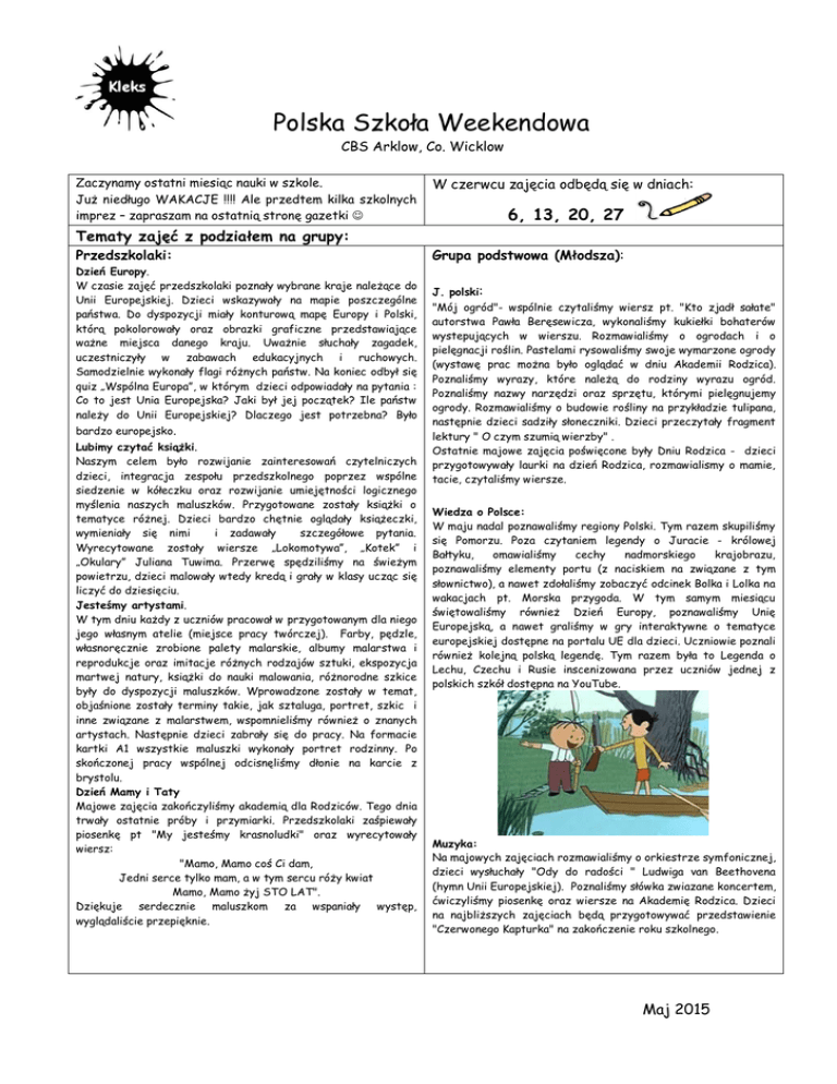 Polska Szkoła Weekendowa CBS Arklow, Co. Wicklow Zaczynamy ostatni miesiąc nauki w szkole. Już niedługo WAKACJE !!!! Ale przedtem kilka szkolnych imprez – zapraszam na ostatnią stronę gazetki W czerwcu zajęcia odbędą się w dniach: 6, 13, 20, 27 Tematy zajęć z podziałem na grupy: Przedszkolaki: Dzień Europy. W czasie zajęć przedszkolaki poznały wybrane kraje należące do Unii Europejskiej. Dzieci wskazywały na mapie poszczególne państwa. Do dyspozycji miały konturową mapę Europy i Polski, którą pokolorowały oraz obrazki graficzne przedstawiające ważne miejsca danego kraju. Uważnie słuchały zagadek, uczestniczyły w zabawach edukacyjnych i ruchowych. Samodzielnie wykonały flagi różnych państw. Na koniec odbył się quiz „Wspólna Europa”, w którym dzieci odpowiadały na pytania : Co to jest Unia Europejska? Jaki był jej początek? Ile państw należy do Unii Europejskiej? Dlaczego jest potrzebna? Było bardzo europejsko. Lubimy czytać książki. Naszym celem było rozwijanie zainteresowań czytelniczych dzieci, integracja zespołu przedszkolnego poprzez wspólne siedzenie w kółeczku oraz rozwijanie umiejętności logicznego myślenia naszych maluszków. Przygotowane zostały książki o tematyce różnej. Dzieci bardzo chętnie oglądały książeczki, wymieniały się nimi i zadawały szczegółowe pytania. Wyrecytowane zostały wiersze „Lokomotywa”, „Kotek” i „Okulary” Juliana Tuwima. Przerwę spędziliśmy na świeżym powietrzu, dzieci malowały wtedy kredą i grały w klasy ucząc się liczyć do dziesięciu. Jesteśmy artystami. W tym dniu każdy z uczniów pracował w przygotowanym dla niego jego własnym atelie (miejsce pracy twórczej). Farby, pędzle, własnoręcznie zrobione palety malarskie, albumy malarstwa i reprodukcje oraz imitacje różnych rodzajów sztuki, ekspozycja martwej natury, książki do nauki malowania, różnorodne szkice były do dyspozycji maluszków. Wprowadzone zostały w temat, objaśnione zostały terminy takie, jak sztaluga, portret, szkic i inne związane z malarstwem, wspomnieliśmy również o znanych artystach. Następnie dzieci zabrały się do pracy. Na formacie kartki A1 wszystkie maluszki wykonały portret rodzinny. Po skończonej pracy wspólnej odcisnęliśmy dłonie na karcie z brystolu. Dzień Mamy i Taty Majowe zajęcia zakończyliśmy akademią dla Rodziców. Tego dnia trwały ostatnie próby i przymiarki. Przedszkolaki zaśpiewały piosenkę pt "My jesteśmy krasnoludki" oraz wyrecytowały wiersz: "Mamo, Mamo coś Ci dam, Jedni serce tylko mam, a w tym sercu róży kwiat Mamo, Mamo żyj STO LAT". Dziękuje serdecznie maluszkom za wspaniały występ, wyglądaliście przepięknie. Grupa podstwowa (Młodsza): J. polski: "Mój ogród"- wspólnie czytaliśmy wiersz pt. "Kto zjadł sałate" autorstwa Pawła Beręsewicza, wykonaliśmy kukiełki bohaterów wystepujących w wierszu. Rozmawialiśmy o ogrodach i o pielęgnacji roślin. Pastelami rysowaliśmy swoje wymarzone ogrody (wystawę prac można było oglądać w dniu Akademii Rodzica). Poznaliśmy wyrazy, które należą do rodziny wyrazu ogród. Poznaliśmy nazwy narzędzi oraz sprzętu, którymi pielęgnujemy ogrody. Rozmawialiśmy o budowie rośliny na przykładzie tulipana, następnie dzieci sadziły słoneczniki. Dzieci przeczytały fragment lektury " O czym szumią wierzby" . Ostatnie majowe zajęcia poświęcone były Dniu Rodzica - dzieci przygotowywały laurki na dzień Rodzica, rozmawialismy o mamie, tacie, czytaliśmy wiersze. Wiedza o Polsce: W maju nadal poznawaliśmy regiony Polski. Tym razem skupiliśmy się Pomorzu. Poza czytaniem legendy o Juracie - królowej Bałtyku, omawialiśmy cechy nadmorskiego krajobrazu, poznawaliśmy elementy portu (z naciskiem na związane z tym słownictwo), a nawet zdołaliśmy zobaczyć odcinek Bolka i Lolka na wakacjach pt. Morska przygoda. W tym samym miesiącu świętowaliśmy również Dzień Europy, poznawaliśmy Unię Europejską, a nawet graliśmy w gry interaktywne o tematyce europejskiej dostępne na portalu UE dla dzieci. Uczniowie poznali również kolejną polską legendę. Tym razem była to Legenda o Lechu, Czechu i Rusie inscenizowana przez uczniów jednej z polskich szkół dostępna na YouTube. Muzyka: Na majowych zajęciach rozmawialiśmy o orkiestrze symfonicznej, dzieci wysłuchały "Ody do radości " Ludwiga van Beethovena (hymn Unii Europejskiej). Poznaliśmy słówka zwiazane koncertem, ćwiczyliśmy piosenkę oraz wiersze na Akademię Rodzica. Dzieci na najbliższych zajęciach będą przygotowywać przedstawienie "Czerwonego Kapturka" na zakończenie roku szkolnego. Maj 2015 Polska Szkoła Weekendowa CBS Arklow, Co. Wicklow Grupa średnio – zaawansowna (Starsza): J. polski: Maj rozpoczęliśmy od zakrętów ortografii. Uczniowie pracując nad wierszem „O kozie na mrozie” sami formułowali zasadę ortograficzną „o” i „ó”. Równocześnie uczniowie uczyli się korzystać z tradycyjnego jak i dostępnych w internecie słowników ortograficznych. W tym miesiącu również wzbogacaliśmy słownictwo związane z jedzeniem na mieście. Dzieci uczyły się odmiany, mówiły co lubią a czego nie lubią jeść. Pod koniec zajęć odgrywaliśmy scenki z restauracji. Każdy uczeń opracowywał restauracyjne menu. Uczyliśmy się też o chronologii wydarzeń. Na postawie tekstu „Ronja córka zbójnika” uczyliśmy się co to jest opowiadanie i tego jak zbudować własne opowiadanie. Aby ćwiczyć umięjętność głośnego czytania pracowaliśmy nad tekstem „Nieudane święto”. Uczniowie mówili o uczuciu rozczarowania, zastanawiali się w jakich sytuacjach tak się czują. Na koniec zajęć, uczniowie powtórzyli sobie jak zredagować treść życzeń i samodzielnie przygotowali laurki dla rodziców z okazji Dnia Mamy i Taty. Wiedza o Polsce: W maju, poza świętowaniem Dnia Europy i poznawaniem Unii Europejskiej, skupiliśmy się na tematach związanyc