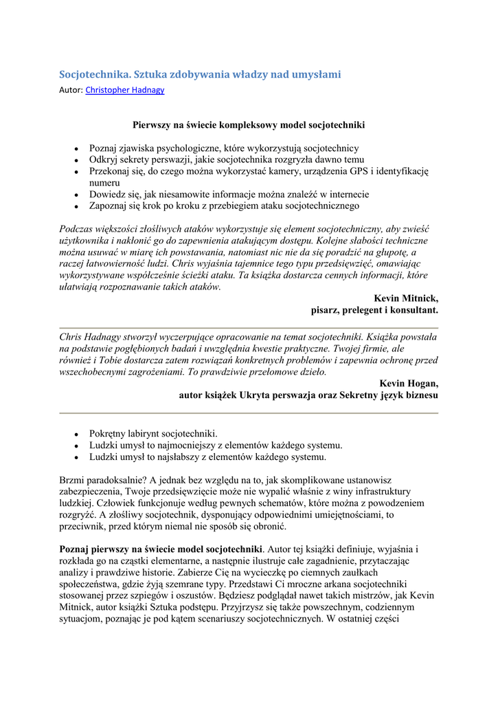 Socjotechnika. Sztuka zdobywania władzy nad umysłami Autor: Christopher Hadnagy Pierwszy na świecie kompleksowy model socjotechniki Poznaj zjawiska psychologiczne, które wykorzystują socjotechnicy Odkryj sekrety perswazji, jakie socjotechnika rozgryzła dawno temu Przekonaj się, do czego można wykorzystać kamery, urządzenia GPS i identyfikację numeru Dowiedz się, jak niesamowite informacje można znaleźć w internecie Zapoznaj się krok po kroku z przebiegiem ataku socjotechnicznego Podczas większości złośliwych ataków wykorzystuje się element socjotechniczny, aby zwieść użytkownika i nakłonić go do zapewnienia atakującym dostępu. Kolejne słabości techniczne można usuwać w miarę ich powstawania, natomiast nic nie da się poradzić na głupotę, a raczej łatwowierność ludzi. Chris wyjaśnia tajemnice tego typu przedsięwzięć, omawiając wykorzystywane współcześnie ścieżki ataku. Ta książka dostarcza cennych informacji, które ułatwiają rozpoznawanie takich ataków. Kevin Mitnick, pisarz, prelegent i konsultant. Chris Hadnagy stworzył wyczerpujące opracowanie na temat socjotechniki. Książka powstała na podstawie pogłębionych badań i uwzględnia kwestie praktyczne. Twojej firmie, ale również i Tobie dostarcza zatem rozwiązań konkretnych problemów i zapewnia ochronę przed wszechobecnymi zagrożeniami. To prawdziwie przełomowe dzieło. Kevin Hogan, autor książek Ukryta perswazja oraz Sekretny język biznesu Pokrętny labirynt socjotechniki. Ludzki umysł to najmocniejszy z elementów każdego systemu. Ludzki umysł to najsłabszy z elementów każdego systemu. Brzmi paradoksalnie? A jednak bez względu na to, jak skomplikowane ustanowisz zabezpieczenia, Twoje przedsięwzięcie może nie wypalić właśnie z winy infrastruktury ludzkiej. Człowiek funkcjonuje według pewnych schematów, które można z powodzeniem rozgryźć. A złośliwy socjotechnik, dysponujący odpowiednimi umiejętnościami, to przeciwnik, przed którym niemal nie sposób się obronić. Poznaj pierwszy na świecie model socjotechniki. Autor tej książki definiuje, wyjaśnia i rozkłada go na cząstki elementarne, a następnie ilustruje całe zagadnienie, przytaczając analizy i prawdziwe historie. Zabierze Cię na wycieczkę po ciemnych zaułkach społeczeństwa, gdzie żyją szemrane typy. Przedstawi Ci mroczne arkana socjotechniki stosowanej przez szpiegów i oszustów. Będziesz podglądał nawet takich mistrzów, jak Kevin Mitnick, autor książki Sztuka podstępu. Przyjrzysz się także powszechnym, codziennym sytuacjom, poznając je pod kątem scenariuszy socjotechnicznych. W ostatniej części znajdziesz "tajemne" porady i wskazówki profesjonalnych socjotechników, a czasem również prawdziwych przestępców. Sekrety oszustów i socjotechników Model komunikacji i jego geneza Wykorzystywanie wpływu alkoholu Wchodzenie w rolę, czyli jak zostać tym, kim chcesz Sztuczki socjotechniczne — psychologiczne zasady stosowane w socjotechnice Programowanie neurolingwistyczne (NLP) Pięć podstaw wywierania wpływu Tworzenie programu podnoszenia świadomości osobistych zagrożeń Wyczulenie na złośliwe taktyki Dalajlama i socjotechnika Christopher Hadnagy jest głównym twórcą www.social-engineer.org, pierwszego modelu socjotechniki. Dysponuje więcej niż czternastoletnim doświadczeniem w branży systemów zabezpieczeń oraz IT. Współpracował z zespołem www.backtrack-linux.org i brał udział w licznych projektach związanych z bezpieczeństwem. Pracuje również jako szkoleniowiec i główny socjotechnik w grupie penetracyjnej Offensive Security. Spis treści: O autorze (7) O redaktorze technicznym (7) Przedmowa (9) Wstęp i podziękowania (13) 1. Rzut oka na świat socjotechniki (17) Z czego wynika wartość tej książki (19) Socjotechnika - przegląd zagadnienia (26) Podsumowanie (40) 2. Gromadzenie informacji (41) Gromadzenie informacji (44) Źródła gromadzonych informacji (53) Tworzenie modelu komunikacji (63) Zalety modeli komunikacji (74) 3. Wywoływanie (77) Na czym polega wywoływanie? (78) Cele wywoływania (81) Jak opanować technikę wywoływania? (99) Podsumowanie (101) 4. Wchodzenie w rolę, czyli jak zostać kimkolwiek (103) Na czym polega wchodzenie w rolę? (104) Zasady wchodzenia w rolę oraz etapy planowania roli (106) Przykłady skutecznego wchodzenia w rolę (120) Podsumowanie (129) 5. Sztuczki socjotechniczne - psychologiczne zasady stosowane w socjotechnice (131) Tryby myślenia (133) Mikroekspresje (141) Programowanie neurolingwistyczne (NLP) (169) Rozmowa i przesłuchanie (178) Sprawne budowanie wspólnej płaszczyzny porozumienia (200) Przepełnienie bufora u człowieka (212) Podsumowanie (218) 6. Wywieranie wpływu, czyli siła perswazji (221) Pięć podstaw wywierania wpływu (222) Taktyki wywierania wpływu (228) Ramowanie, czyli zmiana rzeczywistości (260) Manipulacja, czyli kontrolowanie ofiary (280) Manipulacja w socjotechnice (297) Podsumowanie (307) 7. Narzędzia socjotechnika (309) Narzędzia fizyczne (310) Internetowe narzędzia gromadzenia informacji (328) Podsumowanie (348) 8. Analizy przypadków. Socjotechnika rozłożona na czynniki pierwsze (349) Przypadek Mitnicka nr 1. Atak na wydział komunikacji (350) Przypadek Mitnicka nr 2. Atak na system ubezpieczeń społecznych (357) Przypadek Hadnagy'ego nr 1. Nadmiernie pewny siebie dyrektor generalny (362) Przypadek Hadnagy'ego nr 2. Skandal w parku rozrywki (370) Tajny przypadek nr 1. Misja nie tak do końca niewykonalna (376) Tajny przypadek nr 2. Socjotechniczny atak na hakera (384) Dlaczego warto analizować przypadki (391) Podsumowanie (392) 9. Zapobieganie atakom socjotechnicznym i ograniczanie ich skutków (393) Doskonalenie umiejętności rozpoznawania ataku socjotechnicznego (394) Tworzenie programu podnoszenia świadomości osobistych zagrożeń (396) Uświadamianie ludziom wartości informacji, które mogą zechcieć pozyskać socjotechnicy (399) A