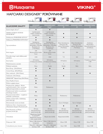 HAFCIARKI DESIGNER™ PORÓWNANIE KLUCZOWE ZALETY System ściegów deLuxe™ EKSKLUZYWNY SYSTEM SENSORÓW™ Ekskluzywny PORADNIK SZYCIA® Ekskluzywny PORADNIK HAFTOANIA™ DESIGNER DIAMOND Royale™ DESIGNER RUBY Royale™ DESIGNER TOPAZ™ 50 DESIGNER TOPAZ™ 40 DESIGNER TOPAZ™ 25 +podnoszenie stopki z dodatkową przestrzenią + podnoszenie stopki z dodatkową przestrzenią Duży Interaktywny Kolorowy Do tykowy Wyświetlacz (70x53mm) Duży Interaktywny Kolorowy Do tykowy Wyświetlacz (70x53mm) Graficzny Wyświetlacz Monochromatyczny (63x48mm) Typ wyświetlacza Interaktywny Interaktywny Kolorowy Dotykowy Kolorowy Dotykowy Wyświetlacz o Wysokiej Wyświetlacz o Wysokiej Rozdzielczości Rozdzielczości (174x104mm) (116x87mm) Ilość ściegów 698 Można pobrać dodatkowe 528 Można pobrać dodatkowe 261 208 160 1250 1082 715 565 423 233 haftów 175 klasyczna kolekcja 182 haftów 175 klasyczna kolekcja 159 haftów 100 haftów 75 haftów na kluczu USB Wszystkie ściegi i znaki (alfabet,znaki specjalne) Ilość haftów Wieloformatowe czcionki 4 4 2 1 1 Duży Średni Średni Mały Mały Royal Hoop (360x200mm) Crown Hoop (260x200mm) Wielkość tamborka Duży tamborek (240x150mm) Tamborek (120x120mm) DESIGNER™ Majestic Hoop (360x350mm) Opcja Duża Prędkość Szycia Wybór wyglądu ekranu Projektowanie Aplikacji - Wybór spośród kształtów i liter i tworzenie aplikacji bezpośrednio na ekranie Pełny Projektowanie haftów na podstawie dowolnego kształtu Pozycjonowanie haftów – wyjątkowo dokładne i perfekcyjne Pełny Pełny Zmiana wymiaru haftu z rekalkulacją ilości wkłuć igły Dostosowanie wzoru na ekranie Selektywny Nóż z Automatycznym Obcinaniem Ściegów Przeskokowych Podstawowy Podstawowy Podstawowy Up to 10 designs Up to 5 designs 250 mm duża przetrzeń po prawej stronie igły 250 mm duża przetrzeń po prawej stronie igły 250 mm duża przetrzeń po prawej stronie igły 200 mm duża przetrzeń po prawej stronie igły 200 mm duża przetrzeń po prawej stronie igły Oświetlenie Regulowane Swiatło E LIGHT™ Regulowana jasność i kolor światła (LED) Rzędy diod (LED) Rzędy diod (LED) 3 LED-y 3 LED-y Połączenie USB Klucz USB, Kabel do komputera Klucz USB, Kabel do komputera Klucz USB Klucz USB Klucz USB Uaktualnienie przez internet Przez PC -USB Kabel lub klucz USB Przez PC -USB Kabel lub klucz USB klucz USB klucz USB klucz USB Duża Przestrzeń, aż 250mm po prawej stronie igły 1 FUNKCJE HAFUJĄCE DESIGNER DIAMOND Royale™ DESIGNER RUBY Royale™ DESIGNER TOPAZ™ 50 DESIGNER TOPAZ™ 40 Sortowanie Bloków Kolorstycznych – eliminacja zmian koloru jednym dotknięciem Przesunięcia Bloków Kolorystycznych eliminacja zmiany koloru w łączonych i dużych wzorach Tworzenie Grup Wzorów – Szybki wybór, obrót i inne modyfIkacje wielu wzorów jednym przyciskiem Smart Save – na bieżąco zapamiętuje miejsce haftowania Możliwe wykonywanie dziurek pod guzika na tamborku Aktywne funkcje wstecz/przód przy operacjach na haftach Zmiana kolejności ściegów w projekcie Taperowanie w opcji haftowania Szycie ściegów dekoracyjnych na tamborku Wbór jednego lub więcej wzorów do edycji Opcja "Dotknij i Trzymaj" łatwe operacje na wzorach,plikach itp Wybór wzorów z miniaturek zdjęć wzorów Przejście do każdego pojedynczego numeru ściegu Funkcje "Przybliżania i Rączki" DESIGNER TOPAZ™ 25 Odczyt wielu formatów plików Siatka na ekranie do idealnego ustawienia haftów Licznik wkłuć igły przy każdym kolorze osobno Kursor na ekranie pokazujacy na bierząco miejsce haftu Edycja koloru Zmiana kolor wzoru -zmiana koloru tła, haft monochromatyczny Zmiana kolor wzoru, haft monochromatyczny Wybór haftu w kolorze lub monochromatyczny Wybór haftu w kolorze lub monochromatyczny Wybór haftu w kolorze lub monochromatyczny Obrót haftów o jeden stopień o jeden stopień o jeden stopień o jeden stopień o 90 stopni 2 opcje 2 opcje Skalowanie wzoru Wejście do każdego koloru w hafcie lub wkłucie po wkłuciu igły Test wiekości i umiejscowienia haftu na tamborku przed wyszyciem Moje tamborki-tworzenie własnej listy używanych tamborków Fastrygowanie na tamborku 2 FUNKCJE SZYJĄCE DESIGNER DIAMOND Royale™ DESIGNER RUBY Royale™ Specjane ściegi, wielowymiarowe 8 ściegów do aplikacji 4 aplikacje+ściegi składane Pop-Up 4 ściegi składane 8 ściegw do aplikacji Górny transport w zestawie Opcja Płytka ściegowa do ściegu prostego z sensorem Szycie w bok Ściegi do taperowania wybór spośród 18 kątów DESIGNER TOPAZ™ 50 DESIGNER TOPAZ™ 40 DESIGNER TOPAZ™ 25 Opcja Opcja Opcja Szycie w 4-lub 8-kierunkach Szycie na ramieniu do haftowania Poziomy pamięci ciągłej Moje pliki + klucz USB Moje pliki + klucz USB Moje pliki + klucz USB Moje pliki + klucz USB Funkcja restartu ściegów Ściegi o szerokości 7mm 12 poziomów pamięci 48 poziomy pamięci 30 poziomów pamięci 24 poziomy pamięci 20 poziomów pamięci 6 Także można je wyhaftować 6 Także można je wyhaftować 5 4 3 Sytem wykonywania dziurki pod wymiar guzika PBB (Perfectly Balanced Buttonholes) stopka z sensorem 16 rodzajów dziurek 3 oczka + przyszy wanie guzika 11 rodzajów dziurek 2 oczka + przyszy wanie guzika 9 rodzajów dziurek 2 oczka + przyszy wanie guzika 9 rodzajów dziurek 1 oczko + przyszy wanie guzika 6 rodzajów dziurek 1 oczko + przyszy wanie guzika Ściegi na ekranie Punkt startowy ściegu zaznaczony na ekranie Punkt startowy ściegu zaznaczony na ekranie Punkt startowy ściegu zaznaczony na ekranie 5 prędkości szycia 5 prędkości szycia 5 prędkości szycia 5 prędkości szycia 5 prędkości szycia Na ekranie widzimy jak będzie wyglądał ścieg Na ekranie widzimy jak będzie wyglądał ścieg Na ekranie widzimy jak będzie wyglądał ścieg Szycie z ręcznym prowadzeniem materiału 2 opcje 2 opcje 2 opcje 2 opcje 2 opcje Dokładne pozycjonowanie ściegu Ustawienie parametrów ściegu długości, szerokości, odbicia lutrzanego w różnych płaszczyznach Brak odbici