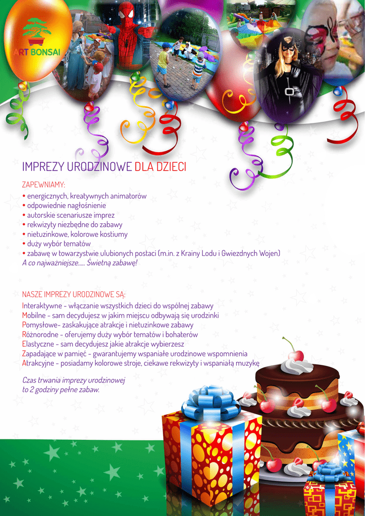 IMPREZY URODZINOWE DLA DZIECI ZAPEWNIAMY: energicznych, kreatywnych animatorów odpowiednie nagłośnienie autorskie scenariusze imprez rekwizyty niezbędne do zabawy nietuzinkowe, kolorowe kostiumy duży wybór tematów zabawę w towarzystwie ulubionych postaci (m.in. z Krainy Lodu i Gwiezdnych Wojen) A co najważniejsze….. Świetną zabawę! NASZE IMPREZY URODZINOWE SĄ: Interaktywne - włączanie wszystkich dzieci do wspólnej zabawy Mobilne - sam decydujesz w jakim miejscu odbywają się urodzinki Pomysłowe- zaskakujące atrakcje i nietuzinkowe zabawy Różnorodne - oferujemy duży wybór tematów i bohaterów Elastyczne - sam decydujesz jakie atrakcje wybierzesz Zapadające w pamięć - gwarantujemy wspaniałe urodzinowe wspomnienia Atrakcyjne - posiadamy kolorowe stroje, ciekawe rekwizyty i wspaniałą muzykę Czas trwania imprezy urodzinowej to 2 godziny pełne zabaw. TEMATY IMPREZ URODZINOWYCH KOWBOJSKI TURNIEJ Czy prawdziwy Dziki zachód może istnieć bez kowbojów? Ależ oczywiście, że nie! Szeryf ogłasza nabór do swojej drużyny i organizuje najprawdziwszy kowbojski turniej! Każdy kto podoła konkurencjom będzie mógł zostać pomocnikiem szeryfa. Nie można przegapić takiej okazji! Prowadzenie przez 2 animatorów w strojach kowbojów Atrakcja specjalna: malowanie buziek Z ALICJĄ W KRAINIE CZARÓW Świat po drugiej stronie lustra może być naprawdę fascynujący. Przekonajcie sie o tym sami! Alicja i Szalony Kapelusznik już nie mogą doczekać się imprezy nie-urodzinowej! Przygotowali nawet tajemnicze i zakręcone zabawy. Kto chętny zagrać w krokieta? Prowadzenie przez 2 animatorów w strojach Alicji i Szalonego Kapelusznika Atrakcja specjalna : deszcz baniek i tatuaż UV dla każdego dziecka PODRÓŻE Z PANEM KLEKSEM Cała naprzód ku nowej przygodzie! Pan Kleks wraz ze Śpiącą Królewną, która przyszła z sąsiedniej bajki, oprowadzą dzieci po najciekawszych zakątkach tajemniczego świata baśni i zagadek. Wybierz się na wspaniałą wycieczkę! “Kto prowadzi? Pan Kleks Jasna sprawa. Nasze hasło? - Wspaniała zabawa!” Prowadzenie przez 2 animatorów w strojach Pana Kleksa i Śpiącej Królewny Atrakcja specjalna: zabawa z pacynką - Szpakiem Mateuszem oraz ogromne bańki PRZYGODA W KRAINIE LODU Ulepimy dziś bałwana? Na imprezę może wolisz iść? Niestraszna nam śnieżna zawierucha, kiedy czeka nas wspaniała przygoda. Razem przenieśmy się do Krainy Lodu, po której śpiewającym krokiem oprowadzi nas Elsa i jej ulubiony bałwanek Olaf. Prowadzenie przez 2 animatorów w strojach Elsy i Olafa Atrakcja specjalna : srebrne konfetti oraz wspólne śpiewanie “Mam tę moc” GWIEZDNE ZABAWY Wybierz się w międzygalaktyczną podróż Sokołem Millenium, poznaj tajniki Mocy, zostań rycerzem Jedi lub wybierz Ciemną Stronę mocy. Po świecie Gwiezdnych Wojen oprowadzać będzie Rey oraz Lord Sithów. Niech Moc będzie z Wami! Prowadzenie przez 2 animatorów w strojach Rey oraz Lorda Sithów Atrakcja specjalna: balonowe miecze świetlne PIRACKA WYPRAWA Nie ma to jak los pirata! Wilki morskie wyruszają w daleki rejs w poszukiwaniu skarbu. Czy uda nam się go odnaleźć? Czeka nas wiele konkurencji, zabaw i morskich opowieści. Ahoj przygodo! Prowadzenie przez 2 animatorów w strojach piratów Atrakcja specjalna: balonowe szable DISCO - TAŃCE Dajmy się porwać w wir tańca! Pomogą nam w tym różowe okulary, taneczne konkurencje i wspaniała muzyka. Przez najrozmaitsze zabawy przejdziemy tanecznym disco - korowodem wraz animatorami prosto z lat 70’! Prowadzenie przez 2 animatorów w strojach disco Atrakcja specjalna: kolorowe konfetti SUPERBOHATEROWIE RATUJĄ URODZINY Impreza urodzinowa legnie w gruzach, jeśli szybko nie wezwiemy do pomocy superbohaterów! Czym prędzej przybywają do nas Spiderman i Batwoman. Oni dobrze wiedzą co zrobić, żeby uratować świat. Z przyjęciem poradzą sobie równie świetnie! Zmierz się z młotem Thora, użyj tarczy Kapitana Ameryki, a sam przekonasz się, że w każdym drzemie superbohater! Prowadzenie przez 2 animatorów w strojach Spidermana i Batwoman Atrakcja specjalna: malowanie buziek - superbohaterowie CENNIK PAKIET PODSTAWOWY dwoje animatorów zapewnienie nagłośnienia i muzyki 2-godzinne zabawy, animacje i konkursy nawiązujące do tematyki imprezy korona dla jubilata 400zł (do dwudziestu dzieci) + 20zł dopłaty za każde dodatkowe dziecko ATRAKCJE DODATKOWE: Mały zamek dmuchany Bańki z wytwornicy baniek Wielkie bańki mydlane Malowanie twarzy Wystrzałowe konfetti Ogromny balon (70cm średnicy) z konfetti Szampan dla dzieci Figury z balonów Przystrajanie domu balonami i serpentynami + 300 zł (cena zawiera dodatkową 1 godzinę zabawy doliczoną do czasu imprezy) + 50 zł + 50 zł + 50 zł + 30 zł od każdej wystrzelonej armaty + 20 zł + 30 zł + 50 zł Cena do uzgodnienia, zależna od warunków lokalowych i liczby balonów Istnieje możliwość wydłużenia czasu imprezy oraz zwiększenia liczby animatorów. Cena ustalana jest wtedy indywidualnie. Urodzinki prowadzimy zarówno w plenerze jak i w pomieszczeniach. ZAPYTAJ O SZCZEGÓŁY I ZAREZERWUJ TERMIN: dzwoniąc na nr: 791 112 610 pisząc na e-mail: [email protected]