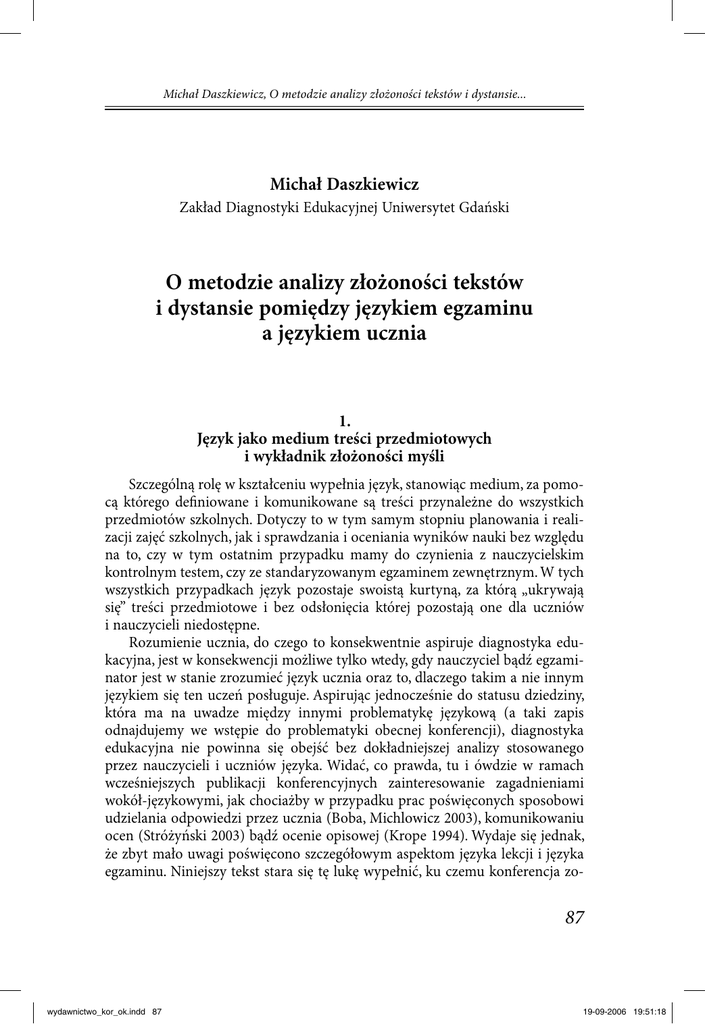 Michał Daszkiewicz, O metodzie analizy złożoności tekstów i dystansie... Michał Daszkiewicz Zakład Diagnostyki Edukacyjnej Uniwersytet Gdański O metodzie analizy złożoności tekstów i dystansie pomiędzy językiem egzaminu a językiem ucznia 1. Język jako medium treści przedmiotowych i wykładnik złożoności myśli Szczególną rolę w kształceniu wypełnia język, stanowiąc medium, za pomocą którego definiowane i komunikowane są treści przynależne do wszystkich przedmiotów szkolnych. Dotyczy to w tym samym stopniu planowania i realizacji zajęć szkolnych, jak i sprawdzania i oceniania wyników nauki bez względu na to, czy w tym ostatnim przypadku mamy do czynienia z nauczycielskim kontrolnym testem, czy ze standaryzowanym egzaminem zewnętrznym. W tych wszystkich przypadkach język pozostaje swoistą kurtyną, za którą „ukrywają się” treści przedmiotowe i bez odsłonięcia której pozostają one dla uczniów i nauczycieli niedostępne. Rozumienie ucznia, do czego to konsekwentnie aspiruje diagnostyka edukacyjna, jest w konsekwencji możliwe tylko wtedy, gdy nauczyciel bądź egzaminator jest w stanie zrozumieć język ucznia oraz to, dlaczego takim a nie innym językiem się ten uczeń posługuje. Aspirując jednocześnie do statusu dziedziny, która ma na uwadze między innymi problematykę językową (a taki zapis odnajdujemy we wstępie do problematyki obecnej konferencji), diagnostyka edukacyjna nie powinna się obejść bez dokładniejszej analizy stosowanego przez nauczycieli i uczniów języka. Widać, co prawda, tu i ówdzie w ramach wcześniejszych publikacji konferencyjnych zainteresowanie zagadnieniami wokół-językowymi, jak chociażby w przypadku prac poświęconych sposobowi udzielania odpowiedzi przez ucznia (Boba, Michlowicz 2003), komunikowaniu ocen (Stróżyński 2003) bądź ocenie opisowej (Krope 1994). Wydaje się jednak, że zbyt mało uwagi poświęcono szczegółowym aspektom języka lekcji i języka egzaminu. Niniejszy tekst stara się tę lukę wypełnić, ku czemu konferencja zo- 87 wydawnictwo_kor_ok.indd 87 19-09-2006 19:51:18 A. Nowe pola diagnostyki edukacyjnej rientowana na zagadnienia etyczne i wychowawcze diagnostyki – ze względów wyjaśnionych w późniejszej części tekstu – stanowi doskonałą okazję. Celem tego tekstu jest przedstawienie metody analizy języka opartej na podziale funkcji językowych bazującym na leksykalnej i strukturalnej złożoności tekstu. Zaproponowany sposób analizy tekstu zobrazowany zostanie najpierw na przykładzie języka, w którym formułowany jest przykładowy egzamin, a następnie na bazie języka, którym posługuje się uczeń. Autor tekstu podziela zdroworozsądkowy pogląd, iż język egzaminu (podobnie jak język, przy udziale którego odbywa się codzienne nauczanie) oraz język ucznia powinny być możliwie ze sobą spójne. Taki zamysł został wielokrotnie wyrażony w pracach poświęconych zagadnieniom diagnostycznym i pomiarowym. Podzielając ten jasny zamysł, niniejszy tekst dotyczy tego, w czym konkretnie przejawiać się może ta spójność. Wskazuje on na trzy właściwości tekstu, które można uznać za właściwości o charakterze międzyprzedmiotowym, które mogą być określone przez nauczycieli różnych przedmiotów i nie wymagają czasochłonnych lingwistycznych analiz. Podstawowym założeniem leżącym u podstaw niniejszego tekstu jest tzw. zasada złożoności (ang. complexity principle), zgodnie z którą złożoność języka odzwierciedla złożoność myśli osoby, która się nim posługuje (por. Wenzel 1994, 55). Ujmując tę zasadę w język bliski diagnostyce edukacyjnej, można stwierdzić, że obraz czy też model rzeczywistości, którym dysponuje uczeń i na który ukierunkowane są zadania egzaminacyjne, nigdy nie jest bezpośrednio obserwowalny i należy do sfery latentnej, a o jego złożoności, formie, poprawności, stopniu zaawansowania, wnosimy na podstawie danych pośrednich, które najczęściej przybierają formę mniej lub bardziej złożonych słów, wyrażeń, zdań. W sytuacji, gdy język, którym posługuje się uczeń, jest prosty, logicznie niespójny, mglisty, siłą rzeczy wnieść możemy, że taki właśnie jest model rzeczywistości, który jest przedmiotem sprawdzania. Bez względu na to, czy zasada złożoności odpowiada prawdzie, czy nie, można zauważyć – odwołując się do podziału funkcji językowych – iż język odwoływać się może do różnej rzeczywistości, raz materialnej, raz abstrakcyjnej. Tę pierwszą można uznać za najbliższą, tę drugą za najdalszą. W tekstach przedstawionych uczniom bądź tych, które oni samodzielnie konstruują, te różnice sprawiają, że pojawia się język o zupełnie innej formie i zupełnie odmiennej jakości. Najlepiej to widać na przykładzie konkretnych fragmentów tekstu, z których w poniższym przypadku każdy dotyczy tego samego tematu (w tym przypadku restauracji fast food): fragment 1: Osobiście nie lubię jeść w restauracjach fast-foodach. No cóż, nie ma tam nic dobrego, nie mam pojęcia dlaczego w ogóle ludzie chodzą tam tak często. I nie sądzę, że to dobre dla mnie, nawet jeśli chodzę tam tylko raz na tydzień. 88 wydawnictwo_kor_ok.indd 88 19-09-2006 19:51:19 Michał Daszkiewicz, O metodzie analizy złożoności tekstów i dystansie... fragment 2: Istnieje strasznie dużo restauracji typu fast-food oraz nader wielu ludzi, którzy lubią jedzenie tam oferowane. Jedzenie nie jest zdrowe i jest wielu regularnych klientów, którzy mają problemy ze zdrowiem po jego spożyciu. fragment 3: Systematyczne odżywianie się w restauracjach typu fastfood często powoduje problemy ze zdrowiem. Wynika to z faktu, iż oferowane produkty nie spełniają określonych wymagań i ich jakość niewątpliwie pozostawia wiele do życzenia. Pomimo że powyższe trzy przykładowe wypowiedzi uczniów przedstawiają podobne negatywne stanowisko wo