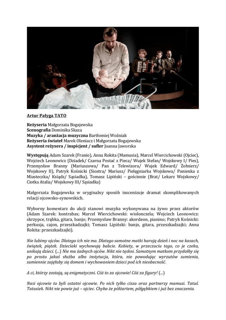 Artur Pałyga TATO Reżyseria Małgorzata Bogajewska Scenografia Dominika Skaza Muzyka / aranżacja muzyczna Bartłomiej Woźniak Reżyseria świateł Marek Oleniacz i Małgorzata Bogajewska Asystent reżysera / inspicjent / sufler Joanna Jaworska Występują Adam Szarek (Franio), Anna Rokita (Mamusia), Marcel Wiercichowski (Ojciec), Wojciech Leonowicz (Dziadek/ Czarna Postać z Pieca/ Wujek Stefan/ Wojskowy I/ Pies), Przemysław Branny (Mariuszowa/ Pan z Telewizora/ Wujek Edward/ Żołnierz/ Wojskowy II), Patryk Kośnicki (Siostra/ Mariusz/ Pielęgniarka Wojskowa/ Panienka z Miasteczka/ Ksiądz/ Sąsiadka), Tomasz Lipiński – gościnnie (Brat/ Lekarz Wojskowy/ Ciotka Atalia/ Wojskowy III/ Sąsiadka) Małgorzata Bogajewska w oryginalny sposób inscenizuje dramat skomplikowanych relacji ojcowsko-synowskich. Wyborny komentarz do akcji stanowi muzyka wykonywana na żywo przez aktorów (Adam Szarek: kontrabas; Marcel Wiercichowski: wiolonczela; Wojciech Leonowicz: skrzypce, trąbka, gitara, banjo; Przemysław Branny: akordeon, pianino; Patryk Kośnicki: perkusja, cajon, przeszkadzajki; Tomasz Lipiński: banjo, gitara, przeszkadzajki; Anna Rokita: przeszkadzajki). Nie lubimy ojców. Dlatego ich nie ma. Dlatego samotne matki harują dzień i noc na kasach, świątek, piątek. Dzieciaki wychowują babcie. Kobiety, w przeczuciu tego, co je czeka, unikają dzieci. (...) Nie ma żadnych ojców. Nikt nie tęskni. Samotnym matkom przydałby się po prostu jakaś służba albo instytucja, która, nie powodując wyrzutów sumienia, sumiennie zajęłaby się domem i wychowaniem dzieci pod ich nieobecność. A ci, którzy zostają, są enigmatyczni. Cóż to za ojcowie! Cóż za figury! (...) Nasi ojcowie to byli ostatni ojcowie. Po nich tylko cisza oraz partnerzy mamusi. Tatuś. Tatusiek. Nikt nie powie już – ojciec. Chyba że półżartem, półgębkiem i już bez znaczenia. Piekło ojców jest już wypełnione. Premiera: 1 października 2014, Scena na Sarego 7 Artur Pałyga, urodzony w Hrubieszowie w 1971, dramaturg, adaptator, prozaik, poeta, dziennikarz, felietonista, aktor, muzyk, performer. Konsultant programowy Teatru Polskiego w Bielsku-Białej. Absolwent polonistyki na UJ i studium nauczycielskiego (specjalizacja muzyczna). Publikował m.in. w „Gazecie Wyborczej”, „Rzeczypospolitej”, „Odrze”, „Tygodniku Powszechnym”, „Trybunie Śląskiej”, „Rastrze” i „Dialogu”. Autor książek „Człowiek i pies” (wespół z J. Bożkiem, 2003) i „Kołchoz imienia Adama Mickiewicza” (2005) oraz kilkunastu sztuk i adaptacji teatralnych. Prowadzi Teatr Tekstu im. Teodora Sixta, czyli nieaktorskie czytania dramatów, oraz zajęcia z osobami niepełnosprawnymi w stowarzyszeniu Teatr Grodzki. Karierę dramatopisarza rozpoczął w 2005 librettem musicalu „Guma balonowa” (Bielskie Centrum Kultury). Wystawiony w 2006 „Testament Teodora Sixta” (reż. R. Talarczyk) zwyciężył w konkursie na sztukę o Bielsku-Białej ogłoszonym przez tamtejszy Teatr Polski, a w 2007 został zakwalifikowany do finału Konkursu na Wystawienie Polskiej Sztuki Współczesnej. Rok później w tym samym konkursie zdobył wyróżnienie stworzonym wespół z P. Passinim, P. Ratajczakiem i Ł. Wittem-Michałowskim oraz aktorami tryptykiem „Nic co ludzkie” (Scena Prapremier In Vitro). Również w 2008 napisanego dla bielskiego teatru „Żyda” (reż. R. Talarczyk) wyróżniono główną nagrodą na III Festiwalu Polskich Sztuk Współczesnych „R@port” w Gdyni. W 2009 inspirowane H. Hessem „Wszystkie rodzaje śmierci” (reż. P. Passini, Teatr Łaźnia Nowa) zdobyły główną nagrodę IV „R@portu”, a „Ostatni taki ojciec” (reż. Ł. Witt-Michałowski, Teatr Centralny w Lublinie) został wyróżniony główną nagrodą na XV Konkursie na Wystawienie Polskiej Sztuki Współczesnej i II nagrodą na Festiwalu Prapremier w Bydgoszczy (na Scenie na Sarego sztuka nosi tytuł „Tato”). W 2013 został laureatem Gdyńskiej Nagrody Dramaturgicznej za sztukę „W środku słońca gromadzi się popiół”. Prowadzi blog (arturpalyga.blog.bielsko.pl). Małgorzata Bogajewska studiowała prawo na Uniwersytecie im. Adama Mickiewicza w Poznaniu, aktorstwo w poznańskiej Akademii Sztuk Wizualnych oraz scenopisarstwo w Camerimage Film School w Toruniu. Jest absolwentką Wydziału Reżyserii Dramatu Akademii Teatralnej im. Aleksandra Zelwerowicza w Warszawie (2002). W latach 20046 pełniła funkcję dyrektora artystycznego Sceny Dramatycznej Teatru Jeleniogórskiego im. Cypriana Kamila Norwida. Laureatka licznych nagród teatralnych. Debiutowała jeszcze jako studentka reżyserii „Powrotem” Jerzego Łukosza w Lubuskim Teatrze im. Leona Kruczkowskiego w Zielonej Górze (2001). W ciągu kilkunastu lat pracy artystycznej wyreżyserowała ponad 30 spektakli; w tym dla teatru „Bagatela”: „Barbelo, o psach i dzieciach” Biljany Srbljanović, „Oblężenie” Jewgienija Griszkowca oraz „VIP-a” Stiga Larssona. Wśród premier, które ma na swym koncie, dominują współczesne dramaty, m.in.: „Opowieści o zwyczajnym szaleństwie” Petra Zelenki (prapremiera w Zielonej Górze, 2003), „Tlen” Iwana Wyrypajewa (Teatr Powszechny, Warszawa, 2003), „Jednocześnie” Jewgienija Griszkowca (przedstawienie impresaryjne, 2004); „Testament psa” Dei Loher (Teatr Polski, Bydgoszcz, 2005), „Dotyk” Marka Modzelewskiego (Teatr Powszechny, Warszawa, 2005), „Espresso” Lucia Frangionego w Teatrze Powszechnym w Warszawie w 2011 (zrealizowane wcześniej w Teatrze w Jeleniej Górze – 2006), „Bóg mordu” Jasminy Rezy w warszawskim Teatrze 6. Piętro (2012) czy „Dwoje biednych Rumunów mówiących po polsku” Doroty Masłowskiej w Teatrze Studyjnym PWSFTviT w Łodzi. Sięgnęła również po klasykę dramatu, reżyserując „Hamleta” (Teatr im. Wilama Horzycy, Toruń, 2008) i „Kotkę na gorącym blaszanym dachu” Tennessee Williamsa (Teatr im. Stefana Jaracza, Łódź, 2010