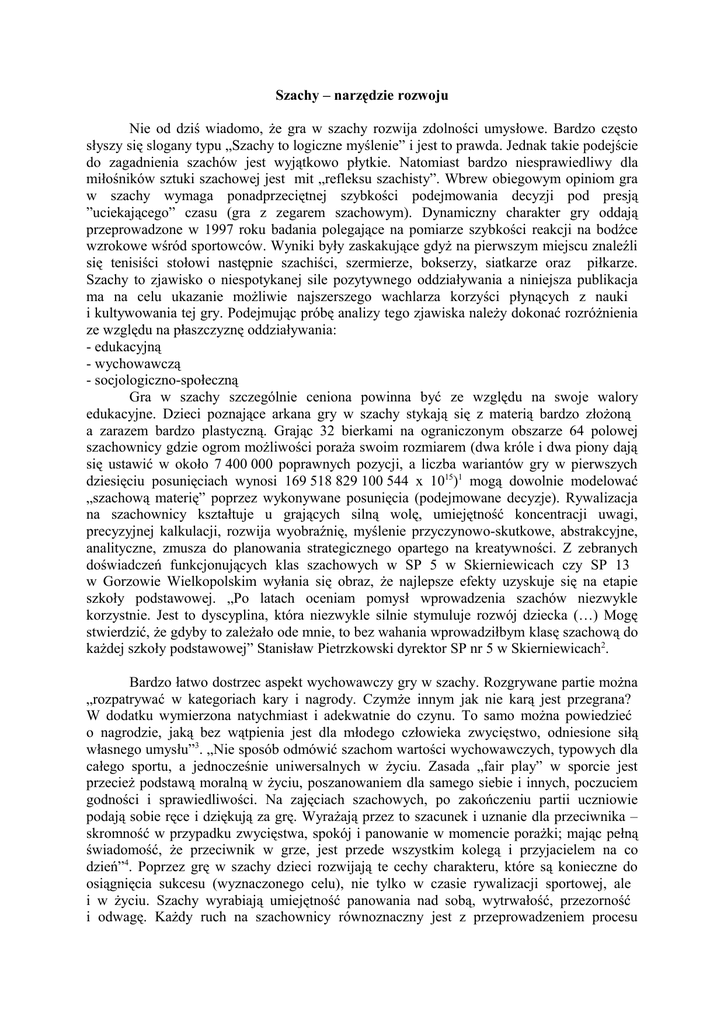 Szachy – narzędzie rozwoju Nie od dziś wiadomo, że gra w szachy rozwija zdolności umysłowe. Bardzo często słyszy się slogany typu „Szachy to logiczne myślenie” i jest to prawda. Jednak takie podejście do zagadnienia szachów jest wyjątkowo płytkie. Natomiast bardzo niesprawiedliwy dla miłośników sztuki szachowej jest mit „refleksu szachisty”. Wbrew obiegowym opiniom gra w szachy wymaga ponadprzeciętnej szybkości podejmowania decyzji pod presją ”uciekającego” czasu (gra z zegarem szachowym). Dynamiczny charakter gry oddają przeprowadzone w 1997 roku badania polegające na pomiarze szybkości reakcji na bodźce wzrokowe wśród sportowców. Wyniki były zaskakujące gdyż na pierwszym miejscu znaleźli się tenisiści stołowi następnie szachiści, szermierze, bokserzy, siatkarze oraz piłkarze. Szachy to zjawisko o niespotykanej sile pozytywnego oddziaływania a niniejsza publikacja ma na celu ukazanie możliwie najszerszego wachlarza korzyści płynących z nauki i kultywowania tej gry. Podejmując próbę analizy tego zjawiska należy dokonać rozróżnienia ze względu na płaszczyznę oddziaływania: - edukacyjną - wychowawczą - socjologiczno-społeczną Gra w szachy szczególnie ceniona powinna być ze względu na swoje walory edukacyjne. Dzieci poznające arkana gry w szachy stykają się z materią bardzo złożoną a zarazem bardzo plastyczną. Grając 32 bierkami na ograniczonym obszarze 64 polowej szachownicy gdzie ogrom możliwości poraża swoim rozmiarem (dwa króle i dwa piony dają się ustawić w około 7 400 000 poprawnych pozycji, a liczba wariantów gry w pierwszych dziesięciu posunięciach wynosi 169 518 829 100 544 x 1015)1 mogą dowolnie modelować „szachową materię” poprzez wykonywane posunięcia (podejmowane decyzje). Rywalizacja na szachownicy kształtuje u grających silną wolę, umiejętność koncentracji uwagi, precyzyjnej kalkulacji, rozwija wyobraźnię, myślenie przyczynowo-skutkowe, abstrakcyjne, analityczne, zmusza do planowania strategicznego opartego na kreatywności. Z zebranych doświadczeń funkcjonujących klas szachowych w SP 5 w Skierniewicach czy SP 13 w Gorzowie Wielkopolskim wyłania się obraz, że najlepsze efekty uzyskuje się na etapie szkoły podstawowej. „Po latach oceniam pomysł wprowadzenia szachów niezwykle korzystnie. Jest to dyscyplina, która niezwykle silnie stymuluje rozwój dziecka (…) Mogę stwierdzić, że gdyby to zależało ode mnie, to bez wahania wprowadziłbym klasę szachową do każdej szkoły podstawowej” Stanisław Pietrzkowski dyrektor SP nr 5 w Skierniewicach2. Bardzo łatwo dostrzec aspekt wychowawczy gry w szachy. Rozgrywane partie można „rozpatrywać w kategoriach kary i nagrody. Czymże innym jak nie karą jest przegrana? W dodatku wymierzona natychmiast i adekwatnie do czynu. To samo można powiedzieć o nagrodzie, jaką bez wątpienia jest dla młodego człowieka zwycięstwo, odniesione siłą własnego umysłu”3. „Nie sposób odmówić szachom wartości wychowawczych, typowych dla całego sportu, a jednocześnie uniwersalnych w życiu. Zasada „fair play” w sporcie jest przecież podstawą moralną w życiu, poszanowaniem dla samego siebie i innych, poczuciem godności i sprawiedliwości. Na zajęciach szachowych, po zakończeniu partii uczniowie podają sobie ręce i dziękują za grę. Wyrażają przez to szacunek i uznanie dla przeciwnika – skromność w przypadku zwycięstwa, spokój i panowanie w momencie porażki; mając pełną świadomość, że przeciwnik w grze, jest przede wszystkim kolegą i przyjacielem na co dzień”4. Poprzez grę w szachy dzieci rozwijają te cechy charakteru, które są konieczne do osiągnięcia sukcesu (wyznaczonego celu), nie tylko w czasie rywalizacji sportowej, ale i w życiu. Szachy wyrabiają umiejętność panowania nad sobą, wytrwałość, przezorność i odwagę. Każdy ruch na szachownicy równoznaczny jest z przeprowadzeniem procesu decyzyjnego a co za tym idzie umiejętności brania odpowiedzialności za podjętą decyzje. Uczy to z kolei prostej prawdy, że własne zdanie i ocena nie zawsze są słuszne i prawdziwe, że należy myśleć obiektywnie i nie lekceważyć żadnego przeciwnika ani jego argumentów. Analizując wartości socjologiczno-społeczne należy wyjść od tego, ze szachy są grą wielopokoleniową. Często widuje się grających na jednej szachownicy kilku/kilkunastoletnie dziecko z osobą w podeszłym wieku. Wiek nie stanowi bariery uniemożliwiającej rywalizację gdyż w tej grze nie liczą się płeć, wzrost, waga, czy sprawność ruchowa lecz intelekt i siła umysłu. Brak wspomnianych barier ułatwia rodzicom (dziadkom) utrzymanie lepszego kontaktu z dzieckiem poprzez dodatkowy obszar wspólnych zainteresowań. Gra w szachy często staję się punktem wyjścia do prowadzenia rozmów na tematy zupełnie z szachami niezwiązane. W obecnych czasach psychologowie biją na alarm. Dzieci zostają w coraz większym stopniu pochłonięte przez gry komputerowe. „Już obecnie liczba dzieci korzystających z gier komputerowych jest bardzo duża, a czas poświęcany na nie stale rośnie. Warto od razu dodać, że korzystanie z gier nie jest zazwyczaj przez nikogo kontrolowane, gdyż rodzice na ogół nie umieją się nimi posługiwać (…) Literatura, a także wizyta w dowolnym punkcie sprzedaży gier pokazują, że treścią około 95% gier jest agresja. Zabawa polega na walce z różnymi istotami - ludźmi, zwierzętami lub ze stworzeniami fantastycznymi. Do walki używa się rozmaitego typu uzbrojenia: dzid, rewolwerów, pił tarczowych, maczug, broni laserowej. Gry są tak skonstruowane, że w polu widzenia uczestnika znajdują się przeciwnicy, a także jego ręka z bronią, np. rewolwerem, widłami. W zależności od możliwości technicznych sprzętu i rodzaju gry, animacja jest zróżnicowana - od prostej, jak w filmach rysunkowych, do realistycznej z udziałem aktorów w