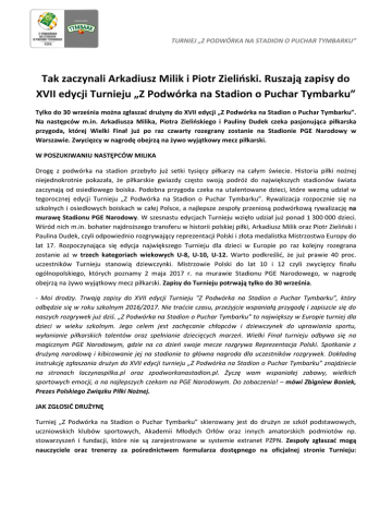 TURNIEJ „Z PODWÓRKA NA STADION O PUCHAR TYMBARKU” Tak zaczynali Arkadiusz Milik i Piotr Zieliński. Ruszają zapisy do XVII edycji Turnieju „Z Podwórka na Stadion o Puchar Tymbarku” Tylko do 30 września można zgłaszać drużyny do XVII edycji „Z Podwórka na Stadion o Puchar Tymbarku”. Na następców m.in. Arkadiusza Milika, Piotra Zielińskiego i Pauliny Dudek czeka pasjonująca piłkarska przygoda, której Wielki Finał już po raz czwarty rozegrany zostanie na Stadionie PGE Narodowy w Warszawie. Zwycięzcy w nagrodę obejrzą na żywo wyjątkowy mecz piłkarski. W POSZUKIWANIU NASTĘPCÓW MILIKA Drogę z podwórka na stadion przebyło już setki tysięcy piłkarzy na całym świecie. Historia piłki nożnej niejednokrotnie pokazała, że piłkarskie gwiazdy często swoją podróż do największych stadionów świata zaczynają od osiedlowego boiska. Podobna przygoda czeka na utalentowane dzieci, które wezmą udział w tegorocznej edycji Turnieju „Z Podwórka na Stadion o Puchar Tymbarku”. Rywalizacja rozpocznie się na szkolnych i osiedlowych boiskach w całej Polsce, a najlepsze zespoły przeniosą podwórkową rywalizację na murawę Stadionu PGE Narodowy. W szesnastu edycjach Turnieju wzięło udział już ponad 1 300 000 dzieci. Wśród nich m.in. bohater najdroższego transferu w historii polskiej piłki, Arkadiusz Milik oraz Piotr Zieliński i Paulina Dudek, czyli odpowiednio rozgrywający reprezentacji Polski i złota medalistka Mistrzostwa Europy do lat 17. Rozpoczynająca się edycja największego Turnieju dla dzieci w Europie po raz kolejny rozegrana zostanie aż w trzech kategoriach wiekowych U-8, U-10, U-12. Warto podkreślić, że już prawie 40 proc. uczestników Turnieju stanowią dziewczynki. Mistrzowie Polski do lat 10 i 12 czyli zwycięzcy finału ogólnopolskiego, których poznamy 2 maja 2017 r. na murawie Stadionu PGE Narodowego, w nagrodę obejrzą na żywo wyjątkowy mecz piłkarski. Zapisy do Turnieju potrwają tylko do 30 września. - Moi drodzy. Trwają zapisy do XVII edycji Turnieju "Z Podwórka na Stadion o Puchar Tymbarku”, który odbędzie się w roku szkolnym 2016/2017. Nie traćcie czasu, przeżyjcie wspaniałą przygodę i zapiszcie się do naszych rozgrywek już dziś. „Z Podwórka na Stadion o Puchar Tymbarku” to największy w Europie turniej dla dzieci w wieku szkolnym. Jego celem jest zachęcanie chłopców i dziewczynek do uprawiania sportu, wyłanianie piłkarskich talentów oraz spełnianie dziecięcych marzeń. Wielki Finał turnieju odbywa się na magicznym PGE Narodowym, gdzie na co dzień swoje mecze rozgrywa Reprezentacja Polski. Spotkanie z drużyną narodową i kibicowanie jej na stadionie to główna nagroda dla uczestników rozgrywek. Dokładną instrukcję zgłaszania drużyn do XVII edycji turnieju „Z Podwórka na Stadion o Puchar Tymbarku” znajdziecie na stronach laczynaspilka.pl oraz zpodworkanastadion.pl. Życzę wam wspaniałej zabawy, wielkich sportowych emocji, a na najlepszych czekam na PGE Narodowym. Do zobaczenia! – mówi Zbigniew Boniek, Prezes Polskiego Związku Piłki Nożnej. JAK ZGŁOSIĆ DRUŻYNĘ Turniej „Z Podwórka na Stadion o Puchar Tymbarku” skierowany jest do drużyn ze szkół podstawowych, uczniowskich klubów sportowych, Akademii Młodych Orłów oraz innych amatorskich podmiotów np. stowarzyszeń i fundacji, które nie są zarejestrowane w systemie extranet PZPN. Zespoły zgłaszać mogą nauczyciele oraz trenerzy za pośrednictwem formularza dostępnego na oficjalnej stronie Turnieju: TURNIEJ „Z PODWÓRKA NA STADION O PUCHAR TYMBARKU” www.zpodworkanastadion.pl. Zapisy odbywają się w trzech kategoriach wiekowych: do lat 8, 10 oraz 12. Potrwają one do 30 września. Za udział każdej drużyny w rozgrywkach opiekunowie otrzymają piłkarski upominek. Pierwsze mecze rozegrane zostaną już w październiku. - Turniej „Z podwórka na stadion o Puchar Tymbarku” jest szansą dla dzieci na zaprezentowanie swoich umiejętności i spełnienie piłkarskich marzeń, a dla najlepszych jak pokazują przykłady Arkadiusza Milika i Piotra Zielińskiego może być nawet pierwszym krokiem w stronę prawdziwej kariery. Tymbark jest głównym sponsorem Turnieju i już od 10 lat staramy się zachęcać dzieci do gry w piłkę nożną. Mamy nadzieję, że dobry występ naszej Reprezentacji na Euro we Francji podziałał na wyobraźnię dzieci lubiących piłkę nożną, i w tym roku jeszcze więcej chłopców i dziewczynek weźmie udział w tym największym nie tylko w Polsce, ale i Europie Turnieju – powiedział Krzysztof Pawiński, Prezes Zarządu Maspex. MECZE FINAŁOWE NA STADIONIE PGE NARODOWY Już po raz czwarty zwycięzców Turnieju „Z Podwórka na Stadion o Puchar Tymbarku” poznamy na Stadionie PGE Narodowym w Warszawie. Mecze finałowe XVII edycji rozegrane zostaną 2 maja 2017 r. bezpośrednio przed finałem Pucharu Polski. Dzięki udziałowi w Turnieju każde dziecko, które kocha piłkę nożną może dołączyć do elitarnego grona strzelców gola na Stadionie PGE Narodowy w którym są m.in. Cristiano Ronaldo, Wayne Rooney, Mesut Özil, czy Arkadiusz Milik. Finał rywalizacji o Puchar Tymbarku jest jedną z trzech dróg do zagrania na murawie największego polskiego stadionu, obok gry w Reprezentacji Polski oraz występu w finale Pucharu Polski. - Zapraszam wszystkich do uczestnictwa w turnieju „Z Podwórka na Stadion o Puchar Tymbarku”. Na pewno będzie to świetna zabawa. Coraz więcej dzieci w nim uczestniczy, a poziom sportowy jest coraz wyższy. Finały turnieju są rozgrywane na stadionie PGE Narodowym z piędziesięciotysięczną publicznością, a to naprawdę fantastyczne uczucie. Życzę każdemu, by zagrał tam w Wielkim Finale. Uczestnicy turnieju „Z Podwórka na Stadion o Puchar Tymbarku” mogą dzięki temu iść naszą drogą (red. Reprezentantów Polski). Ja jestem tego najlepszym przykładem, bo też grałem w ich wieku w tym turnieju - po