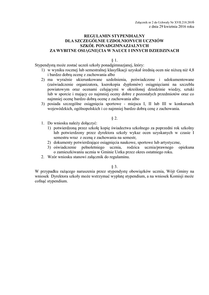 Załącznik nr 2 do Uchwały Nr XVII.218.2016 z dnia 29 kwietnia 2016 roku REGULAMIN STYPENDIALNY DLA SZCZEGÓLNIE UZDOLNIONYCH UCZNIÓW SZKÓŁ PONADGIMNAZJALNYCH ZA WYBITNE OSIĄGNIĘCIA W NAUCE I INNYCH DZIEDZINACH § 1. Stypendystą może zostać uczeń szkoły ponadgimnazjanej, który: 1) w wyniku rocznej lub semestralnej klasyfikacji uzyskał średnią ocen nie niższą niż 4,8 i bardzo dobrą ocenę z zachowania albo 2) ma wyraźnie ukierunkowane uzdolnienia, poświadczone i udokumentowane (zaświadczenie organizatora, kserokopia dyplomów) osiągnięciami na szczeblu powiatowym oraz ocenami celującymi w określonej dziedzinie wiedzy, sztuki lub w sporcie i mający co najmniej oceny dobre z pozostałych przedmiotów oraz co najmniej ocenę bardzo dobrą ocenę z zachowania albo 3) posiada szczególne osiągnięcia sportowe - miejsca I, II lub III w konkursach wojewódzkich, ogólnopolskich i co najmniej bardzo dobrą cenę z zachowania. § 2. 1. Do wniosku należy dołączyć: 1) potwierdzoną przez szkołę kopię świadectwa szkolnego za poprzedni rok szkolny lub potwierdzony przez dyrektora szkoły wykaz ocen uzyskanych w czasie I semestru wraz z oceną z zachowania na semestr, 2) dokumenty potwierdzające osiągnięcia naukowe, sportowe lub artystyczne, 3) oświadczenie pełnoletniego ucznia, rodzica ucznia/prawnego opiekuna o zamieszkiwaniu ucznia w Gminie Ustka przez okres ostatniego roku. 2. Wzór wniosku stanowi załącznik do regulaminu. § 3. W przypadku rażącego naruszenia przez stypendystę obowiązków ucznia, Wójt Gminy na wniosek Dyrektora szkoły może wstrzymać wypłatę stypendium, a na wniosek Komisji może cofnąć stypendium. załącznik do regulaminu stypendialnego dla uczniów szkół ponadgimnazjalnych WNIOSEK STYPENDIALNY DLA UCZNIÓW SZKÓŁ PONADGIMNAZJALNYCH O STYPENDIUM ZA WYBITNE OSIĄGNIĘCIA W NAUCE I INNYCH DZIEDZINACH …................................................................................................................................................... WNIOSKODAWCA …............................................................................................................................................................. (imię i nazwisko ucznia) …............................................................................................................................................................. (imię i nazwisko rodzica/prawnego opiekuna ucznia) …............................................................................................................................................................. (adres stałego miejsca zamieszkania, numer telefonu) Nazwa szkoły ....................................................................................................................................... Klasa ................................................. Średnia ocen końcoworocznych ............................. Średnia ocen za semestr........................................... Ocena zachowania ............................................................... Opis osiągnięć kandydata (Liczba olimpiad, konkursów oraz zajęte lokaty, osiągnięcia kulturalne, społeczne, sportowe) …............................................................................................................................ …................................................................................................................................................................ .................................................................................................................................................................... Pozostałe osiągnięcia: …........................................................................................................................... .................................................................................................................................................................... ............................................... składający wniosek …......................................................................................... Akceptacja wniosku przez rodzica/prawnego opiekuna lub ucznia pełnoletniego gdy wnioskodawcą jest dyrektor szkoły ….......................................................................................... podpis dyrektora szkoły gdy wnioskodawcą jest rodzic /prawny opiekun lub uczeń pełnoletni Załączniki: 1. Potwierdzony przez dyrektora szkoły wykaz ocen uzyskanych w czasie minionego semestru wraz z oceną z zachowania na semestr lub potwierdzona kopia świadectwa szkolnego. 2. Potwierdzone kserokopie dyplomów stwierdzających osiągnięcia ucznia. 3. Oświadczenie pełnoletniego ucznia, rodzica/opiekuna prawnego o zamieszkiwaniu dziecka na terenie Gminy Ustka przez okres co najmniej jednego roku, liczonego wstecz od dnia, w którym składany jest wniosek o stypendium.