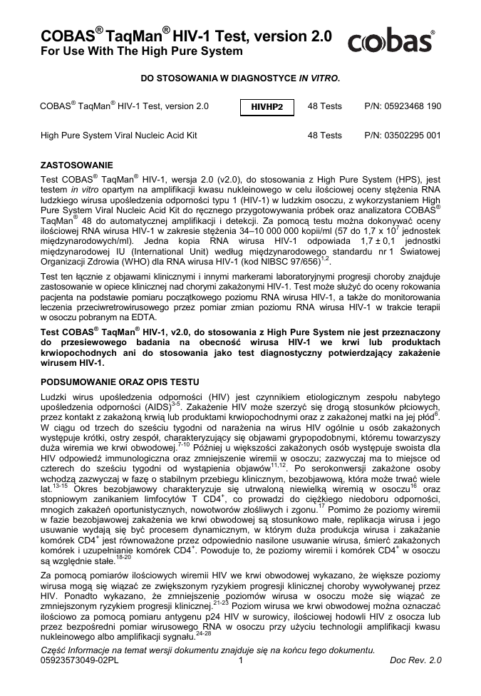 COBAS® TaqMan® HIV-1 Test, version 2.0 For Use With The High Pure System DO STOSOWANIA W DIAGNOSTYCE IN VITRO. COBAS® TaqMan® HIV-1 Test, version 2.0 High Pure System Viral Nucleic Acid Kit HIVHP2 48 Tests P/N: 05923468 190 48 Tests P/N: 03502295 001 ZASTOSOWANIE Test COBAS® TaqMan® HIV-1, wersja 2.0 (v2.0), do stosowania z High Pure System (HPS), jest testem in vitro opartym na amplifikacji kwasu nukleinowego w celu ilościowej oceny stężenia RNA ludzkiego wirusa upośledzenia odporności typu 1 (HIV-1) w ludzkim osoczu, z wykorzystaniem High Pure System Viral Nucleic Acid Kit do ręcznego przygotowywania próbek oraz analizatora COBAS® TaqMan® 48 do automatycznej amplifikacji i detekcji. Za pomocą testu można dokonywać oceny ilościowej RNA wirusa HIV-1 w zakresie stężenia 34–10 000 000 kopii/ml (57 do 1,7 x 107 jednostek międzynarodowych/ml). Jedna kopia RNA wirusa HIV-1 odpowiada 1,7 ± 0,1 jednostki międzynarodowej IU (International Unit) według międzynarodowego standardu nr 1 Światowej Organizacji Zdrowia (WHO) dla RNA wirusa HIV-1 (kod NIBSC 97/656)1,2. Test ten łącznie z objawami klinicznymi i innymi markerami laboratoryjnymi progresji choroby znajduje zastosowanie w opiece klinicznej nad chorymi zakażonymi HIV-1. Test może służyć do oceny rokowania pacjenta na podstawie pomiaru początkowego poziomu RNA wirusa HIV-1, a także do monitorowania leczenia przeciwretrowirusowego przez pomiar zmian poziomu RNA wirusa HIV-1 w trakcie terapii w osoczu pobranym na EDTA. Test COBAS® TaqMan® HIV-1, v2.0, do stosowania z High Pure System nie jest przeznaczony do przesiewowego badania na obecność wirusa HIV-1 we krwi lub produktach krwiopochodnych ani do stosowania jako test diagnostyczny potwierdzający zakażenie wirusem HIV-1. PODSUMOWANIE ORAZ OPIS TESTU Ludzki wirus upośledzenia odporności (HIV) jest czynnikiem etiologicznym zespołu nabytego 3-5 upośledzenia odporności (AIDS) . Zakażenie HIV może szerzyć się drogą stosunków płciowych, przez kontakt z zakażoną krwią lub produktami krwiopochodnymi oraz z zakażonej matki na jej płód6. W ciągu od trzech do sześciu tygodni od narażenia na wirus HIV ogólnie u osób zakażonych występuje krótki, ostry zespół, charakteryzujący się objawami grypopodobnymi, któremu towarzyszy duża wiremia we krwi obwodowej.7-10 Później u większości zakażonych osób występuje swoista dla HIV odpowiedź immunologiczna oraz zmniejszenie wiremii w osoczu; zazwyczaj ma to miejsce od 11,12 . Po serokonwersji zakażone osoby czterech do sześciu tygodni od wystąpienia objawów wchodzą zazwyczaj w fazę o stabilnym przebiegu klinicznym, bezobjawową, która może trwać wiele lat.13-15 Okres bezobjawowy charakteryzuje się utrwaloną niewielką wiremią w osoczu16 oraz stopniowym zanikaniem limfocytów T CD4+, co prowadzi do ciężkiego niedoboru odporności, mnogich zakażeń oportunistycznych, nowotworów złośliwych i zgonu.17 Pomimo że poziomy wiremii w fazie bezobjawowej zakażenia we krwi obwodowej są stosunkowo małe, replikacja wirusa i jego usuwanie wydają się być procesem dynamicznym, w którym duża produkcja wirusa i zakażanie komórek CD4+ jest równoważone przez odpowiednio nasilone usuwanie wirusa, śmierć zakażonych + + komórek i uzupełnianie komórek CD4 . Powoduje to, że poziomy wiremii i komórek CD4 w osoczu są względnie stałe.18-20 Za pomocą pomiarów ilościowych wiremii HIV we krwi obwodowej wykazano, że większe poziomy wirusa mogą się wiązać ze zwiększonym ryzykiem progresji klinicznej choroby wywoływanej przez HIV. Ponadto wykazano, że zmniejszenie poziomów wirusa w osoczu może się wiązać ze 21-23 Poziom wirusa we krwi obwodowej można oznaczać zmniejszonym ryzykiem progresji klinicznej. ilościowo za pomocą pomiaru antygenu p24 HIV w surowicy, ilościowej hodowli HIV z osocza lub przez bezpośredni pomiar wirusowego RNA w osoczu przy użyciu technologii amplifikacji kwasu nukleinowego albo amplifikacji sygnału.24-28 Część Informacje na temat wersji dokumentu znajduje się na końcu tego dokumentu. 05923573049-02PL 1 Doc Rev. 2.0 Antygen p24 jest podstawowym białkiem rdzenia HIV, stwierdzanym w surowicy zarówno w postaci wolnej, jak i związanej z przeciwciałem anty-p24. Wolny antygen p24 można oznaczać za pomocą komercyjnie dostępnych enzymatycznych testów immunologicznych (EIA, enzyme immunoassay), jednak przydatność antygenu p24 jako markera liczby kopii wirusa we krwi jest ograniczona, ponieważ jest on wykrywany jedynie u 20% chorych bezobjawowych i 40–50% chorych objawowych. Metody mające na celu rozdzielenie kompleksów antygen-przeciwciało poprawiają czułość testów wykrywających antygen p24, jednak cząsteczka wirusa pozostaje niewykrywalna u większości 24 chorych bezobjawowych. Zakaźny wirus HIV w osoczu można hodować, inokulując nim pobudzone komórki jednojądrowe krwi obwodowej (PBMC, peripheral blood mononuclear cells), pochodzące od zdrowych dawców. Oznaczenie ilościowe uzyskuje się, inokulując PBMC za pomocą seryjnych rozcieńczeń próbki osocza. Hodowla ilościowa ma ograniczoną użyteczność w monitorowaniu poziomów wirusa u osób zakażonych, ponieważ jedynie niewielka frakcja cząstek wirusa jest zakaźna w warunkach in vitro. Zakaźny wirus jest często niewykrywalny u chorych bezobjawowych.24 RNA wirusa HIV można oznaczać ilościowo w osoczu przy użyciu technik amplifikacji kwasów nukleinowych, takich jak reakcja łańcuchowa polimerazy (PCR, Polymerase Chain Reaction).29-31 Test COBAS® TaqMan® HIV-1, v2.0, do stosowania z High Pure System wykorzystuje technologię reakcji PCR do osiągnięcia maksymalnej czułości i dynamicznego zakresu ilościowego oznaczania RNA wirusa HIV-1 w osoczu pobranym na EDTA jako antykoagulantem. ZASADY PROCEDURY Test COBAS® TaqMan® HIV-1, v2.0, do stosowania z High Pure System jest testem amplifikacji kwasu nukleinowego, służącym do ilościow