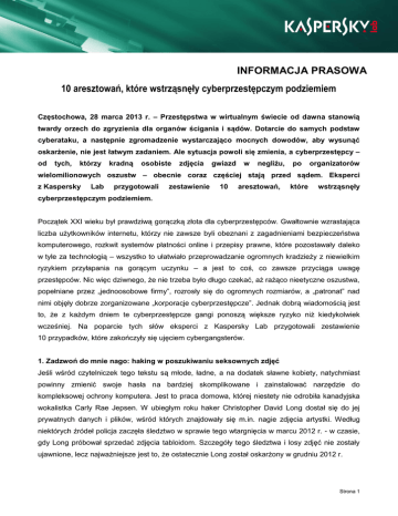 INFORMACJA PRASOWA 10 aresztowań, które wstrząsnęły cyberprzestępczym podziemiem Częstochowa, 28 marca 2013 r. – Przestępstwa w wirtualnym świecie od dawna stanowią twardy orzech do zgryzienia dla organów ścigania i sądów. Dotarcie do samych podstaw cyberataku, a następnie zgromadzenie wystarczająco mocnych dowodów, aby wysunąć oskarżenie, nie jest łatwym zadaniem. Ale sytuacja powoli się zmienia, a cyberprzestępcy – od tych, którzy kradną osobiste zdjęcia gwiazd w negliżu, po organizatorów wielomilionowych oszustw – obecnie coraz częściej stają przed sądem. Eksperci z Kaspersky Lab przygotowali zestawienie 10 aresztowań, które wstrząsnęły cyberprzestępczym podziemiem. Początek XXI wieku był prawdziwą gorączką złota dla cyberprzestępców. Gwałtownie wzrastająca liczba użytkowników internetu, którzy nie zawsze byli obeznani z zagadnieniami bezpieczeństwa komputerowego, rozkwit systemów płatności online i przepisy prawne, które pozostawały daleko w tyle za technologią – wszystko to ułatwiało przeprowadzanie ogromnych kradzieży z niewielkim ryzykiem przyłapania na gorącym uczynku – a jest to coś, co zawsze przyciąga uwagę przestępców. Nic więc dziwnego, że nie trzeba było długo czekać, aż rażąco nieetyczne oszustwa, popełniane przez „jednoosobowe firmy”, rozrosły się do ogromnych rozmiarów, a „patronat” nad nimi objęły dobrze zorganizowane „korporacje cyberprzestępcze”. Jednak dobrą wiadomością jest to, że z każdym dniem te cyberprzestępcze gangi ponoszą większe ryzyko niż kiedykolwiek wcześniej. Na poparcie tych słów eksperci z Kaspersky Lab przygotowali zestawienie 10 przypadków, które zakończyły się ujęciem cybergangsterów. 1. Zadzwoń do mnie nago: haking w poszukiwaniu seksownych zdjęć Jeśli wśród czytelniczek tego tekstu są młode, ładne, a na dodatek sławne kobiety, natychmiast powinny zmienić swoje hasła na bardziej skomplikowane i zainstalować narzędzie do kompleksowej ochrony komputera. Jest to praca domowa, której niestety nie odrobiła kanadyjska wokalistka Carly Rae Jepsen. W ubiegłym roku haker Christopher David Long dostał się do jej prywatnych danych i plików, wśród których znajdowały się m.in. nagie zdjęcia artystki. Według niektórych źródeł policja zaczęła śledztwo w sprawie tego wtargnięcia w marcu 2012 r. - w czasie, gdy Long próbował sprzedać zdjęcia tabloidom. Szczegóły tego śledztwa i losy zdjęć nie zostały ujawnione, lecz najważniejsze jest to, że ostatecznie Long został oskarżony w grudniu 2012 r. Strona 1 2. Do więzienia pierwszą klasą: nadzorca botnetu ZeuS płaci za skradzione miliony Algierski haker Hamza Bendelladj został aresztowany na lotnisku w Bangkoku na początku stycznia 2013 r. po tym, jak lokalna policja została ostrzeżona przez agentów FBI, którzy przez 3 lata śledzili 24-latka. Hamza Bendelladj był podejrzewany o kontrolowanie botnetu opartego na znanym trojanie ZeuS. Bendelladjowi zarzuca się przywłaszczenie 20 milionów dolarów amerykańskich w jednej z szeregu nielegalnych transakcji obejmujących 217 banków i instytucji finansowych. Nic dziwnego, że kiedy został złapany, prowadził luksusowy styl życia i podróżował po całym świecie w pierwszej klasie. Teraz stanął w obliczu ekstradycji do Stanów Zjednoczonych i oczekuje na sprawę sądową w stanie Georgia. 3. Ostre rozdanie kart: 12 lat za skradzione dane Na początku lutego 2013 r. holenderski cyberprzestępca David Benjamin Schrooten, szerzej znany jako Fortezza, został skazany na 12 lat pozbawienia wolności. Schrooten był członkiem grupy przestępczej odpowiedzialnej za kradzież ponad 100 000 numerów kart kredytowych, które następnie zostały sprzedane na specjalnym, podziemnym portalu internetowym, zajmującym się obrotem nielegalnymi danymi finansowymi. Wyroki zostały również wydane na niektórych jego wspólników, podczas gdy inni czekają na możliwość złożenia wyjaśnień. Co ciekawe, śledztwo ujawniło, że Schrooten próbował zhakować inne forum „karciane” w dążeniu do zakłócenia działania konkurencji i przejęcia klientów. Był bardzo skrupulatny w zacieraniu śladów, ale długie ramię sprawiedliwości w końcu dopadło go w Rumunii i doprowadziło do ekstradycji cybergangstera do USA. 4. 105 lat za nękanie seksualne Pod koniec stycznia 2013 r. FBI aresztowało 27-letniego Karena 'Gary'ego' Kazaryana. Człowiek ten nie podążał za korzyściami materialnymi - był skoncentrowany na krakowaniu Facebooka, Skype'a i kont pocztowych należących do kobiet. Po uzyskaniu dostępu do danego serwisu, Kazaryan zmieniał hasło, co odcinało ofiary od ich własnych kont internetowych. Kontrolując konta, Kazaryan przeszukiwał wiadomości e-mail i inne pliki, licząc na zdobycie nagich zdjęć ofiar oraz innych poufnych informacji, takich jak hasła i listy kontaktów. Potem wykorzystał te informacje, aby zmusić swoje ofiary do rozebrania się przed kamerą internetową. Śledczy znaleźli na komputerze Kazaryana ponad 3 000 zdjęć nagich lub półnagich kobiet. Część z tych zdjęć pochodziła ze zhakowanych kont, natomiast reszta została zapisana podczas sesji z użyciem Skype'a. W sumie władze przedstawiły cyberprzestępcy 30 zarzutów nieuprawnionego wtargnięcia do zasobów komputerowych. Jeśli okaże się, że jest on winien popełnienia wszystkich zarzucanych mu czynów, grozi mu 105 lat więzienia. Strona 2 5. Anonimowi za kratkami: hakowanie w imię idei to wciąż przestępstwo Ruch „haktywistów” hakuje lub wyłącza strony internetowe w celu wymuszenia określonych działań politycznych, a nie z chęci zysku. Jednak, takie działania wciąż klasyfikowane są jako bezprawne, a sąd Southwark Crown Court w Wielkiej Brytanii orzekł, że „haktywiści” podlegają takim samym karom jak konwencjonalni cyberprzestępcy. Według BBC News Christop