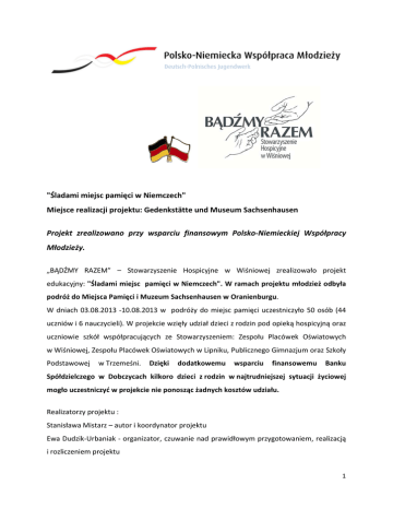 "Śladami miejsc pamięci w Niemczech" Miejsce realizacji projektu: Gedenkstätte und Museum Sachsenhausen Projekt zrealizowano przy wsparciu finansowym Polsko‐Niemieckiej Współpracy Młodzieży. „BĄDŹMY RAZEM” – Stowarzyszenie Hospicyjne w Wiśniowej zrealizowało projekt edukacyjny: "Śladami miejsc pamięci w Niemczech". W ramach projektu młodzież odbyła podróż do Miejsca Pamięci i Muzeum Sachsenhausen w Oranienburgu. W dniach 03.08.2013 ‐10.08.2013 w podróży do miejsc pamięci uczestniczyło 50 osób (44 uczniów i 6 nauczycieli). W projekcie wzięły udział dzieci z rodzin pod opieką hospicyjną oraz uczniowie szkół współpracujących ze Stowarzyszeniem: Zespołu Placówek Oświatowych w Wiśniowej, Zespołu Placówek Oświatowych w Lipniku, Publicznego Gimnazjum oraz Szkoły Podstawowej w Trzemeśni. Dzięki dodatkowemu wsparciu finansowemu Banku Spółdzielczego w Dobczycach kilkoro dzieci z rodzin w najtrudniejszej sytuacji życiowej mogło uczestniczyć w projekcie nie ponosząc żadnych kosztów udziału. Realizatorzy projektu : Stanisława Mistarz – autor i koordynator projektu Ewa Dudzik‐Urbaniak ‐ organizator, czuwanie nad prawidłowym przygotowaniem, realizacją i rozliczeniem projektu 1 Jan Chęciński ‐ kierownik wyjazdu, pośrednik językowy, przewodnik, nadzór merytoryczny nad prawidłową realizacją projektu Beata Górka ‐ nauczyciel historii, nadzór merytoryczny nad prawidłową realizacją projektu Marta Talaga – nauczyciel, pośrednik językowy, opiekun Urszula Bartosiewicz – nauczyciel, opiekun Stanisława Pyzio – nauczyciel, opiekun, współpraca w przygotowaniu projektu Rozpoczęcie programu edukacyjnego „W poszukiwaniu ludzkiej twarzy ‐ zrozumienie historii drogą do pojednania polsko‐niemieckiego” nastąpiło w Domu imienia Andrzeja Szczypiorskiego w Oranienburgu, który jest Międzynarodowym Ośrodkiem Spotkań Młodzieży a zarazem schroniskiem młodzieżowym. Pisarz Andrzej Szczypiorski był więźniem obozu koncentracyjnego Sachsenhausen i jest popularnym w Niemczech polskim pisarzem. Nazwanie tego domu jego imieniem podkreśla wagę porozumienia między Niemcami i Polakami, ze względów historycznych. Swoimi książkami Andrzej Szczypiorski szczególnie przyczynił się do porozumienia między Niemcami i Polakami, a także między Niemcami i Żydami. I wreszcie jest on niejako symbolem różnych faz XX wieku. Jako członek Armii Krajowej trafił do Sachsenhausen, po wyzwoleniu szybko stał się w socjalistycznej Polsce członkiem opozycji, w końcu senatorem pierwszego, solidarnościowego rządu. Przeżył więc dwie dyktatury, których tragicznym pokłosiem jest także Sachsenhausen, najpierw nazistowski obóz, potem sowiecki. Jego nazwisko znakomicie odpowiada zamierzeniom edukacyjnym ,,Gedenkstätte und Museum Sachsenhausen„. W schronisku młodzież wraz z opiekunami przygotowała się do zwiedzania Miejsca Pamięci i Muzeum Sachsenhausen. Rozmawiali z opiekunami o tym, że Polacy i Niemcy nie byli odwiecznymi wrogami. Jako „sąsiedzi od tysiąca lat“ przez długie okresy w historii żyli ze sobą w pokoju. Dopiero nacjonalizm na dłużej zakłócił stosunki polsko‐niemieckie. Smutną kulminacją wyobcowania była dyktatura nazistowska. Po ataku Niemiec na Polskę w 1939 roku i straszliwych zbrodniach popełnionych przez Niemców na narodzie polskim przepaść między naszymi narodami stała się tak głęboka, że powrót do normalności wydawał się prawie niewyobrażalny. Dlatego droga pojednania polsko‐niemieckiego jest trudna i długa. Zrozumienie historii może się znacznie przyczynić do pojednania. Kolejne dni uczestnicy projektu spędzali w byłym obozie koncentracyjnym Sachsenhausen. Za stronę merytoryczną programu w Miejscu Pamięci i Muzeum Sachsenhausen 2 odpowiedzialna była Pani Elisabeth Bürger – pracownik naukowy Miejsca Pamięci i Muzeum Sachsenhausen, która zaproponowała nam program edukacyjny: „W poszukiwaniu ludzkiej twarzy ‐ zrozumienie historii drogą do pojednania polsko‐ niemieckiego” oraz przygotowała materiały edukacyjne do zapoznania się z istotą nazizmu w miejscu jego zbrodni. Celem programu było odkrywanie prawdy historycznej, przekazanie wiedzy o powstaniu obozów, ich ofiarach i oprawcach, polityce okupacyjnej i polityce zagłady III Rzeszy, uświadamianie społecznych i psychologicznych mechanizmów zbrodni, rozwijanie myślenia historycznego i empatii. Uczestnicy projektu z zaangażowaniem pracowali pod kierunkiem przewodników Pani Anny Milarch oraz Pana Arne Pannen, którzy z wielką rozwagą i wyczuciem wprowadzali młodzież w trudne tematy. Poruszali w taktowny sposób bolesne tematy związane z negatywną przeszłością. Podczas pobytu w Sachsenhausen młodzież miała okazję przekonać się naocznie, czym były czasy II wojny światowej, czasy nienawiści, pogardy i zbrodni. Przewodnicy zapoznali uczestników projektu z wydarzeniami z historii Holokaustu, przybliżyli zagadnienia związane z martyrologią ofiar niemieckich nazistowskich obozów koncentracyjnych i zagłady. Wyjaśniali na czym polegał mechanizmy nazistowskiego aparatu terroru, zbrodni popełnionych w czasie II wojny światowej, represji i egzekucji ludności cywilnej. Jednocześnie uświadomili, że Miejsce Pamięci i Muzeum Sachsenhausen stanowi świadectwo działania totalitarnego systemu i jego przywódców w ideologicznej nienawiści do innych. Program inspirował do samodzielnego myślenia, interpretowania przeszłości, wyrażania własnych opinii, formułowania ocen oraz angażowania się w dyskusję nad przeszłością i teraźniejszością. Uczniowie prezentowali efekty pracy w grupach nad wybranymi przez siebie tematami. W dojrzały sposób wykorzystali wiedzę zdobywaną poprzez zapoznawanie się w miejscach historycznych z autentycznymi dokumentami i pomnikami przeszłości. Byli zdyscyplinowani, komunikatywni oraz chętni do wspólnego poznawani