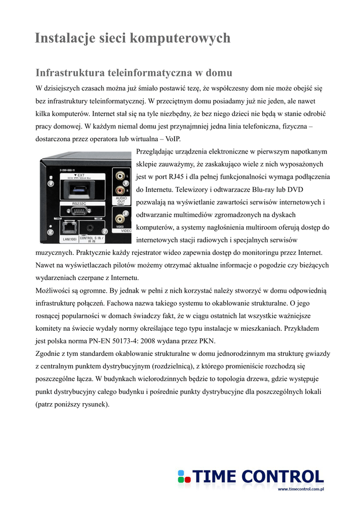 Instalacje sieci komputerowych Infrastruktura teleinformatyczna w domu W dzisiejszych czasach można już śmiało postawić tezę, że współczesny dom nie może obejść się bez infrastruktury teleinformatycznej. W przeciętnym domu posiadamy już nie jeden, ale nawet kilka komputerów. Internet stał się na tyle niezbędny, że bez niego dzieci nie będą w stanie odrobić pracy domowej. W każdym niemal domu jest przynajmniej jedna linia telefoniczna, fizyczna – dostarczona przez operatora lub wirtualna – VoIP. Przeglądając urządzenia elektroniczne w pierwszym napotkanym sklepie zauważymy, że zaskakująco wiele z nich wyposażonych jest w port RJ45 i dla pełnej funkcjonalności wymaga podłączenia do Internetu. Telewizory i odtwarzacze Blu-ray lub DVD pozwalają na wyświetlanie zawartości serwisów internetowych i odtwarzanie multimediów zgromadzonych na dyskach komputerów, a systemy nagłośnienia multiroom oferują dostęp do internetowych stacji radiowych i specjalnych serwisów muzycznych. Praktycznie każdy rejestrator wideo zapewnia dostęp do monitoringu przez Internet. Nawet na wyświetlaczach pilotów możemy otrzymać aktualne informacje o pogodzie czy bieżących wydarzeniach czerpane z Internetu. Możliwości są ogromne. By jednak w pełni z nich korzystać należy stworzyć w domu odpowiednią infrastrukturę połączeń. Fachowa nazwa takiego systemu to okablowanie strukturalne. O jego rosnącej popularności w domach świadczy fakt, że w ciągu ostatnich lat wszystkie ważniejsze komitety na świecie wydały normy określające tego typu instalacje w mieszkaniach. Przykładem jest polska norma PN-EN 50173-4: 2008 wydana przez PKN. Zgodnie z tym standardem okablowanie strukturalne w domu jednorodzinnym ma strukturę gwiazdy z centralnym punktem dystrybucyjnym (rozdzielnicą), z którego promieniście rozchodzą się poszczególne łącza. W budynkach wielorodzinnych będzie to topologia drzewa, gdzie występuje punkt dystrybucyjny całego budynku i pośrednie punkty dystrybucyjne dla poszczególnych lokali (patrz poniższy rysunek). Łącze powinno być nieprzerwanym odcinkiem przewodu skrętkowego na obydwu końcach zakończonego gniazdami RJ45. W punkcie dystrybucyjnym gniazda zgrupowane są zwykle w postaci paneli 10-calowych lub 19-calowych. Gniazda RJ45 na przeciwległych krańcach łączy, umieścić można w osprzęcie modularnym obok gniazd elektrycznych i telewizyjnych. Poniższy rysunek przedstawia wnętrze przykładowego punktu dystrybucyjnego dla domu. Wydajność łączy strukturalnych określona została w normach w postaci klas i odpowiadającego im pasma przenoszenia. Wydajność komponentów, z których powstają łącza (przewody, gniazda itp.) określa się kategoriami. Poniższa tabela przedstawia zestawienie klas okablowania z wartościami maksymalnego pasma przenoszenia i kategoriami komponentów. W warunkach domowych całkowicie wystarczająca jest klasa D okablowania – 100MHz, kategoria 5 (w starszych normach 5e), która zapewnia transmisję z prędkością do 1Gb/s (Ethernet 1000Base-T). Bardziej wymagających użytkowników domowych, nawykłych do wybierania renomowanych rozwiązań z „górnej półki” zaniepokoić może rekomendacja rozwiązania najniższej klasy. W tym wypadku nie ma się jednak czego obawiać. Okablowanie klasy D to technologia, która oferuje ogromny zapas parametrów w stosunku do wymogów aplikacji domowych. Wspiera ona Ethernet 1000Base-T z transmisją 1000Mb/s. Dla przykładu transmisja strumieniowa wideo o rozdzielczości Full HD wymaga przepustowości rzędu kilku Mb/s. Klasy wyższe – np. EA przeznaczone są dla zaawansowanych systemów komercyjnych – np. Centrów danych, gdzie w grę wchodzą transmisje rzędu 10Gb/s. Użytkownikom budującym systemy okablowania strukturalnego w domach polecamy rozwiązania ekranowane, najlepiej renomowanych firm o sprawdzonej jakości. Parametry łącza strukturalnego w bardzo dużym stopniu zależą od geometrycznego ułożenia par przewodów, jakości połączeń i ciągłości ekranu. Geometria przewodów (np. przekroje żył) zaburzona może zostać już na etapie produkcji na skutek nadmiernych oszczędności, jak również później w czasie transportu i instalacji – np. poprzez nadmierne załamania. Żeby więc uzyskać łącze o parametrach zgodnych z założoną klasą niezbędne są dwa czynniki. Potrzebujemy komponentów o parametrach rzeczywiście zgodnych z odpowiednią kategorią (np. 5), jak również musimy te komponenty prawidłowo zainstalować. Wybierając sprawdzone komponenty, wysokiej jakości pomagamy sobie w obydwu przypadkach. Po pierwsze mamy gwarancję parametrów znacznie przewyższających wymagania określonej kategorii. Po drugie dzięki temu marginesowi parametrów oraz dopracowanym rozwiązaniom mamy znacznie większe szanse prawidłowego i powtarzalnego montażu.