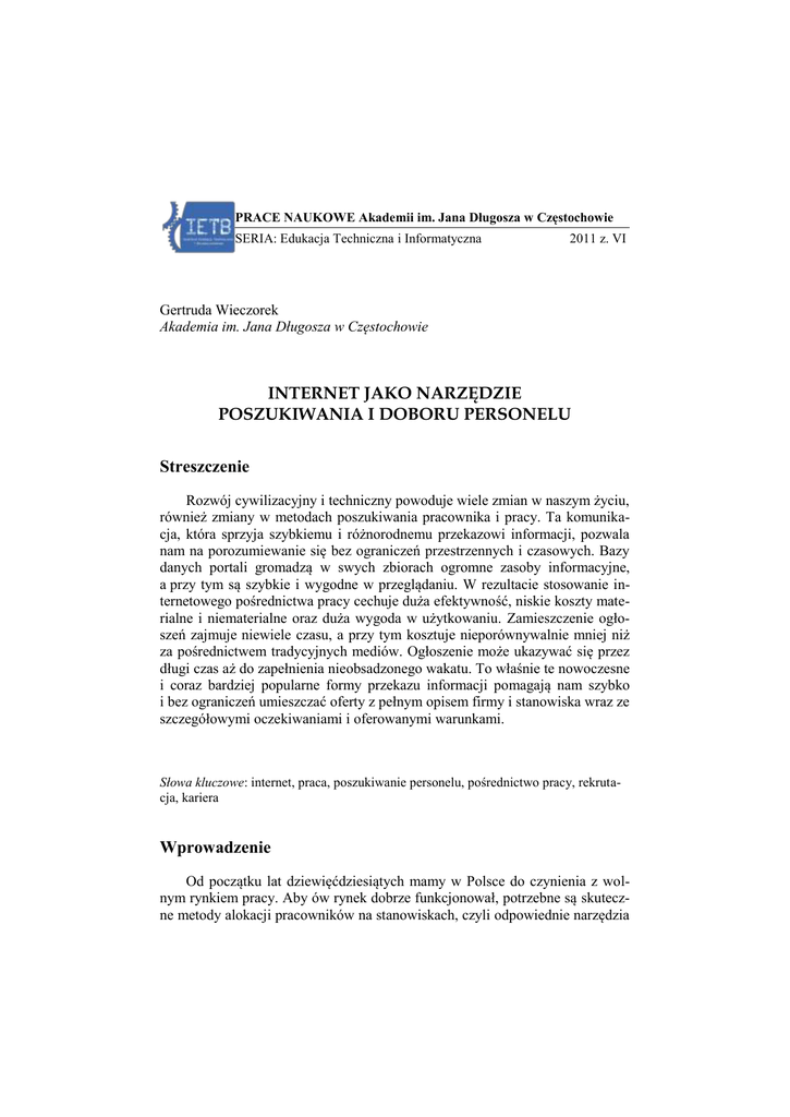 PRACE NAUKOWE Akademii im. Jana Długosza w Częstochowie SERIA: Edukacja Techniczna i Informatyczna 2011 z. VI Gertruda Wieczorek Akademia im. Jana Długosza w Częstochowie INTERNET JAKO NARZĘDZIE POSZUKIWANIA I DOBORU PERSONELU Streszczenie Rozwój cywilizacyjny i techniczny powoduje wiele zmian w naszym życiu, również zmiany w metodach poszukiwania pracownika i pracy. Ta komunikacja, która sprzyja szybkiemu i różnorodnemu przekazowi informacji, pozwala nam na porozumiewanie się bez ograniczeń przestrzennych i czasowych. Bazy danych portali gromadzą w swych zbiorach ogromne zasoby informacyjne, a przy tym są szybkie i wygodne w przeglądaniu. W rezultacie stosowanie internetowego pośrednictwa pracy cechuje duża efektywność, niskie koszty materialne i niematerialne oraz duża wygoda w użytkowaniu. Zamieszczenie ogłoszeń zajmuje niewiele czasu, a przy tym kosztuje nieporównywalnie mniej niż za pośrednictwem tradycyjnych mediów. Ogłoszenie może ukazywać się przez długi czas aż do zapełnienia nieobsadzonego wakatu. To właśnie te nowoczesne i coraz bardziej popularne formy przekazu informacji pomagają nam szybko i bez ograniczeń umieszczać oferty z pełnym opisem firmy i stanowiska wraz ze szczegółowymi oczekiwaniami i oferowanymi warunkami. Słowa kluczowe: internet, praca, poszukiwanie personelu, pośrednictwo pracy, rekrutacja, kariera Wprowadzenie Od początku lat dziewięćdziesiątych mamy w Polsce do czynienia z wolnym rynkiem pracy. Aby ów rynek dobrze funkcjonował, potrzebne są skuteczne metody alokacji pracowników na stanowiskach, czyli odpowiednie narzędzia 148 Gertruda Wieczorek dopasowania do siebie pracobiorców i pracodawców. W tym kontekście pozytywnym zjawiskiem może okazać się popularyzacja metod poszukiwania pracowników bazujących na wykorzystaniu sieci internetowych. Rozwój cywilizacyjny i techniczny powoduje również zmiany w metodach poszukiwania pracownika i pracy. Korzystaniu z komunikacji internetowej podczas poszukiwania pracy sprzyja jej specyfika, zwłaszcza brak ograniczeń przestrzennych i czasowych. Bazy danych portali gromadzą w swych zbiorach ogromne zasoby informacyjne, a przy tym są szybkie i wygodne w przeglądaniu. W rezultacie stosowanie internetowego pośrednictwa pracy cechuje duża efektywność, niskie koszty materialne i niematerialne oraz duża wygoda w użytkowaniu. Zamieszczanie ogłoszeń zajmuje niewiele czasu, a przy tym kosztuje nieporównywalnie mniej niż za pośrednictwem tradycyjnych mediów. Ogłoszenie może ukazywać się przez długi czas aż do zapełnienia nieobsadzonego wakatu. Internet pozwala również na umieszczanie oferty z pełnym opisem firmy i stanowiska wraz ze szczegółowymi oczekiwaniami i oferowanymi warunkami praktycznie bez ograniczeń. Dużym ułatwieniem nie tylko dla pracodawców, ale i dla kandydatów na nowe stanowiska pracy są internetowe bazy danych kandydatów, zawierające ich dane osobowe i pełny życiorys. Pozwalają one firmom na szybkie, samodzielne znalezienie odpowiedniego pracownika. Oferty pracy zamieszczane w gazetach wymagają dużo wyższych nakładów finansowych, a ich istnienie jest ograniczone w czasie. Dodatkowym utrudnieniem jest konieczność dotrzymywania terminów dostarczenia materiałów oraz stałe i sztywne terminy decyzji. Technika cyfrowa pozwalająca na zapis, przechowywanie, przetwarzanie, przesyłanie i udostępnianie wszelkich informacji w jednolitej postaci stała się, w wyniku rozwoju technologii mikroelektronicznej, podstawowym wynalazkiem, na którym opiera się funkcjonowanie i rozwój współczesnej cywilizacji. Technika ta nie tylko przenika do wszelkich dziedzin życia, ale także splata się z dotychczas realizowanymi w nich procesami. W dzisiejszych czasach staje się nawet integralną częścią tych procesów. Rozwój przestrzennie rozległych sieci cyfrowych sprawił, że czas dostępu do informacji zapisanej w postaci cyfrowej, w dowolnym miejscu świata, jest praktycznie natychmiastowy, a koszt przesyłania informacji staje się niezależny od odległości [13]. Mowa tu o Internecie, wynalazku, który zrewolucjonizował każdy sektor naszego życia. Wykorzystuje się go w dzisiejszych czasach na skalę globalną. Ilość aktywnych użytkowników Internetu na świecie szacuje się na 1 miliard, z czego 20 milionów stanowią Polacy [21]. Internet stał się również nieoceniony w biznesie, służącym codziennej wymianie korespondencji, reklamie i promocji, obsłudze klientów i publikowaniu danych. W dobie ostatnich lat stał się podstawowym narzędziem pracodawców na całym świecie [3]. Internet jako narzędzie poszukiwania … 149 Osobom niepełnosprawnym taka forma komunikacji ułatwia znalezienie pracy i nawiązanie kontaktów towarzyskich. W wielu krajach powstają obecnie programy, których celem jest zastosowanie Internetu w psychoterapii i poradnictwie psychologicznym, co może przynieść znaczne korzyści, szczególnie na obszarach, gdzie pacjenta od najbliższego terapeuty dzielą długie dystanse oraz w przypadku osób, które w kontakcie osobistym nie potrafią przełamać oporu przed rozmawianiem o swoich problemach [8]. Aspekt pracy w społeczeństwie informacyjnym We wszystkich krajach zachodzą ogromne przemiany w kwestii powstających nowych zawodów, gdyż zawody muszą odpowiadać przemianom zachodzącym na rynku pracy. W związku z rozwojem gospodarczym powstało w ostatnich latach wiele nowych zawodów, co odzwierciedla nowa Klasyfikacja zawodów i specjalności na potrzeby rynku pracy oraz zakresu jej stosowania (Rozporządzenie Ministra Pracy i Polityki Społecznej z dnia 27 kwietnia 2010 roku; Dz.U. z dnia 17.05.2010 r., Nr 82, poz. 537) Wraz ze zmianami na rynku pracy zmieniają się również formy zatrudnienia, zmienia się czas przebywania pracownika w firmie (np. telepraca, praca na odległość), zmieniają się również stosunki panujące w zakładach pracy, zwłaszcza mi