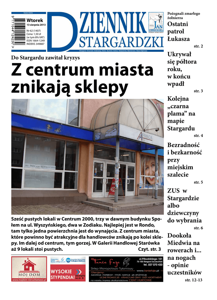 Pożegnali zmarłego żołnierza Wtorek Ostatni patrol Łukasza 13 sierpnia 2013 Nr 62 (1407) Cena: 1,50 zł (w tym 8% VAT) ISSN 1664-1249 INDEKS 349887 Do Stargardu zawitał kryzys Z centrum miasta znikają sklepy str. 2 Ukrywał się półtora roku, w końcu wpadł str. 3 Kolejna „czarna plama” na mapie Stargardu str. 4 Bezradność i bezkarność przy miejskim szalecie str. 5 Sześć pustych lokali w Centrum 2000, trzy w dawnym budynku Społem na ul. Wyszyńskiego, dwa w Zodiaku. Najlepiej jest w Rondo, tam tylko jedna powierzchnia jest do wynajęcia. Z centrum miasta, które powinno być atrakcyjne dla handlowców znikają po kolei sklepy. Im dalej od centrum, tym gorzej. W Galerii Handlowej Starówka aż 9 lokali stoi pustych. Czyt. str. 3 9 ZUS w Stargardzie albo dziewczyny do wybrania str. 6 Dookoła Miedwia na rowerach i... na nogach - opinie uczestników str. 12-13 2 13.08.2013 Wybudują chodnik na Morskiej Pożegnali zmarłego żołnierza Ostatni patrol Łukasza Biskup polowy Wojska Polskiego, ks. Józef Guzek przewodniczył piątkowym uroczystościom pogrzebowym Łukasza Sroczyńskiego, ciężko rannego podczas ataku na polskich żołnierzy w Afganistanie, w grudniu ub. roku. Starszy kapral ze zmiany 12 Szczecińskiej Dywizji Zmechanizowanej, na co dzień mieszkaniec Stargardu, zmarł 3 sierpnia w Wojskowym Instytucie Medycznym. Pośmiertnie awansowano go na starszego chorążego. Decyzją prezydenta RP został też odznaczony krzyżem kawalerskim Orderu Krzyża Wojskowego. 32- letni starszy chorąży pozostawił żonę i córkę. W kościele Miłosierdzia Bożego na stargardzkim Osiedlu Zachód pożegnali zmarłego: wiceminister obrony Waldemar Skrzypczak, dowództwo wojsk lądowych i 12 Szczecińskiej Dywizji. Patrol żołnierzy w południowo- zachodniej prowincji Ghazni w grudniu 2012 r. ostrzelali nieznani sprawców. W wymianie ognia zostało rannych lejnym miesiącem. -To ogromny smutek i żal- przyznaje kapitan Janusz Błaszczak ze Szczecińskiej Brygady Zmechanizowanej. -Podczas tych ośmiu miesięcy, kiedy Łukasz walczył o powrót do zdrowia, byliśmy razem z nim, wspieraliśmy go. Od samego początku mieliśmy nadzieję, że nadejdzie ten dzień, kiedy Łukasz otworzy oczy. Teraz -Trzech naszych kolegów zginęło w Iraku, trzech niestety straciło życia w Afganistaniepodsumowuje tragiczną statystykę. Zaznaczył przy tym, że szczecińska dywizja ma za sobą dwanaście zmian kolejnych ekip, wysyłanych do Afganistanu. -Wyjeżdżają tam najlepsi, bardzo dobrze wyszkoleni. Podczas wielomiesięcznego Rozstrzygnięto przetarg na budowę chodnika na ulicy Morskiej ogłoszony kilka tygodni temu przez wspólnie przez Gminę i Miasto Stargard Szczeciński. Obecnie wzdłuż ulicy można iść albo pasmem zieleni, albo ulicą. Wpłynęło osiem ofert, z czego najkorzystniejsza okazała się ta złożona przez stargardzką firmę Ben-Bruk. Inwestycja opiewa na 215,500 zł brutto. Roboty budowlane będą do- tyczyć: budowy chodnika z kostki gr. 8 cm szarej, rozbiórki części istniejących zjazdów do posesji, budowy zjazdów z kostki czerwonej, regulacji wysokościowej studzienek, wycinka zieleni, wykonania innych robót ujętych w przedmiarach robót. W czasie trwania inwestycji nastąpią niewielkie ograniczenia w ruchu. Planowo zakończenie robót ma nastąpić pod koniec października. Gabi Odeszli do wieczności ... Pochówki 10.08.2013 trzech żołnierzy. Łukasz Sroczyński odniósł najpoważniejsze obrażenia. O życie walczył przez kolejne miesiące. -Miałem okazję go odwiedzić- wspominał biskup polowy WP. -Mimo wysiłku lekarzy i pielęgniarek warszawskiego Wojskowego Instytutu Medycznego, ostatecznie jednak tę walkę przegrał. Wraz z rodziną, kolegami i przyjaciółmi żegnamy świętej pamięci Łukasza. To jest jego ostatni ziemski patrol, w otoczeniu dowódców i żołnierzy- mówił nad trumną starszego chorążego biskup polowy. jest trauma i ogromny żal- twierdzi. Zaraz jednak przyznaje, że to ryzyko wpisane w misję każdego żołnierza. -Wiemy, jakie mamy wypełnić rozkazy., przy całej świadomości zagrożeń, zwłaszcza w tych misjach- przypomina nasz rozmówca, informując, że przed wyjazdem szczecińskiej zmiany szkolono się przez 12 miesięcy, siedem spędzając na poligonach. Każdy z wyjeżdżających miał jednak świadomość, że z tej misji może nie powrócić. Do końca mieli nadzieję Zdzisław Wrona, oficer prasowy 12 szczecińskiej Dywizji Zmechanizowanej, przypomniał o smutnym bilansie misji. -Nasz kolega, starszy chorąży Łukasz Sroczyński jest szóstą ofiarą śmiertelną z szeregu żołnierzy naszej dywizji- informuje. Dobrych wieści ze szpitala Wojskowego Instytutu Medycznego, wyczekiwali wcześniej przyjaciele i znajomi starszego chorążego, mając nadzieję na przełamanie kryzysu, wraz z ko- Tragiczna zmiany szczecińskiej dywizji przygotowania mają czas na doskonalenie swoich umiejętności, zarówno indywidualnych, jak i pracy w zespole- zapewnia Major Zdzisław Wrona. Zaraz jednak dodaje, że trudno przewidzieć wszystkie sytuacje, które mogą zaskoczyć patrol na miejscu. Tym bardziej, że „kreatywność” uzbrojonych grup Afgańczyków nie zna granic. Od ponad dziesięciu lat naszej obecności w Afganistanie zginęło 41 żołnierzy polskiego kontyngentu wojskowego w Afganistanie. To, co dla wielu stanowi abstrakcję na ekranie telewizyjnych wiadomości, coraz bardziej zaczyna dotykać konkretne rodziny i osoby, tracące swoich bliskich na „dalekiej wojnie”, gdzie walka w piaskach pustyni zdaje się nie mieć końca, powiększając tragiczne zestawienia. Red. PIOTR TOŁOCZKO, zmarł 02.08.2013 wystawienie zwłok godz. 12 pogrzeb odbył się o godz. 13 na Starym Cmentarzu LUCJAN POSMYK, zmarł 08.08.2013 wystawienie zwłok godz. 13 pogrzeb odbył się o godz. 14 na Starym Cmentarzu Pochówki 13.08.2013 IRENA PILAROWSKA, zmarła 10.08.2013 wystawienie zwłok godz. 13.30 pogrzeb odbędzie si