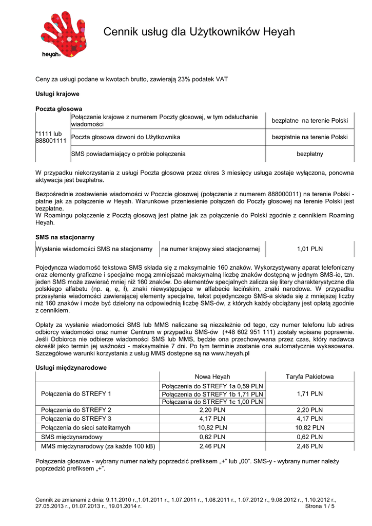 Cennik usług dla Użytkowników Heyah Ceny za usługi podane w kwotach brutto, zawierają 23% podatek VAT Usługi krajowe Poczta głosowa Połączenie krajowe z numerem Poczty głosowej, w tym odsłuchanie wiadomości *1111 lub Poczta głosowa dzwoni do Użytkownika 888001111 bezpłatne na terenie Polski bezpłatnie na terenie Polski SMS powiadamiający o próbie połączenia bezpłatny W przypadku niekorzystania z usługi Poczta głosowa przez okres 3 miesięcy usługa zostaje wyłączona, ponowna aktywacja jest bezpłatna. Bezpośrednie zostawienie wiadomości w Poczcie głosowej (połączenie z numerem 888000011) na terenie Polski płatne jak za połączenie w Heyah. Warunkowe przeniesienie połączeń do Poczty głosowej na terenie Polski jest bezpłatne. W Roamingu połączenie z Pocztą głosową jest płatne jak za połączenie do Polski zgodnie z cennikiem Roaming Heyah. SMS na stacjonarny Wysłanie wiadomości SMS na stacjonarny na numer krajowy sieci stacjonarnej 1,01 PLN Pojedyncza wiadomość tekstowa SMS składa się z maksymalnie 160 znaków. Wykorzystywany aparat telefoniczny oraz elementy graficzne i specjalne mogą zmniejszać maksymalną liczbę znaków dostępną w jednym SMS-ie, tzn. jeden SMS może zawierać mniej niż 160 znaków. Do elementów specjalnych zalicza się litery charakterystyczne dla polskiego alfabetu (np. ą, ę, ł), znaki niewystępujące w alfabecie łacińskim, znaki narodowe. W przypadku przesyłania wiadomości zawierającej elementy specjalne, tekst pojedynczego SMS-a składa się z mniejszej liczby niż 160 znaków i może być dzielony na odpowiednią liczbę SMS-ów, z których każdy obciążany jest opłatą zgodnie z cennikiem. Opłaty za wysłanie wiadomości SMS lub MMS naliczane są niezależnie od tego, czy numer telefonu lub adres odbiorcy wiadomości oraz numer Centrum w przypadku SMS-ów (+48 602 951 111) zostały wpisane poprawnie. Jeśli Odbiorca nie odbierze wiadomości SMS lub MMS, będzie ona przechowywana przez czas, który nadawca określił jako termin jej ważności - maksymalnie 7 dni. Po tym terminie zostanie ona automatycznie wykasowana. Szczegółowe warunki korzystania z usług MMS dostępne są na www.heyah.pl Usługi międzynarodowe Nowa Heyah Połączenia do STREFY 1 Połączenia do STREFY 2 Połączenia do STREFY 3 Połączenia do sieci satelitarnych SMS międzynarodowy MMS międzynarodowy (za każde 100 kB) Połączenia do STREFY 1a 0,59 PLN Połączenia do STREFY 1b 1,71 PLN Połączenia do STREFY 1c 1,00 PLN 2,20 PLN 4,17 PLN 10,82 PLN 0,62 PLN 2,46 PLN Taryfa Pakietowa 1,71 PLN 2,20 PLN 4,17 PLN 10,82 PLN 0,62 PLN 2,46 PLN Połączenia głosowe - wybrany numer należy poprzedzić prefiksem „+” lub „00”. SMS-y - wybrany numer należy poprzedzić prefiksem „+”. Cennik ze zmianami z dnia: 9.11.2010 r.,1.01.2011 r., 1.07.2011 r., 1.08.2011 r., 1.07.2012 r., 9.08.2012 r., 1.10.2012 r., 27.05.2013 r., 01.07.2013 r., 19.01.2014 r. Strona 1 / 5 LISTA KRAJÓW I STREF Austria, Azory, Belgia, Cypr, Czechy, Dania, Estonia, Finlandia, Francja, Gibraltar, Grecja, Połączenia do STREFY Gujana Francuska, Gwadelupa, Hiszpania, Holandia, Irlandia, Islandia, Liechtenstein, 1a dla taryfy Nowa Litwa, Luksemburg, Łotwa, Madera, Malta, Martynika, Niemcy, Norwegia, Portugalia, Heyah Reunion, Rumunia, Słowacja, Słowenia, Szwecja, Watykan, Węgry, Wielka Brytania, Włochy, Wyspy Kanaryjskie STREFA 1 b dla taryfy Albania, Andora, Białoruś, Bośnia i Hercegowina, Chorwacja, Czarnogóra, Macedonia, Nowa Heyah Mołdawia, Monako, Rosja, San Marino, Serbia, Szwajcaria, Ukraina, Wyspy Owcze STREFA 1 c dla taryfy Nowa Heyah Bułgaria, STREFA 1 dla Taryfy Pakietowej Albania, Andora, Austria, Belgia, Białoruś, Bośnia i Hercegowina, Bułgaria, Chorwacja, Cypr, Czarnogóra, Czechy, Dania, Estonia, Finlandia, Francja, Gibraltar, Grecja, Hiszpania, Holandia, Irlandia, Islandia, Lichtenstein, Litwa, Luksemburg, Łotwa, Macedonia, Malta, Mołdawia, Monako, Niemcy, Norwegia, Portugalia, Rosja, Rumunia, San Marino, Serbia, Słowacja, Słowenia, Szwajcaria, Szwecja, Ukraina, Watykan, Węgry, Wielka Brytania, Włochy, Wyspy Owcze STREFA 2 Algieria, Armenia, Australia, Azerbejdżan, Egipt, Gruzja, Izrael, Kanada, Kazachstan, Kirgizja, Maroko, Nowa Zelandia, Tadżykistan, Tunezja, Turcja, USA, Uzbekistan STREFA 3 Pozostałe kraje Lista sieci satelitarnych Emsat, Inmarsat, Iridium, Thuraya Opłaty za połączenia międzynarodowe naliczane są za każdą rozpoczętą minutę. Połączenia międzynarodowe oraz możliwość wysyłania wiadomości SMS i MMS do niektórych krajów mogą być ograniczone. Maksymalna wielkość pojedynczej wiadomości MMS międzynarodowy wynosi 300 kB. W przypadku wysłania MMSa międzynarodowego o wielkości powyżej 100 kB zostanie pobrana opłata stanowiąca odpowiednią wielokrotność opłaty cennikowej. ROAMING Heyah Heyah Eurotaryfa i Strefy Połączenia wychodzące przychodzące Strefa roamingowa 1A 1,22 PLN 0,36 PLN SMS-y wysłanie SMS-a wysłanie SMS-a specjalnego wysłanie SMS-a głosowego MMS-y odebranie SMS-a opłata za opłata za wysłanie wysłanie SMS-a w SMS-a w 0,41 PLN Roamingu Roamingu zgodna z zgodna z taryfą + opłata taryfą + opłata za SMS za SMS specjalny głosowy bezpłatnie zgodna z zgodna z taryfą taryfą 1,97 PLN wysłanie lub odebranie wiadomości MMS w Roamingu 2,30 PLN za każdą wiadomość MMS (maksymalnie do 300 kB) Strefa roamingowa 6,05 PLN 1B Strefa 4,03 PLN za roamingowa 12,10 PLN 6,05 PLN każde 100 kB 2 Strefa roamingowa 18,14 PLN 3 Połączenia przychodzące w Strefie roamingowej 1 A naliczane są za każdą sekundę połączenia - 1/60 stawki minutowej. Połączenia wychodzące w Strefie roamingowej 1 A naliczane są za pierwsze rozpoczęte 30 sekund połowa stawki minutowej, a następnie za każdą sekundę - 1/60 stawki minutowej. Połączenia przychodzące i wychodzące w Strefach roamingowych 1B, 2 i 3 naliczane są za każdą rozpoczętą minutę. Cennik ze z
