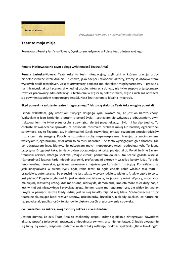 Prawdziwe rozmowy z niezwykłym człowiekiem Teatr to moja misja Rozmowa z Renatą Jasińską-Nowak, Dyrektorem jedynego w Polsce teatru integracyjnego. Renata Piątkowska: Na czym polega wyjątkowość Teatru Arka? Renata Jasińska-Nowak: Teatr Arka to teatr integracyjny, czyli taki w którym pracują osoby niepełnosprawne intelektualnie i ruchowo, jako adepci i zawodowi aktorzy, którzy są absolwentami wyższych szkół teatralnych. Zespół artystyczny ponadto ma charakter międzynarodowy – pracuje z nami francuski aktor i scenograf w jednej osobie. Integracja dotyczy nie tylko zespołu artystycznego, również pracownicy administracyjni i techniczni w części są pełnosprawni, część z nich zaś odznacza się pewnym stopniem niepełnosprawności. Nasz Teatr zatem to idealna integracja. Skąd pomysł na założenie teatru integracyjnego? Jak to się stało, że Teatr Arka w ogóle powstał? Przede wszystkim, gdy urodziłam swojego drugiego syna, okazało się, że jest on bardzo chory. Walczyłam o jego istnienie, a potem o jakość życia. I spotkałam się wówczas z odrzuceniem, złym traktowaniem nie tylko przez osoby z zewnątrz, ale też przez lekarzy. Było mi bardzo trudno. To osobiste doświadczenie sprawiło, że doskonale rozumiem problem mniej lub bardziej ograniczonej sprawności, czy to fizycznej, czy intelektualnej. Dzięki rozwiniętej empatii rozumiem emocje rodziców i to z czym się zmagają. Podobnie rozumiem osoby niepełnosprawne. Pracując ze swoim synem, walczyłam z jego brakami, widziałam to co musi nadrobić – de facto wyciągnęłam go z choroby. Tak jak odczuwałam jego, identycznie odczuwam moich niepełnosprawnych podopiecznych. To jedna przyczyna. Druga jest taka, że kiedy byłam początkującą aktorką, przyjechał do Polski Jérôme Savary, francuski reżyser, którego spektakl „Magic circus” pamiętam do dziś. Na scenie gościła wszelka różnorodność ludzka: karły, niepełnosprawni, profesjonalni aktorzy – wszelkie kolory ludzi. To było fenomenalne, niezwykłe, genialne, wykonane z największym kunsztem i precyzją. Pomyślałam, że jeśli kiedykolwiek w swoim życiu będę robić teatr, to będę chciała robić właśnie taki teatr – prawdziwy, autentyczny. Bo przecież nie jest tak, że wszyscy ludzie są piękni… A tak w ogóle to co to jest piękno? Pojęcie względne! To jest właśnie najciekawsze, że jesteśmy różni. Wysocy, niscy. Ktoś ma piękną, klasyczną urodę, ktoś ma trudną, niezwykłą, demoniczną. Kobieta może mieć duży nos, a jest w niej coś niezwykłego i przyciągającego, innym razem ma regularne rysy, ale widok jej twarzy umyka w pamięci. Jeszcze kiedy indziej jest w niej światło, bije od niej blask. Średniowieczne trupy teatralne skupiające ludzi różnych stanów, uciekinierów, brzydkich, niekiedy kalekich, co naturalnie też przyciągało publiczność – to stanowiło piękny sposób przedstawienia człowieka. Co uważa Pani za sukces, swój osobisty sukces i sukces teatru? Jestem dumna, że dziś Teatr Arka to znakomity zespół, który się pięknie zintegrował. Zawodowi aktorzy potrafią tolerować i pracować z niepełnosprawnymi, a to nie jest łatwe. Ci ludzie zwyczajnie się lubią. Są razem, wspólnie. Ostatnio miałam taką refleksję, podczas spektaklu „Bal u Hawkinga”: moi niepełnosprawni adepci niczym profesjonaliści są na scenie od początku do końca; wyraźnie mówią, znakomicie grają, tańczą. To przeszło moje najśmielsze oczekiwania, sama niekiedy jestem zdumiona – że są aż tak wyprowadzeni z choroby, że ich gra jest na tak wysokim poziomie – oni są prawdziwymi aktorami. Że przez te lata tak bardzo się rozwinęli intelektualnie, emocjonalnie, ruchowo. Oczywiście mają pewne ograniczenia, ale po latach współpracy ich kondycja jest nieporównywalna ze stanem pierwotnym. Mają dyscyplinę, czują odpowiedzialność, jednocześnie potrafią pielęgnować w sobie dziecko, a ich zachowanie jest przy tym naturalne i społecznie akceptowalne. Ludzie pełnosprawni nie zawsze potrafią się tak zachowywać, bo wszyscy są przekonani, że im nie wypada. A tak znacznie łatwiej walczyć ze stresem. Czy trudno jest być dyrektorem teatru? Szczególnie dyrektorem teatru integracyjnego? Bardzo trudno, a mówię o tym nie po to, by się żalić. Bardzo bym chciała, by powstawały podobne teatry, bo mielibyśmy z kim rywalizować. Ale to nie jest łatwe i pewnie dlatego takie teatry nie powstają jak grzyby po deszczu. Teatrem trzeba zarządzać, prowadzić wszystkie bieżące sprawy. Oprócz tego również reżyseruję. Ponadto muszę być też trochę terapeutą. Muszę mieć oczy szeroko otwarte i intuicję nakierowaną na wszystkich członków Zespołu, żeby zapobiegać czy rozwiązywać problemy, a o te dość łatwo w integracyjnym zespole. Rywalizują niepełnosprawni z niepełnosprawnymi, ale też z zawodowymi aktorami. Bo to nieprawda, że artystyczna rywalizacja dotyczy wyłącznie profesjonalnych aktorów. Prowadzenie takiego zespołu nie jest proste, ale możliwe. Wymyśliłam sobie, że będzie w teatrze równość, tolerancja, sprawiedliwość i zachowanie, utrzymanie tych wartości wymaga wysiłku. Należy też pamiętać, że niepełnosprawni są niesłychanie delikatni, wrażliwi. W moim teatrze nie ma miejsca na przejawy agresji czy przemocy – tutaj musi być poczucie bezpieczeństwa, rodzina, a jednocześnie dyscyplina. I to wszystko trzeba pogodzić. Gdyby nie prowadziła Pani teatru, czym by się Pani zajmowała? Byłabym aktorką. Bo ja uwielbiam grać na scenie. Teraz właściwie zrezygnowałam ze wszystkiego na rzecz prowadzenia teatru. Ale to jest dla mnie pierwszy zawód. Ja to kocham i zazdroszczę swoim aktorom. Jak ja Ci zazdroszczę – powtarzam niekiedy – że Ty grasz… A trzeba pamiętać, że aktorzy to jest taki szczególny rodzaj ludzi, którzy narzekają dwa razy: jak grają i jak nie grają. (Serdeczny 