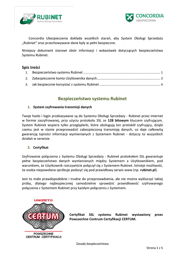 Concordia Ubezpieczenia dokłada wszelkich starań, aby System Obsługi Sprzedaży „Rubinet” oraz przechowywane dane były w pełni bezpieczne. Niniejszy dokument stanowi zbiór informacji i wskazówek dotyczących bezpieczeństwa Systemu Rubinet. Spis treści 1. Bezpieczeństwo systemu Rubinet .......................................................................................... 1 2. Zabezpieczenie konta Użytkownika danych.......................................................................... 3 3. Jak bezpiecznie korzystać z systemu Rubinet ....................................................................... 4 Bezpieczeństwo systemu Rubinet 1. System szyfrowania transmisji danych Twoje hasło i login przekazywane są do Systemu Obsługi Sprzedaży - Rubinet przez internet w formie zaszyfrowanej, przy użyciu protokołu SSL ze 128 bitowym kluczem szyfrującym. System Rubinet wspiera tylko przeglądarki, które obsługują ten protokół szyfrujący, dzięki czemu jest w stanie przeprowadzić zabezpieczoną transmisję danych, co daje całkowitą gwarancję tajności informacji wymienianych z Systemem Rubinet - dotyczy to wszystkich działań w serwisie. 2. Certyfikat Szyfrowanie połączenia z Systemu Obsługi Sprzedaży - Rubinet protokołem SSL gwarantuje pełne bezpieczeństwo danych wymienianych między Systemem a Użytkownikiem, pod warunkiem, że Użytkownik rzeczywiście połączył się z Systemem Rubinet. Istnieje możliwość, że osoba niepowołana spróbuje podszyć się pod prawidłowy serwis www (np. rubinet.pl). Jest to mało prawdopodobne i trudne do przeprowadzenia, ale nie można wykluczyć takiej próby, dlatego najbezpieczniej samodzielnie sprawdzić prawidłowość szyfrowanego połączenia z Systemem Rubinet przy każdym połączeniu z Systemem. Certyfikat SSL systemu Rubinet wystawiony Powszechne Centrum Certyfikacji CERTUM. przez Zasady bezpieczeństwa Strona 1 z 5 Dane o certyfikacie SSL dostępne są w przeglądarce Internet Explorer z rozwijalnego menu „Plik” opcja „Właściwości” (Odpowiednio „File” i „Properties” w anglojęzycznych wersjach przeglądarki). Po wybraniu przycisku „Certyfikaty” należy sprawdzić następujące pozycje: 'Ogólne' (ang. 'General') 'Szczegóły' (ang. 'Details') W zakładce ze szczegółami należy zwrócić uwagę na pole - odcisk palca („Details”, „Thumbprint”). Dla Systemu Rubinet pole to powinno mieć wartość: E9 81 F0 DF 1A C1 3C 17 B8 10 B0 D7 74 31 A2 3A A9 22 2F D5 Użytkownicy, którzy pracują na systemach operacyjnych Windows i korzystają z usług Systemu Rubinet, powinni się upewnić, że mają wgrane wszystkie aktualizacje do systemu, które zabezpieczają przed nieprawidłową identyfikacją strony. Do danych certyfikatu można dotrzeć także klikając dwukrotnie na ikonę połączenia szyfrowanego (żółtą kłódkę), która pojawia się na pasku stanu przeglądarki. Informacje na temat aktualizacji do oprogramowania Windows znajdziesz na stronie: http://technet.microsoft.com/en-us/security/bulletin 3. Nowoczesne Data Center Serwery Systemu Rubinet znajdują się w jednym z najnowocześniejszych Data Center w Polsce, które spełnia najwyższe standardy techniczne i środowiskowe w zakresie bezpieczeństwa organizacyjnego, zasilania, klimatyzacji i łącz telekomunikacyjnych. Potwierdzone zewnętrznymi certyfikatami i audytami. 4. Cookies Po pomyślnej autoryzacji użytkownika w Systemie Rubinet, tworzone jest COOKIE przechowujące identyfikator sesji: (JSESSIONID, przykładowa wartość: 5B8152A6382154772CD9C62521E7B665). Jest to jedyne ciasteczko generowane przez system. W szczególności, nie zawiera ono hasła Użytkownika ani Jego loginu. Ciasteczko wygasa po zakończeniu sesji. Zasady bezpieczeństwa Strona 2 z 5 Zabezpieczenie konta Użytkownika i danych 1. Identyfikatory i hasła Wykonanie dowolnej operacji wymaga zalogowania się do Systemu. Każdy Użytkownik posiada następujące dane: login - niepowtarzalny identyfikator Użytkownika, hasło - hasło Użytkownika. Ze względów bezpieczeństwa hasło Użytkownika nie jest przechowywane w systemie (nie ma więc możliwości jego wykradzenia) - przechowywany jest tylko tzw. zaszyfrowany skrót hasła - hash. Utrata starego hasła powoduje konieczność uzyskania nowego. Hasło do systemu musi spełniać wymogi ustawy o ochronie danych osobowych. W szczególności powinno: - mieć minimum 8 znaków, - zawierać przynajmniej jedną małą i wielką literę alfabetu łacińskiego, - zawierać przynajmniej jedną cyfrę lub znak niealfabetyczny (np. !, $, #, %), - być zmieniane co 30 dni lub częściej. Dodatkowo nie może zawierać loginu Użytkownika ani jego części dłuższej niż dwa kolejne znaki. 2. Ustawa o ochronie danych osobowych System Rubinet spełnia wszystkie wymagania przedstawione w "Rozporządzenie ministra spraw wewnętrznych i administracji z dnia 29 kwietnia 2004 r. w sprawie dokumentacji przetwarzania danych osobowych oraz warunków technicznych i organizacyjnych, jakim powinny odpowiadać urządzenia i systemy informatyczne służące do przetwarzania danych osobowych (Dz. U. z 2004 r. Nr 100, poz. 1024) " na poziomie wysokim. Dotyczy to kwestii ochrony technicznej, kryptograficznej jak i polityki haseł. Concordia Polska jest administratorem danych osobowych przechowywanych w Systemie. 3. Bezpieczne uprawnienia Każdy Użytkownik Systemu Rubinet posiada zestaw indywidualnych uprawnień składających się na rolę. Uprawnienia te regulują w sposób precyzyjny poziom dostępu do elementów Systemu na poziomie Użytkownika jak i Organizacji. Zastosowanie takiego rozwiązania budowy uprawnień, w znaczny sposób wspomaga Administratorów Systemu w bezpiecznym zarządzaniu Użytkownikami Rubinetu oraz gwarantuje ochronę przed nieuprawnionym korzystaniem z elementów Systemu przez osoby trzecie. Zasady bezpieczeństwa Strona 3 z 5 Jak bezpiecznie korzystać z systemu Rubinet Nigdy nie u