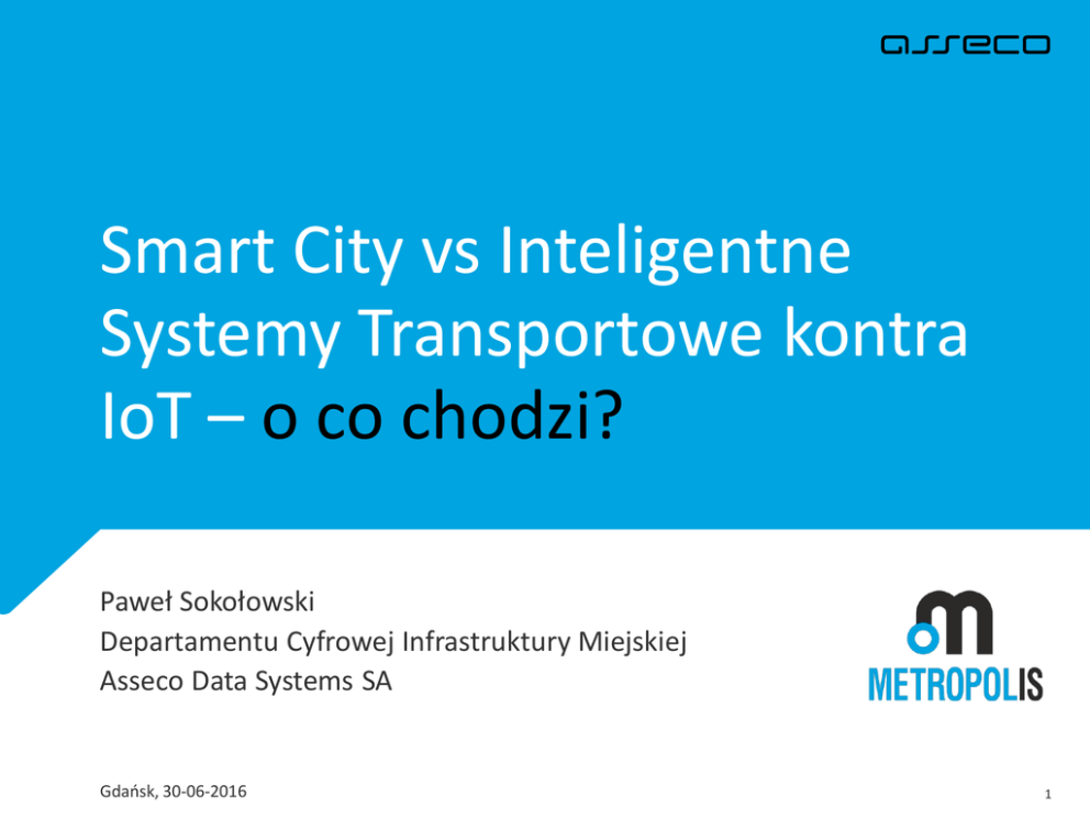 Smart City vs Inteligentne Systemy Transportowe kontra IoT – o co chodzi? Paweł Sokołowski Departamentu Cyfrowej Infrastruktury Miejskiej Asseco Data Systems SA Gdańsk, 30-06-2016 1 Program prezentacji Inteligentne systemy miejskie ① Wstęp ② Podejście Asseco do Smart City – Platforma Metropolis → Platforma do zarządzania miastem → Technologie → Korzyści ③ Kierunki rozwoju opłat miejskich i transportowych ④ Wdrożenia Asseco projektów Inteligentnych Miast ⑤ Podsumowanie 2 Rozwój i główne cele inteligentnego miasta Bezpieczeństwo Poprawa życia Mobilność Zarządzanie Ekologia 3 Strategiczne podejście do Smart City Prezydent (Zarządca Ruchu) PRZESTRZEŃ INTELIGENTNEGO MIASTA Krajowy System Zarządzania Ruchem Drogowym Jednostka ds. nadzoru i koordynacji nad działaniami i rozwojem Infrastruktury „ Inteligentne Miasto” Centrum Zarządzania Kryzysowego (wojewódzkie/ogólnopolskie) Inteligentne Centrum Operacyjne ITS / moduł analiz / Business Inteligence / Szyna danych Infrastruktura telekomunikacyjna przewodowa i bezprzewodowa / sieci metropolitarne Jednostki „Inteligentnego Miasta” Zarząd Transportu Miejskiego – ITS A Zarząd Jednostek Usług Komunalnych Zarząd Dróg Miejskich – ITS B Infrastruktura poboru opłat Transportu Publicznego Karta Miejska Infrastruktura Strefy Parkingowej, Preselekcji wagowej, Ograniczenia ruchu w centrum Systemy poborów opłat Infrastruktura Obszarowego Sterowania Ruchem Sygnalizacja Świetlna Infrastruktura Dynamicznej Informacji Pasażerskiej SDIP Infrastruktura wodociągowa i kanalizacyjna Systemy zarządzania i monitoringu infrastruktury komunalnej Infrastruktura informacyjna i Bezpieczeństwa Ruchu Drogowego CCTV + Znaki Zmiennej Treści System Zarządzania Transportem Publicznym ERP + CRM Infrastruktura do monitoringu Wywozu odpadów i zanieczyszczeń Systemy nadzoru i monitoringu Zarządzania odpadami i ekologią System centrum Adaptacyjnego Obszarowego Sterowania Ruchem Drogowym Centrum Sterowania Departament Informatyki – ITS C Systemy nadzoru nad infrastrukturą Systemy nadzoru nad aplikacjami Asseco Metropolis. 5 Asseco Metropolis Platforma do zarządzania miastem Zintegrowany interfejs Zarządzanie strategiczne Społeczeństwo Zintegrowany interfejs użytkownika zbiera i wymienia informacje ze wspólnych zasobów Zarządzanie strategiczne zapewnia poprawę pracy i koordynacji różnych służb miejskich Społeczeństwo otrzymuje łatwy dostęp do informacji 6 Główne cechy platformy Metropolis Zbieranie i wymiana informacji • Współdzielenie informacji w czasie rzeczywistym pomiędzy służbami i departamentami • Optymalne wykorzystanie i zarządzanie wspólnymi zasobami • Wsparcie jednostek terenowych i zespołów mobilnych, komunikacja Przewidywanie problemów i minimalizację ich wpływu na organizację • Aktualna informacja na temat bieżącego stanu i zachowania systemów zintegrowanych • Działania pro-aktywne które pozwalają identyfikować, zarządzać i rozwiązywać problemy wpływające negatywnie na stan działania różnych systemów w organizacji dzięki analizom danych historycznych i bieżących Koordynację zasobów w celu efektywnej i szybkiej reakcji na problemy • Wykorzystanie zautomatyzowanych procedur operacyjnych w celu koordynacji zasobów w odpowiedzi na zdarzenia • Pro-aktywne przygotowanie planów kryzysowych na bazie analiz danych historycznych w celu zmniejszenia negatywnego wpływu zdarzeń na funkcjonowanie organizacji 7 Kierunek rozwoju Metropolis – OBSZARY Bezpieczeństwo Informacje środowiskowe Inteligentne oświetlenie Ekologia Energia Inteligentne budynki Nowoczesny Transport Big Data - Mieszkańcy 8 Metropolis – Architektura logiczna Prezentacja Centrum Zarządzania Ruchem Centrum Zarządzania Transportem Mieszkańcy Policja Straż Miejska Jednostki Komunalne Integracja standard Metropolis Zdarzenia Raporty Archiwum Strategie Szyna Danych (ESB) Integracja dziedzinowa Adapter Adapter Adapter Adapter Adapter Transport Bezpieczeństwo Światło Energia Środowisko Inne systemy: → Mieszkańcy → Windykacja Meteo 9 … → →… 9 Technologie 10 Internet of Things – CZUJNIKI 1. Platforma dla sieci czujników 2. Czujniki prawie 60 typów 3. Konfiguracja w kilku prostych krokach 4. Przykładowe użycie Smart Parking, Smart Water 11 Zintegrowane latarnie jako czujniki Inteligentne oświetlenie Kontrola bezpieczeństwa Analiza ruchu Analiza parkowania Dodatkowe setki aplikacji Jedna sieć Bez prac wykopowych 12 Prezentacja Metropolis 13 Platforma Metropolis – Funkcjonalności 14 Kierunki rozwoju systemów opłat miejskich i transportowych 15 Płatności w transporcie publicznym w najbliższych latach 16 Przyszłość kart miejskich….czy ich koniec? • Migracja aplikacji z kart pamięciowych i procesorowych do aplikacji na smartfony z NFC • Ewolucja systemów poborów opłat w kierunku pracy z identyfikatorami dowolnego typu i transakcyjność on-line lub semi-online (postprocessing) → Karta miejska starego typu → Karta płatnicza Paypass/Paywave → Bilety z kodami 2/3D lub na telefonie → Dowolny dokument elektroniczny (dowód, legitymacja, paszport) → Odcisk palca ;) • Karty miejskie będą musiały być wielozadaniowe lub nie będzie ich wcale… 17 Systemy Kart Miejskich w chmurze – daleka czy niedaleka przyszłość ? Zalety i korzyści: • Wykorzystanie IaaS w modelu hybrydowym lub chmurowym – coraz taniej, lepiej i wydajniej • Analityka i raporty „on demand” i „pay per View” • Zaawansowany BI dla tych co lubią analizować swoje dane historyczne i aktualne • Kasowniki i autokomputery jako Internet of Things • Płatności kartami płatniczymi w chmurze – aplikacja w chmurze = tani terminal Wady ?: • Wyzbycie się własnego sprzętu serwerowego • Trudne do przeliczenia prawdziwe zapotrzebowanie na usługę (i którą) • Jak to rozliczyć w ramach projektu współfinansowanego z funduszy UE 18