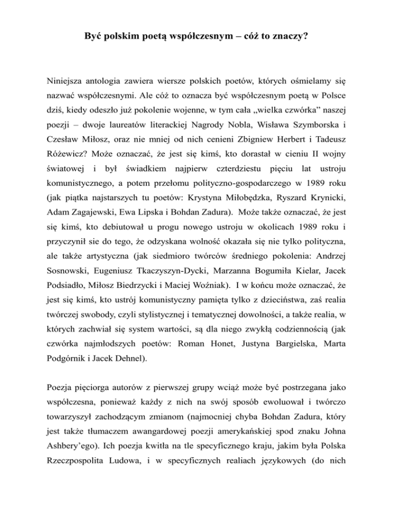 Być polskim poetą współczesnym – cóż to znaczy? Niniejsza antologia zawiera wiersze polskich poetów, których ośmielamy się nazwać współczesnymi. Ale cóż to oznacza być współczesnym poetą w Polsce dziś, kiedy odeszło już pokolenie wojenne, w tym cała „wielka czwórka” naszej poezji – dwoje laureatów literackiej Nagrody Nobla, Wisława Szymborska i Czesław Miłosz, oraz nie mniej od nich cenieni Zbigniew Herbert i Tadeusz Różewicz? Może oznaczać, że jest się kimś, kto dorastał w cieniu II wojny światowej i był świadkiem najpierw czterdziestu pięciu lat ustroju komunistycznego, a potem przełomu polityczno-gospodarczego w 1989 roku (jak piątka najstarszych tu poetów: Krystyna Miłobędzka, Ryszard Krynicki, Adam Zagajewski, Ewa Lipska i Bohdan Zadura). Może także oznaczać, że jest się kimś, kto debiutował u progu nowego ustroju w okolicach 1989 roku i przyczynił sie do tego, że odzyskana wolność okazała się nie tylko polityczna, ale także artystyczna (jak siedmioro twórców średniego pokolenia: Andrzej Sosnowski, Eugeniusz Tkaczyszyn-Dycki, Marzanna Bogumiła Kielar, Jacek Podsiadło, Miłosz Biedrzycki i Maciej Woźniak). I w końcu może oznaczać, że jest się kimś, kto ustrój komunistyczny pamięta tylko z dzieciństwa, zaś realia twórczej swobody, czyli stylistycznej i tematycznej dowolności, a także realia, w których zachwiał się system wartości, są dla niego zwykłą codziennością (jak czwórka najmłodszych poetów: Roman Honet, Justyna Bargielska, Marta Podgórnik i Jacek Dehnel). Poezja pięciorga autorów z pierwszej grupy wciąż może być postrzegana jako współczesna, ponieważ każdy z nich na swój sposób ewoluował i twórczo towarzyszył zachodzącym zmianom (najmocniej chyba Bohdan Zadura, który jest także tłumaczem awangardowej poezji amerykańskiej spod znaku Johna Ashbery’ego). Ich poezja kwitła na tle specyficznego kraju, jakim była Polska Rzeczpospolita Ludowa, i w specyficznych realiach językowych (do nich odnosili sie szczególnie Ewa Lipska i Ryszard Krynicki). Zewsząd brzmiała partyjna nowomowa, język, w którym słowa miały kompletnie opaczne znaczenie i służyły nie do referowania świata, ale do budowania jego fałszywego obrazu (któremu najżarliwiej sprzeciwiały sie wiersze Adama Zagajewskiego). Ale z drugiej strony barykady stał zniekształcający rzeczywistość patetyczny dyskurs wolnościowy, karmiący się mitem „oblężonego miasta”, niepokalanej konduity jego obrońców (m.in. dlatego poezja Krystyny Miłobędzkiej pozostawała całkiem głucha na ten dualizm rzeczywistości i pogrążona w apolitycznym fenomenie czystego istnienia). Jednym z głównych haseł polskiej „Solidarności” w latach 80. było wprowadzenie demokratycznego pluralizmu. Znalazło to później odbicie nie tylko w wielości partii politycznych, ale i, co zaskakujące, w większej jeszcze rozmaitości poetyckich języków. W twórczości drugiej grupy poetów czerwiec 1989 roku – a więc data pierwszych od pół wieku wolnych wyborów w Polsce – była o tyle istotna, że w ich wierszach polityka pojawiała się albo na marginesie (szczególnie u Andrzeja Sosnowskiego, zorientowanego bodaj najbardziej awangardowo i podobnie jak Bohdan Zadura szukający inspiracji w poezji zza oceanu), albo w kontekście ironicznym (np. u Miłosza Biedrzyckiego, który wywracał rzeczywistość na lewą, językową stronę), a jeżeli już dochodziło do buntu wobec systemu (najmocniej u Jacka Podsiadły), to był to od razu cały system zachodniej cywilizacji. Jeżeli poeci z tego pokolenia zwracali się w przeszłość, to znacznie odleglejszą (jak Eugeniusz Tkaczyszyn-Dycki sięgający aż do poezji polskiego baroku). Jeżeli słychać było u nich nawiązania do któregoś z XX-wiecznych polskich klasyków, Czesława Miłosza albo Wisławy Szymborskiej (jak w niektórych wierszach Macieja Woźniaka) to wchodzące z nimi w kilkupoziomową grę. Na wiersze najmłodszej grupy autorów – a tym samym na poezję polską po 2000 rroku – warto spojrzeć nie tylko jak na poezję wolną od politycznej cenzury i społecznych zobowiązań, ale także jak na poezję wolną od rozmaitych (głównie romantycznych) mitów, które przez dziesięciolecia narzucały ton autorom, a oczekiwania – czytelnikom. Nadal nie gasną w Polsce spory na temat „zrozumiałości” wiersza czy też stosunku wagowego „języka” i „rzeczywistości”. Sytuacja wydaje się remisowa, bo sukces Jacka Dehnela, który uprawia tradycyjne formy poetyckie (jego debiutancki tom z 2004 roku polecał czytelnikom Czesław Miłosz), został zrównoważony przez sukces Romana Honeta (zdobywcy prestiżowej Nagrody im. Wisławy Szymborskiej za rok 2015), którego poezja stawia na wyzwolone emocje i wyobraźnię. Podobnie zgodną parę przeciwieństw stanowią poetki Marta Podgórnik (u której słychać echa klasycznych w polskiej poezji rymów i rytmów) oraz Justyna Bargielska (radykalne podejście do polskiej składni i frazowania owocuje u niej nową jakością poetycką). Oczywiście, nic nowego pod słońcem. Wybitny polski krytyk literacki Jan Błoński uznał zachłyśnięcie się literacką wolnością po 1989 roku za analogiczne do wydarzeń po odzyskaniu przez Polskę niepodległości w roku 1918. Polska poezja współczesna – czyli poezja wciąż nadążająca za rzeczywistością, nie spoczywająca na laurach, gotowa na zmiany i niespodzianki – ma to szczęście, że tworzą ja autorzy, których wiek nie ma większego znaczenia (Krystyna Miłobędzka wcale nie jest mniej nowoczesna niż Justyna Bargielska), autorzy, którzy nieustannie się przeistaczają (Bohdan Zadura bywa tak samo nieuchwytny stylowo jak Justyna Bargielska), autorzy, których otwartość na świat i nowe prądy literackie (Ryszard Krynicki potrafi być nie mniej nowoczesny niż Marta Podgórnik) czyni właściwie rówieśnikami. Braćmi i 