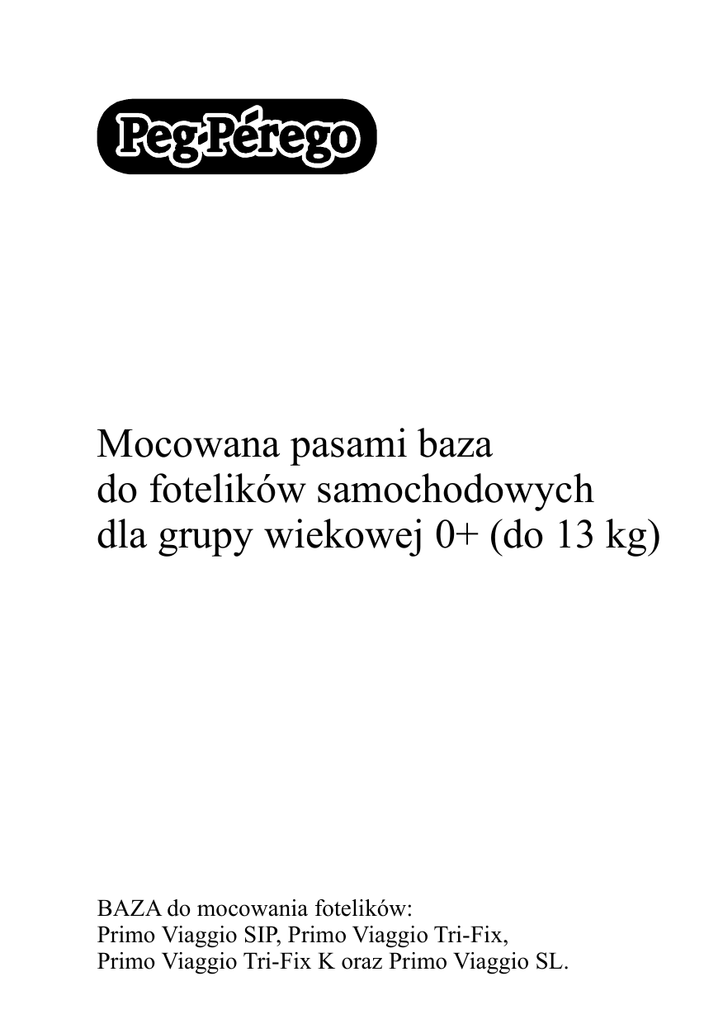 Mocowana pasami baza do fotelików samochodowych dla grupy wiekowej 0+ (do 13 kg) BAZA do mocowania fotelików: Primo Viaggio SIP, Primo Viaggio Tri-Fix, Primo Viaggio Tri-Fix K oraz Primo Viaggio SL. 2 1 1 5 3 4 click 2 3 4 5 6 UWAGA! WAŻNE. ZACHOWAĆ W CELU POWOŁANIA SIĘ W PRZYSZŁOŚCI. Firma Peg Perego posiada certyfikat ISO 9001 Przeczytaj uważnie poniższą instrukcję i zachowaj ją na przyszłość. Przestrzeganie zawartych w niej poleceń i wskazówek zapobiegnie powstaniu niebezpiecznych dla zdrowia i życia dziecka sytuacji. CECHY PRODUKTU - WAŻNE! Baza służy do wpięcia fotelików: Primo Viaggio SIP, Primo Viaggio Tr-Fix, Primo Viaggio Tri-Fix K oraz Primo Viaggio SL. - WAŻNE! Baza z fotelikiem dla grupy wiekowej 0+ (do 13 kg) musi być zamontowana tyłem do kierunku jazdy i na fotelu pozbawionym lub z wyłączoną poduszką powietrzną. Nie montuj jej przodem do kierunku jazdy ani na fotelach usytuowanych bokiem. - Użycie bazy zwiększa bezpieczeństwo oraz ułatwia poprawny montaż fotelika. - Baza jest montowana przy użyciu samochodowych pasów bezpieczeństwa i może pozostać w samochodzie. - Bazę z fotelikiem można zamontować na przednim fotelu pod warunkiem, że zostanie WYŁĄCZONA PODUSZKA POWIETRZNA. Można ją również zamontować na tylnych fotelach. Bazy z fotelikiem nie można przewozić w samochodach wyposażonych jedynie w pas biodrowy lub 2 punktowe pasy bezpieczeństwa. Samochód MUSI BYĆ WYPOSAŻONY W 3-PUNKTOWE PASY BEZPIECZEŃSTWA. - Zastosowanie systemu ganciomatic zapewnia szybki i prosty montaż fotelika zarówno na bazie jak i na wózku Peg Perego. - Fotelik dla grupy wiekowej 0+ przeszedł pozytywnie wszystkie wymagane testy bezpieczeństwa i spełnia wymogi europejskiej normy ECE R44/04 dla dzieci w przedziale wiekowym 0-13 kg. UWAGA - Montażem i obsługą mogą się zajmować jedynie osoby dorosłe. - Nie wkładaj palców w ruchome mechanizmy produktu. - Baza z fotelikiem muszą być zamontowane zawsze tyłem do kierunku jazdy i na fotelu z wyłączoną poduszką powietrzną! Montaż na fotelu z działającą poduszką powietrzną może być przyczyną śmierci lub poważnego uszkodzenia ciała dziecka! - Wyeliminuj zagrożenie uszkodzenia ciała wyłączając poduszkę powietrzną. - W przypadku występowania foteli ruchomych i obrotowych ważne jest, aby bazę z fotelikiem zamontować tyłem do normalnego kierunku jazdy. - Podczas podróży upewniaj się, że w samochodzie nie znajdują się żadne przedmioty, które podczas wypadku mogą się przemieścić i zranić dziecko. - Montując bazę w samochodzie przestrzegaj zaleceń zawartych w instrukcji - stosowanie innych metod montażu może być niebezpieczne. - Baza dla grupy 0+ typ „Universal” dla fotelików samochodowych spełnia wymogi europejskiej normy ECE R44/04 dla dzieci o wadze 0-13 kg. Można ją zainstalować na większości foteli samochodowych ale nie na wszystkich. - Bazę z fotelikiem można poprawnie zamontować w samochodach, których instrukcja obsługi informuje, że są one kompatybilne z systemem „Universal” dla grupy 0+. - Baza jest sklasyfikowana jako „Universal” i spełnia bardziej rygorystyczne wymagania niż wcześniejsze modele bez etykiety poświadczającej homologację. - Baza może być używana w zatwierdzonych samochodach wyposażonych w stałe lub bezwładnościowe 3-punktowe pasy bezpieczeństwa spełniające normy UN/ECE pkt.16. Nie można jej używać w samochodach wyposażonych wyłącznie w pas biodrowy lub 2-punktowy. - Montując bazę z fotelikiem w samochodzie, ZAWSZE przeciągaj naramienną część pasa bezpieczeństwa przez zaczepy w foteliku oznaczone jasnoniebieskim kolorem - inna metoda montażu nie gwarantuje bezpieczeństwa i może nie zapobiec ryzyku zsunięcia się fotelika podczas wypadku. - Zawsze upewniaj się, że 3-punktowe pasy bezpieczeństwa mocujące bazę i fotelik są mocno naciągnięte i nie poskręcane. Pasy bezpieczeństwa należy wymienić na nowe jeśli uległy nadmiernemu naciągnięciu podczas wypadku. - Nie usuwaj naklejek poświadczających zgodność produktu z normami. - Nie używaj bazy jeśli zagubieniu lub uszkodzeniu uległa jakaś jej część, pochodzi z rynku wtórnego lub brała udział w wypadku samochodowym - stanowi to potencjalne zagrożenie dla zdrowia lub życia dziecka. - Nie modyfikuj produktu. - W celu dokonania napraw, zakupu części zamiennych skontaktuj się z serwisem (dane kontaktowe na końcu instrukcji obsługi). - Nie używaj bazy po upłynięciu 5 lat od daty produkcji widniejącej na naklejce - ze względu na naturalne starzenie niektóre jej elementy po upływie tego okresu mogą już nie spełniać wymaganych standardów. INSTRUKCJA OBSŁUGI Umieść bazę na tylnym fotelu tak by rączka do jej przenoszenia opierała się o oparcie fotela. WAŻNE: nigdy nie usuwaj z bazy rączki służącej do jej przenoszenia, jest ona integralną częścią bazy! 1. Przełóż część biodrową pasa przez zaczepy w bazie (strzałka 1) i zepnij go (strzałka 2). Upewnij się, że pas nie jest skręcony. Pociągnij mocno górną część pasa aby jego część przechodząca przez bazę była mocno napięta. 2. Umieść fotelik na bazie tyłem do kierunku jazy! Aby połączyć fotelik z bazą dociskaj go do momentu, aż usłyszysz „kliknięcie”. Umieść dziecko w foteliku pamiętając o przypięciu jego pasami bezpieczeństwa. 3. Chwyć górną część pasa samochodowego i przełóż go za oparcie fotelika. Przełóż pas przez zaczepy w oparciu fotelika (strzałka 4) upewniając się, że nie jest on poskręcany i mocno ciągnij pas w kierunku wskazanym przez strzałkę 5 aby go prawidłowo naciągnąć. 4. Aby wypiąć fotelik z bazy musisz: uwolnić pas z zaczepów w oparciu fotelika. 5. Przesuwaj dźwignię do góry jednocześnie usuwając fotelik z bazy. Gotową do użycia bazę możesz pozostawić w samochodzie. NUMER SERYJNY 6. Na bazie znajduje się naklejka zawieraj