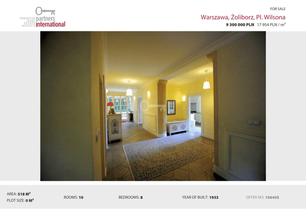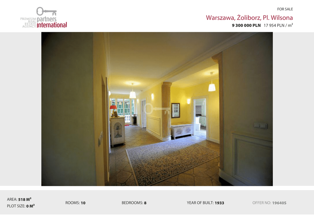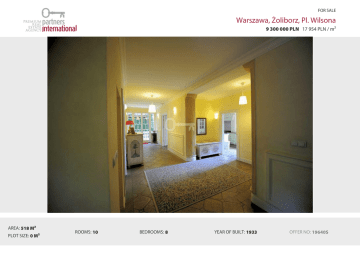FOR SALE Warszawa, Żoliborz, Pl. Wilsona 9 300 000 PLN 17 954 PLN / m² AREA: 518 M² PLOT SIZE: 0 M² ROOMS: 10 BEDROOMS: 8 YEAR OF BUILT: 1933 OFFER NO: 19640S Description BEAUTIFUL HOUSE WITH GARDEN THE OLD Zoliborz !!! DISTRIBUTION and STANDARD: Climate house decorated in a Provencal style. On the ground floor there is: – Spacious living room with fireplace, – Comfortable and functionally designed large kitchen with dining area, – Bathroom, – Hall with access to a small terrace. The living room opens onto a large terrace and descent to the garden. On the first floor there are: – Four large bedrooms (from one door to the terrace) – Bathroom. In the attic there is: – Master bedroom with own bathroom and dressing room, – Office, – And another wardrobe. In the basement there is: – A recreation of a cinema, – Exceptionally large sauna, – Toilet, – Additional bedroom, – Bathroom, – Dry, – A room for the gardener and an additional entrance to the house. Extra large and well-kept garden delights greenness and encouraged to relax … House decorated to a very high standard … prepared by the Owners for themselves. Contact: Edyta 796 004 715 Location Partners International Katarzyna Joanna Czapska Ul. Koszykowa 10/19 00-564 Warszawa tel. (+48 22) 646 52 02 fax: (+48 22) 646 26 99 partnersinternational.pl/en Responsible agent: EDYTA BALCERAK phone: E-mail: [email protected]
