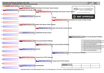 Kumite Individual female U10 +30 POLISH OPEN - X International Karate GRAND PRIX Bielsko-Biała 1 2 4 7 8 1/1 Łobaczewska Klaudia (Dolnośląski Klub Karate Jinkaku Kansei) 3 Reeves Lili-Grayce (Yanagi Kai) 1 Final Łobaczewska Klaudia (Dolnośląski Klub Karate Jinkaku Kansei) 0 5 6 Pool 1 SAMUN OLHA (Ukrainian Karate Federation) 1 Łobaczewska Klaudia (Dolnośląski Klub Karate Jinkaku Kansei) 8 Łobaczewska Klaudia (Dolnośląski Klub Karate Jinkaku Kansei) 6 3 Tatami Pogoda Karolina (Dolnośląski Klub Karate Jinkaku Kansei) 6 Pogoda Karolina (Dolnośląski Klub Karate Jinkaku Kansei) 0 KAWAGUCHI Honoka (HASEGAWA Karate School) 1 Glatzová Barbora (KARATE KLUB SHIHAN POPRAD) 9 10 11 12 Glatzová Barbora (KARATE KLUB SHIHAN POPRAD) 7 15 16 2. Łobaczewska Klaudia (Dolnośląski Klub Karate Jin Glatzová Barbora (KARATE KLUB SHIHAN POPRAD) 10 3. Madej Anna (SSiR ARAWASHI) 3. Pogoda Karolina (Dolnośląski Klub Karate Jinkaku 5. Dynia Celina (Shotokan Karate Klub ATTFIS Ostra 5. SAMUN OLHA (Ukrainian Karate Federation) Madej Anna (SSiR ARAWASHI) 1 7. Reeves Lili-Grayce (Yanagi Kai) Glatzová Barbora (KARATE KLUB SHIHAN POPRAD) 0 13 14 1. Glatzová Barbora (KARATE KLUB SHIHAN POPR Dynia Celina (Shotokan Karate Klub ATTFIS Ostrava) 9 Dynia Celina (Shotokan Karate Klub ATTFIS Ostrava) 0 Zielińska Zuzanna (SSiR ARAWASHI) 1 Referees: (c)sportdata GmbH & Co KG 2000-2016(2016-10-09 17:12) -WKF Approved- v 9.0.5 build 1 License: KSA Atemi POL (expire 2016-10-14) Kumite Individual female U10 - 30 POLISH OPEN - X International Karate GRAND PRIX Bielsko-Biała 1 2 3 4 5 6 7 8 9 10 11 12 13 14 15 16 17 18 19 20 21 22 23 24 25 26 27 28 29 30 31 32 Tatami Pool 2 1/1 Jalowiczorová Veronika (KARATE KLUB SHIHAN POPRAD) Jalowiczorová Veronika (KARATE KLUB SHIHAN POPRAD) Psiuk Maja (Sopocki Klub Karate Randori) 8 Jalowiczorová Veronika (KARATE KLUB SHIHAN POPRAD) 0 Baldowska Daria (Bialostocki Klub Karate) 0 Jalowiczorová Veronika (KARATE KLUB SHIHAN POPRAD) 3 Kotlicka Nina (Sopocki Klub Karate Randori) 4 Kotlicka Nina (Sopocki Klub Karate Randori) 0 Jędrzejczak Hanna (Klub Sportowy Olimp Łódź) 0 Antonelli Thyis (Malta Karate Federation) Antonelli Thyis (Malta Karate Federation) Ignasiak Nadia (STOWARZYSZENIE SPORTOWE YAMABUSHI BYDGOSZCZ) 4 Antonelli Thyis (Malta Karate Federation) 4 Studnicka Zuzanna (SSiR ARAWASHI) 0 Final Jalowiczorová Veronika (KARATE KLUB SHIHAN POPRAD 0 Antonelli Thyis (Malta Karate Federation) 1 Kopciuch Maja (Dolnośląski Klub Karate Jinkaku Kansei) 0 Piór Maja (Klub Sportowy Karate SAKURA) 0 Piór Maja (Klub Sportowy Karate SAKURA) Jalowiczorová Veronika (KAR 2 Blizmanová Denisa (Katsudo Sabinov) Blizmanová Denisa (Katsudo Sabinov) Garbacz Amelia (SSiR ARAWASHI) 6 Blizmanová Denisa (Katsudo Sabinov) 2 Moś Zofia (Klub Karate Kaminari Perzów) 0 1. Jalowiczorová Veronika (KARATE KLUB SHIHAN 2. Zacharová Ema (KARATE KLUB SHIHAN POPRA 3. Antonelli Thyis (Malta Karate Federation) Blizmanová Denisa (Katsudo Sabinov) 0 Schreiber Natalia (Klub Sportowy Olimp Łódź) 1 Schreiber Natalia (Klub Sportowy Olimp Łódź) 0 DYBA ELVIRA (Ukrainian Karate Federation) 0 Leśniewska Maja (STOWARZYSZENIE SPORTOWE YAMABUSHI BYDGOSZCZ) RATAL ARINA (Unmei) 3. Blizmanová Denisa (Katsudo Sabinov) 5. Kotlicka Nina (Sopocki Klub Karate Randori) 5. RATAL ARINA (Unmei) 7. Baldowska Daria (Bialostocki Klub Karate) 7. Caruana Francesca (Malta Karate Federation) Zacharová Ema (KARATE KLUB SHIHAN POPRAD) 0 RATAL ARINA (Unmei) 1 Zacharová Ema (KARATE KLUB SHIHAN POPRAD) 0 Zacharová Ema (KARATE KLUB SHIHAN POPRAD) 2 Zacharová Ema (KARATE KLUB SHIHAN POPRAD) Referees: 1 Caruana Francesca (Malta Karate Federation) 0 (c)sportdata GmbH & Co KG 2000-2016(2016-10-09 17:12) -WKF Approved- v 9.0.5 build 1 License: KSA Atemi POL (expire 2016-10-14) Kumite Individual female U12 +40 POLISH OPEN - X International Karate GRAND PRIX Bielsko-Biała 1 2 4 6 BILOKOPYTA YANA (Ukrainian Karate Federation) 1 BILOKOPYTA YANA (Ukrainian Karate Federation) 0 Borysiak Emilia (Klub Karate Kamikaze) Gahírová Ivana (MŠK Žiar nad Hronom) 0 Gatt Alexandra (Malta Karate Federation) 0 Gatt Alexandra (Malta Karate Federation) 8 Final Olsen Nicoline (Ishoej Karate Klub) 0 Olsen Nicoline (Ishoej Karate Klub) 2 2 7 Andrukiewicz Nina (Sopocki Klub Karate Randori) 0 Olsen Nicoline (Ishoej Karate Klub) 2 Olsen Nicoline (Ishoej Karate Klub) 5 9 10 Hóková Ella (KK Farmex Nitra) POOLE EILIDH (JKS SCOTLAND) 2 POOLE EILIDH (JKS SCOTLAND) 1 Mielczarek Natalia (SSiR ARAWASHI) 1 Pápištová Ema (KK Ekonóm Trenčín) 12 Pápištová Ema (KK Ekonóm Trenčín) 3 Sawinska Witkoria (SSiR ARAWASHI) 14 15 16 2. Olsen Nicoline (Ishoej Karate Klub) 3. Pápištová Ema (KK Ekonóm Trenčín) 3. Andrukiewicz Nina (Sopocki Klub Karate Randori) 5. Mielczarek Julia (SSiR ARAWASHI) Mielczarek Julia (SSiR ARAWASHI) 2 Mielczarek Julia (SSiR ARAWASHI) 1 Pedersen Emma (Budo sportskarate Ishøj) 0 1. Hóková Ella (KK Farmex Nitra) Pápištová Ema (KK Ekonóm Trenčín) 0 11 13 1/1 Cvetkova Anastasija (Samuraji) 1 0 5 Pool 4 Cvetkova Anastasija (Samuraji) 3 Cvetkova Anastasija (Samuraji) 0 Bartodziej Julia (Klub Karate Nidan) 0 3 Tatami 5. Cvetkova Anastasija (Samuraji) 7. Gatt Alexandra (Malta Karate Federation) Hóková Ella (KK Farmex Nitra) 2 Hóková Ella (KK Farmex Nitra) 5 Hóková Ella (KK Farmex Nitra) 2 Referees: (c)sportdata GmbH & Co KG 2000-2016(2016-10-09 17:12) -WKF Approved- v 9.0.5 build 1 License: KSA Atemi POL (expire 2016-10-14) Kumite Individual female U12 -34 POLISH OPEN - X International Karate GRAND PRIX Bielsko-Biała 1 2 3 4 5 6 7 8 9 10 11 12 13 14 15 16 17 18 19 20 21 22 23 24 25 26 27 28 29 30 31 32 Tatami Pool 2 1/1 RATAL ARINA (Unmei) Kalamarová Alexandra (MŠK Žiar nad Hronom) 0 Kalamarová Alexandra (MŠK Žiar nad Hronom) 1 Kalamarová Alexandra (MŠK Žiar nad Hronom) 2 Gorska Aleksandra (Klub Sportowy GOKKEN) 0 Černáková Bibiana (MŠK Žiar nad Hronom) Kalamarová Alexandra (MŠK Žiar nad Hronom) 0 Dz