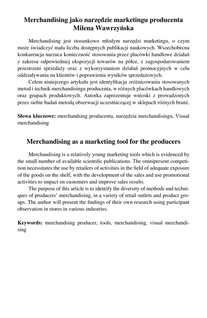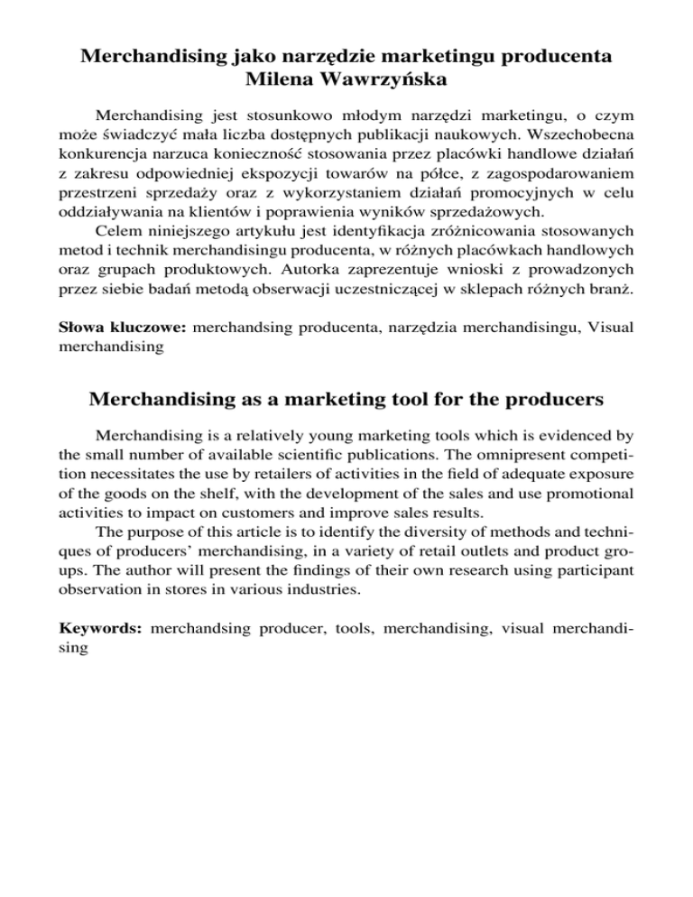 Merchandising jako narzędzie marketingu producenta Milena Wawrzyńska Merchandising jest stosunkowo młodym narzędzi marketingu, o czym może świadczyć mała liczba dostępnych publikacji naukowych. Wszechobecna konkurencja narzuca konieczność stosowania przez placówki handlowe działań z zakresu odpowiedniej ekspozycji towarów na półce, z zagospodarowaniem przestrzeni sprzedaży oraz z wykorzystaniem działań promocyjnych w celu oddziaływania na klientów i poprawienia wyników sprzedażowych. Celem niniejszego artykułu jest identyfikacja zróżnicowania stosowanych metod i technik merchandisingu producenta, w różnych placówkach handlowych oraz grupach produktowych. Autorka zaprezentuje wnioski z prowadzonych przez siebie badań metodą obserwacji uczestniczącej w sklepach różnych branż. Słowa kluczowe: merchandsing producenta, narzędzia merchandisingu, Visual merchandising Merchandising as a marketing tool for the producers Merchandising is a relatively young marketing tools which is evidenced by the small number of available scientific publications. The omnipresent competition necessitates the use by retailers of activities in the field of adequate exposure of the goods on the shelf, with the development of the sales and use promotional activities to impact on customers and improve sales results. The purpose of this article is to identify the diversity of methods and techniques of producers’ merchandising, in a variety of retail outlets and product groups. The author will present the findings of their own research using participant observation in stores in various industries. Keywords: merchandsing producer, tools, merchandising, visual merchandising