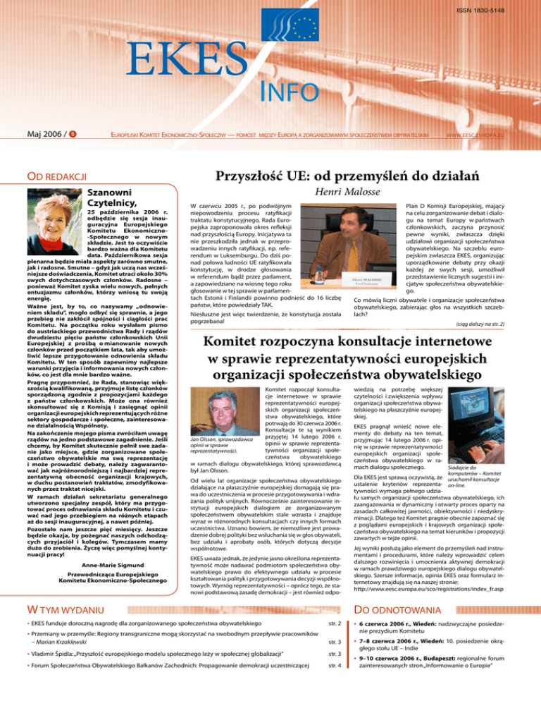 ISSN 1830-5148 EKES Maj 2006 / 5 Europejski Komitet Ekonomiczno-Społeczny — pomost INFO między Europą a zorganizowanym społeczeństwem obywatelskim www.eesc.europa.eu Przyszłość UE: od przemyśleń do działań OD REDAKCJI Szanowni Czytelnicy, 25 października 2006 r. odbędzie się sesja inauguracyjna Europejskiego Komitetu Ekonomiczno-Społecznego w nowym składzie. Jest to oczywiście bardzo ważna dla Komitetu data. Październikowa sesja plenarna będzie miała aspekty zarówno smutne, jak i radosne. Smutne – gdyż jak uczą nas wcześniejsze doświadczenia, Komitet utraci około 30% swych dotychczasowych członków. Radosne – ponieważ Komitet zyska wielu nowych, pełnych entuzjazmu członków, którzy wniosą tu swoją energię. Ważne jest, by to, co nazywamy „odnowieniem składu”, mogło odbyć się sprawnie, a jego przebieg nie zakłócił spójności i ciągłości prac Komitetu. Na początku roku wysłałam pismo do austriackiego przewodnictwa Rady i rządów dwudziestu pięciu państw członkowskich Unii Europejskiej z prośbą o mianowanie nowych członków przed początkiem lata, tak aby umożliwić lepsze przygotowanie odnowienia składu Komitetu. W ten sposób zapewnimy najlepsze warunki przyjęcia i informowania nowych członków, co jest dla mnie bardzo ważne. Pragnę przypomnieć, że Rada, stanowiąc większością kwalifikowaną, przyjmuje listę członków sporządzoną zgodnie z propozycjami każdego z państw członkowskich. Może ona również skonsultować się z Komisją i zasięgnąć opinii organizacji europejskich reprezentujących różne sektory gospodarcze i społeczne, zainteresowane działalnością Wspólnoty. Na zakończenie mojego pisma zwróciłam uwagę rządów na jedno podstawowe zagadnienie. Jeśli chcemy, by Komitet skutecznie pełnił swe zadanie jako miejsce, gdzie zorganizowane społeczeństwo obywatelskie ma swą reprezentację i może prowadzić debaty, należy zagwarantować jak najróżnorodniejszą i najbardziej reprezentatywną obecność organizacji krajowych, w duchu postanowień traktatów, zmodyfikowanych przez traktat nicejski. W ramach działań sekretariatu generalnego utworzono specjalny zespół, który ma przygotować proces odnawiania składu Komitetu i czuwać nad jego przebiegiem na różnych etapach aż do sesji inauguracyjnej, a nawet później. Pozostało nam jeszcze pięć miesięcy. Jeszcze będzie okazja, by pożegnać naszych odchodzących przyjaciół i kolegów. Tymczasem mamy dużo do zrobienia. Życzę więc pomyślnej kontynuacji pracy! Anne-Marie Sigmund Przewodnicząca Europejskiego Komitetu Ekonomiczno-Społecznego Henri Malosse W czerwcu 2005 r., po podwójnym niepowodzeniu procesu ratyfikacji traktatu konstytucyjnego, Rada Europejska zaproponowała okres refleksji nad przyszłością Europy. Inicjatywa ta nie przeszkodziła jednak w przeprowadzeniu innych ratyfikacji, np. referendum w Luksemburgu. Do dziś ponad połowa ludności UE ratyfikowała konstytucję, w drodze głosowania w referendum bądź przez parlament, a zapowiedziane na wiosnę tego roku głosowanie w tej sprawie w parlamentach Estonii i Finlandii powinno podnieść do 16 liczbę państw, które powiedziały TAK. Niesłuszne jest więc twierdzenie, że konstytucja została pogrzebana! Plan D Komisji Europejskiej, mający na celu zorganizowanie debat i dialogu na temat Europy w państwach członkowskich, zaczyna przynosić pewne wyniki, zwłaszcza dzięki udziałowi organizacji społeczeństwa obywatelskiego. Na szczeblu europejskim zwłaszcza EKES, organizując uporządkowane debaty przy okazji każdej ze swych sesji, umożliwił przedstawienie licznych sugestii i inicjatyw społeczeństwa obywatelskiego. Co mówią liczni obywatele i organizacje społeczeństwa obywatelskiego, zabierając głos na wszystkich szczeblach? (ciąg dalszy na str. 2) Komitet rozpoczyna konsultacje internetowe w sprawie reprezentatywności europejskich organizacji społeczeństwa obywatelskiego Komitet rozpoczął konsultacje internetowe w sprawie reprezentatywności europejskich organizacji społeczeństwa obywatelskiego, które potrwają do 30 czerwca 2006 r. Konsultacje te są wynikiem przyjętej 14 lutego 2006 r. Jan Olsson, sprawozdawca opinii w sprawie reprezentaopinii w sprawie tywności organizacji społereprezentatywności. czeństwa obywatelskiego w ramach dialogu obywatelskiego, której sprawozdawcą był Jan Olsson. Od wielu lat organizacje społeczeństwa obywatelskiego działające na płaszczyźnie europejskiej domagają się prawa do uczestniczenia w procesie przygotowywania i wdrażania polityk unijnych. Równocześnie zainteresowanie instytucji europejskich dialogiem ze zorganizowanym społeczeństwem obywatelskim stale wzrasta i znajduje wyraz w różnorodnych konsultacjach czy innych formach uczestnictwa. Uznano bowiem, że niemożliwe jest prowadzenie dobrej polityki bez wsłuchania się w głos obywateli, bez udziału i aprobaty osób, których dotyczą decyzje wspólnotowe. EKES uważa jednak, że jedynie jasno określona reprezentatywność może nadawać podmiotom społeczeństwa obywatelskiego prawo do efektywnego udziału w procesie kształtowania polityk i przygotowywania decyzji wspólnotowych. Wymóg reprezentatywności – oprócz tego, że stanowi podstawową zasadę demokracji – jest również odpo- W TYM WYDANIU • EKES funduje doroczną nagrodę dla zorganizowanego społeczeństwa obywatelskiego • Przemiany w przemyśle: Regiony transgraniczne mogą skorzystać na swobodnym przepływie pracowników wiedzią na potrzebę większej czytelności i zwiększenia wpływu organizacji społeczeństwa obywatelskiego na płaszczyźnie europejskiej. EKES pragnął wnieść nowe elementy do debaty na ten temat, przyjmując 14 lutego 2006 r. opinię w sprawie reprezentatywności europejskich organizacji społeczeństwa obywatelskiego w ramach dialogu społecznego. Siadajcie do komputerów – Komitet Dla EKES jest spra