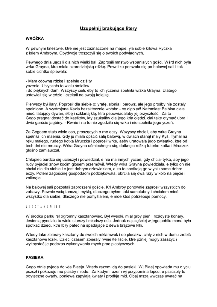 Uzupełnij brakujące litery WRÓŻKA W pewnym krlestwie, ktre nie jest zaznaczone na mapie, yła sobie krlowa Ryczka z krlem Ambroym. Obydwoje troszczyli się o swoich podwładnych. Pewnego dnia uądzili dla nich wielki bal. Zaprosili mnstwo wspaniałych gości. Wśrd nich była wrka Grayna, ktra miała czarodziejską rdżkę. Powoltku porszała się po balowej sali i tak sobie cichtko śpiewała: - Mam cdowną rdżkę i spełnię dziś ty yczenia. Usłyszało to wielu śmiałkw i do pięknych dam. Wszyscy cieli, eby to ich yczenia spełniła wrżka Grayna. Dlatego ustawiali się w ędzie i czekali na swoją kolejkę. Pierwszy był ilary. Poprosił dla siebie o: yrafę, słonia i parowz, ale jego prośby nie zostały spełnione. A wystrojona Kazia bezsktecznie wołała: - cę dłgo yć! Natomiast Balbina ciała mieć: latający dywan, słbę i szklaną klę, ktra pepowiadałaby jej przyszłość. Za to Gego pragnął dostać do kaełków, kty szukaliby dla jego krla ołędzi. ciał take otymać ubra i dwie garście jaębiny. - Rwnie i na to nie zgodziła się wrka i nie spełniła jego yczeń. Za Gegoem stało wiele osb, proszących o rne eczy. Wszyscy chcieli, eby wrka Grayna spełniła ich maenia. Gdy ju miała opścić salę balową, w dwiach stanął mały Kyś. Tymał na ręku małego, rudego kotka Mruczka i poprosił wrkę, aeby uratowała jego zwieątko, ktre od tech dni nie mruczy. Wrka Grayna uśmiechnęła się, dotknęła rdżką futerko kotka i Mruczek głośno zamiauczał. Chłopiec bardzo się ucieszył i powiedział, e nie ma innych yczeń, gdy chciał tylko, aby jego rudy pyjaciel znów kocim głosem przemówił. Wtedy wrka Grayna powiedziała, e tylko on nie chciał nic dla siebie i e jest dobrym człowiekiem, a za to spotkają go w yciu same dobre eczy. Potem zagościnę gospodaom podziękowała, obrciła się dwa razy w koło na pięcie i zniknęła. Na balowej sali pozostali zaproszeni goście. Krl Ambroy ponownie zaprosił wszystkich do zabawy. Pewnie wcią tańczą i myślą, dlaczego byłem taki samolubny i chciałem mieć wszystko dla siebie, dlaczego nie pomyślałem, e moe ktoś potrzebuje pomocy. KASZTANOWIEC W środku parku rsł ogromny kasztanowiec. Był wysoki, miał grby pień i rozłoyste konary. Jesienią pyodziło tu wiele starszy i młodszy osb. Jednak najczęściej w jego pobliu mona było spotkać dzieci, ktre lbiły pateć na spadające z dewa brązowe klki. Wtedy take zbierały kasztany do swoich reklamwek i do plecakw. ciały z nich w domu zrobić kasztanowe ldziki. Dzieci czasem zbierały rwnie łte liście, ktre pźniej mogły zasszyć i wykoystać je podczas wykonywania rnych prac plastycznych. PASIEKA Gego ętnie pyjeda do wja Błaeja. Wtedy razem idą do pasieki. Wj Błaej opowiada mu o yciu pszczł i pokazuje mu plastry miodu. Za kadym razem wj przypomina łopcu, e pszczoły to poyteczne owady, poniewa zapylają kwiaty i prodkją mid. Obaj mszą wwczas uwaać na bęczące pszczoły, ktre mogą ich uądlić. Wj Błaej artuje sobie, e pszczoły, to jego przyjaciłki, ktre go nigdy nie opszczą, gdy ju razem się zyli. Natomiast ona wjka mwi, e jej mą jest pracowity jak pszczłka. W KSIĘGARNI Wczoraj byliśmy na wycieczce w księgarni. Poznaliśmy pracę księgaa. Pan Ambroy opowiadał nam o swojej pracy i pokazał nam poszczeglne działy tematyczne. Nas jednak najbardziej interesowały ksiąki przygodowe i podrnicze. Mogliśmy pooglądać ilstracje. Natomiast pan Ambroy peczytał nam fragmenty "Pypadkw Robinsona Cruzoe", "W pstyni i w pszczy" oraz "Podre Gliwera". Niekty z nas od razu zrobili sobie zakpy. Grayna kpiła baśnie Andersena i "Dzieci z Bullerbyn" Astrid Lindgren, a Maena kpiła wiersze Jana Bechwy. SŁOTA Katayna, gdy się obdziła, to szybko wstała z łka. Podeszła do okna. Odyliła firankę i westnęła. - O, jaka bydka dziś pogoda! Słońce za mry się skryło. Wszędzie się zamyło. Ciągle pada deszcz. Na dwoe jest szaro i smtno. Ja dziś nie idę do szkoły i nie mogę bawić się z pyjaciłmi na podwrku. Moe poczytam sobie bajeczkę o księniczce albo jakąś ksiąkę o podrach. Poproszę te rodzicw, ebyśmy pojeali do dziadkw. PORZĄDKI Wczoraj Ra i aneta postanowiły, e zrobią rodzicom niespodziankę. Dlatego dzisiaj ju od rana zaczęły spątać w swoim pokoju. Najpierw podlały kwiaty, a potem starły k z parapetu. Następnie zdjęły na dywan wszystkie ksiąki i lalki z płek. Ra szybko starła stamtąd k. Natomiast aneta zaczęła u gry ustawiać ksiąki przygodowe i podrnicze. Za to niej połoyła bajki, baśnie i legendy. W tym czasie Ra zastanawiała się, gdzie umieszczą swoje lalki. Pewnie myślałaby dłgo, gdyby nie pomoc Jeyka. łopiec zaproponował im, eby lalki zaniosły do jego pokoju, gdzie j zbdował dla nich domek z klockw z garaem. Obie dziewczynki ucieszyły się z propozycji brata, gdy wszyscy będą mogli bawić się w jednym miejscu. Dlatego Ra peniosła lalki do pokoju Jrka. Natomiast aneta pyniosła odkacz i zaczęła odkać dywan. Gdy dziewczynki skończyły poądki, wtajemniczyły w swj plan brata, ktry pomgł im przygotować dla rodziców niespodziankę. Razem pokroili umyte owoce na cząstki i włoyli je do dej salaterki. Wszyscy ucieszyli się, e gdy wrcą do domu rodzice, to zobaczą, i sami zrobili sałatkę wieloowocową. DRZEWA W pydronym lesie są rne dewa liściaste i iglaste. Py drodze rosną w ędzie jaębiny. Za nimi jest pas dębw, pod ktrymi jesienią mona zbierać brązowe ołędzie. Gdzieniegdzie rosną take młode bki i olchy oraz wysokie bozy. Na skraju lasu, od strony pola, widać rozłoyste sosny oraz modewie, ktre zcają na zimę szpilki. Wszystkie dewa w lesie zatymują rne zanieczyszczenia i prodkją tlen potebny ldziom i zwieętom do oddyania. Są rwnie sronieniem dla ptakw, ktre wśrd gałęzi wiją sobie gniazda. PRZYSMAKI WIEWIÓRKI Na naszym placu zabaw są dwie rde wiewirki. Jedna szybko skacze z gałązki na gałązkę. Ciągle coś znosi do swojej dzipli. A