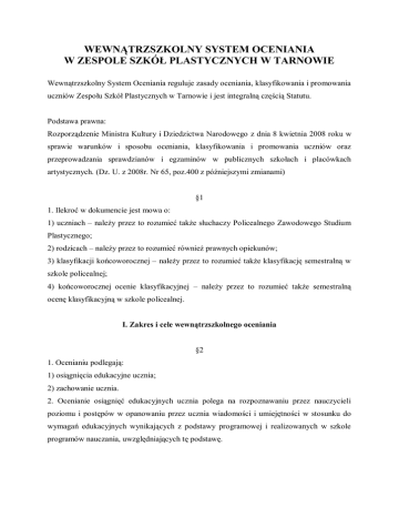 WEWNĄTRZSZKOLNY SYSTEM OCENIANIA W ZESPOLE SZKÓŁ PLASTYCZNYCH W TARNOWIE Wewnątrzszkolny System Oceniania reguluje zasady oceniania, klasyfikowania i promowania uczniów Zespołu Szkół Plastycznych w Tarnowie i jest integralną częścią Statutu. Podstawa prawna: Rozporządzenie Ministra Kultury i Dziedzictwa Narodowego z dnia 8 kwietnia 2008 roku w sprawie warunków i sposobu oceniania, klasyfikowania i promowania uczniów oraz przeprowadzania sprawdzianów i egzaminów w publicznych szkołach i placówkach artystycznych. (Dz. U. z 2008r. Nr 65, poz.400 z późniejszymi zmianami) §1 1. Ilekroć w dokumencie jest mowa o: 1) uczniach – należy przez to rozumieć także słuchaczy Policealnego Zawodowego Studium Plastycznego; 2) rodzicach – należy przez to rozumieć również prawnych opiekunów; 3) klasyfikacji końcoworocznej – należy przez to rozumieć także klasyfikację semestralną w szkole policealnej; 4) końcoworocznej ocenie klasyfikacyjnej – należy przez to rozumieć także semestralną ocenę klasyfikacyjną w szkole policealnej. I. Zakres i cele wewnątrzszkolnego oceniania §2 1. Ocenianiu podlegają: 1) osiągnięcia edukacyjne ucznia; 2) zachowanie ucznia. 2. Ocenianie osiągnięć edukacyjnych ucznia polega na rozpoznawaniu przez nauczycieli poziomu i postępów w opanowaniu przez ucznia wiadomości i umiejętności w stosunku do wymagań edukacyjnych wynikających z podstawy programowej i realizowanych w szkole programów nauczania, uwzględniających tę podstawę. 3. Ocenianie zachowania ucznia polega na rozpoznawaniu przez wychowawcę klasy, nauczycieli oraz uczniów danej klasy, stopnia respektowania przez ucznia zasad współżycia społecznego i norm etycznych oraz obowiązków ucznia określonych w statucie szkoły. §3 1. Ocenianie wewnątrzszkolne ma celu: 1) poinformowanie ucznia o poziomie jego osiągnięć edukacyjnych i jego zachowaniu oraz postępach w tym zakresie; 2) pomoc uczniowi w samodzielnym planowaniu swojego rozwoju; 3) motywowanie ucznia do dalszej pracy; 4) dostarczanie rodzicom (prawnym opiekunom) i nauczycielom informacji o postępach, trudnościach w uczeniu się oraz uzdolnieniach uczniów; 5) umożliwienie nauczycielom doskonalenia organizacji i metod pracy dydaktycznowychowawczej. 2. Ocenianie wewnątrzszkolne obejmuje: 1) formułowanie przez nauczycieli wymagań edukacyjnych niezbędnych do uzyskania poszczególnych śródrocznych i końcoworocznych (semestralnych) ocen klasyfikacyjnych z obowiązkowych i nadobowiązkowych zajęć edukacyjnych; 2) ustalanie kryteriów oceniania zachowania; 3) informowanie rodziców i uczniów o wymaganiach edukacyjnych; 4) ocenianie bieżące i ustalanie śródrocznych ocen klasyfikacyjnych z obowiązkowych i nadobowiązkowych zajęć edukacyjnych oraz śródrocznej oceny klasyfikacyjnej zachowania; 5) przeprowadzanie egzaminów klasyfikacyjnych i poprawkowych; 6) ustalanie końcoworocznych (semestralnych) ocen klasyfikacyjnych z obowiązkowych i nadobowiązkowych zajęć edukacyjnych oraz końcoworocznej oceny klasyfikacyjnej zachowania; 7) ustalanie warunków i trybu uzyskania wyższych niż przewidywane końcoworocznych (semestralnych) ocen klasyfikacyjnych z obowiązkowych i nadobowiązkowych zajęć edukacyjnych, oraz końcoworocznej oceny klasyfikacyjnej zachowania; 8) ustalanie trybu i warunków odwoływania się od ocen klasyfikacyjnych i zachowania na koniec roku; 9) ustalenie warunków i sposobu przekazywania rodzicom (prawnym opiekunom) informacji o postępach i trudnościach ucznia w nauce. §4 Zadania i obowiązki nauczycieli w zakresie oceniania 1. Nauczyciele na początku każdego roku szkolnego informują uczniów oraz rodziców: 1) o wymaganiach edukacyjnych niezbędnych do uzyskania poszczególnych śródrocznych i końcoworocznych (semestralnych) ocen klasyfikacyjnych z obowiązkowych i nadobowiązkowych zajęć edukacyjnych, wynikających z realizowanego przez siebie programu nauczania; 2) o sposobach sprawdzania osiągnięć edukacyjnych uczniów; 3) o warunkach i trybie uzyskania wyższej niż przewidywana końcoworocznej (semestralnej) oceny klasyfikacyjnej z obowiązkowych i nadobowiązkowych zajęć edukacyjnych. 2. Wychowawcy na początku roku szkolnego informują uczniów i ich rodziców: 1) o warunkach i sposobie oraz kryteriach oceniania zachowania; 2) o warunkach i trybie uzyskania wyższej niż przewidywana końcoworocznej oceny klasyfikacyjnej zachowania; 3) o skutkach ustalenia nagannej końcoworocznej oceny klasyfikacyjnej zachowania. §5 Zadania i obowiązki uczniów oraz ich rodziców (prawnych opiekunów) w zakresie oceniania 1. Do zadań i obowiązków ucznia w zakresie oceniania należy w szczególności: 1) systematyczne przygotowywanie się do zajęć; 2) systematyczne i aktywne uczestniczenie w zajęciach edukacyjnych; 3) pisanie wszystkich prac kontrolnych; 4) wykonywanie wszystkich zadań programowych w zakresie przedmiotów artystycznych; 5) usprawiedliwianie nieobecności na zajęciach w terminie do 1 tygodnia; 6) aktywne uczestniczenie w różnych formach działalności szkoły; 7) przestrzeganie zasad kultury współżycia wobec nauczycieli, innych pracowników szkoły oraz uczniów; 8) przestrzeganie zapisów w statucie i regulaminów szkolnych. 2. Do zadań i obowiązków rodziców należy w szczególności uczestniczenie we wszystkich spotkaniach organizowanych przez szkołę. Jeżeli obecność nie jest możliwa, obowiązkiem rodziców jest osobiste skontaktowanie się z wychowawcą lub dyrekcją szkoły w tygodniu następującym po terminie spotkania. II. Formy i sposób oceniania §6 Wymagania edukacyjne i kryteria ocen 1. Wymagania edukacyjne są to zamierzone osiągnięcia i kompetencje uczniów na poszczególnych etapach kształcenia w zakresie wiadomości, umiejętności i postaw uczniów. Określają, co uczeń powinien wiedzieć, rozumieć i umieć w trakcie oraz po zakończeniu procesu nauczania. 2. Wymagania edukacyjne opracow